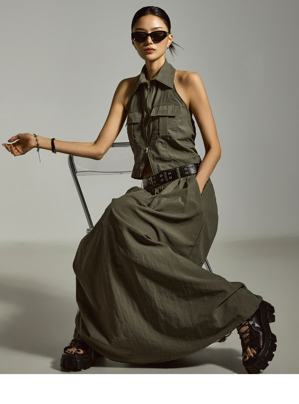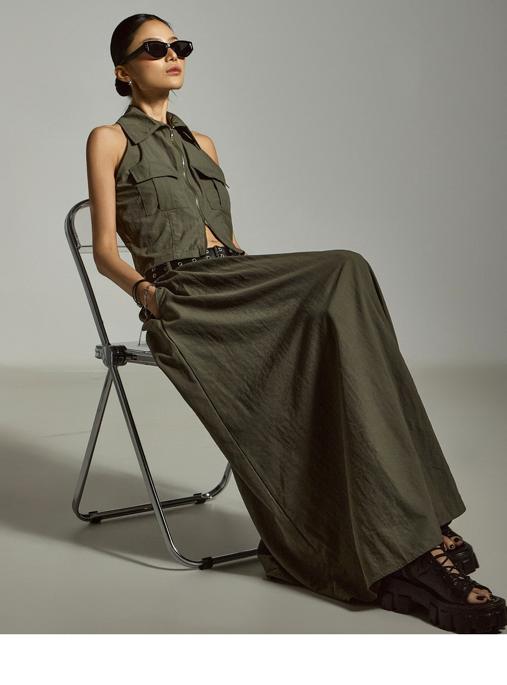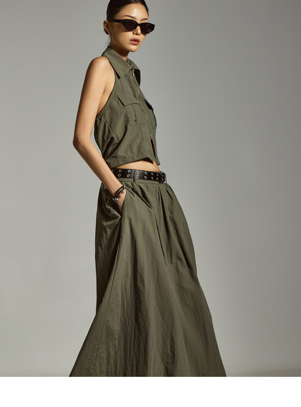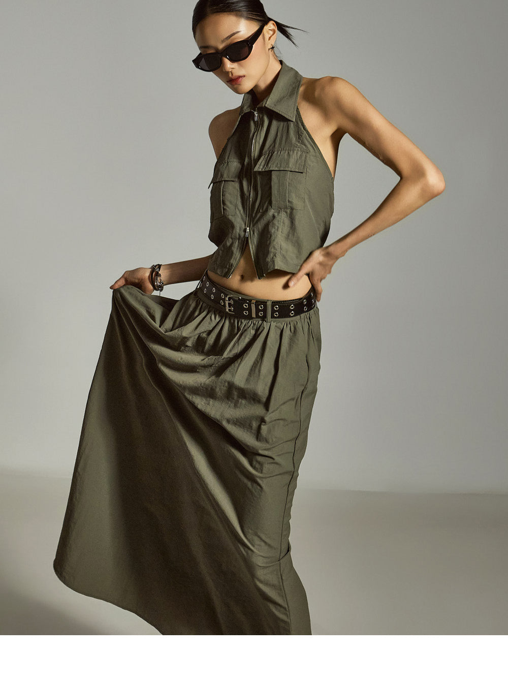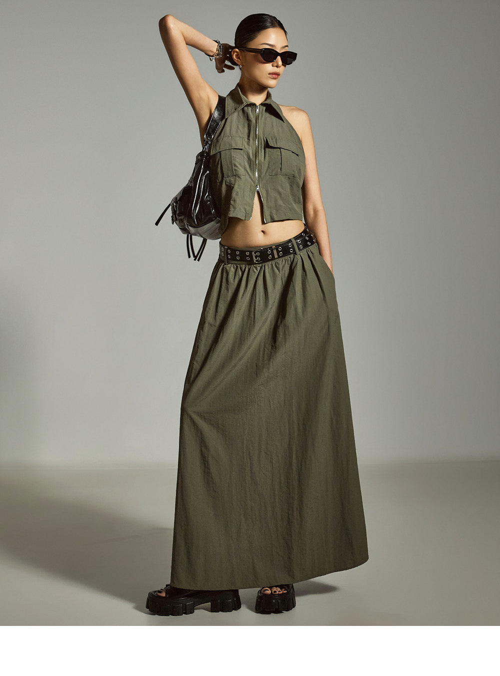 裙子采用 A 字形长款廓形,自然展开,