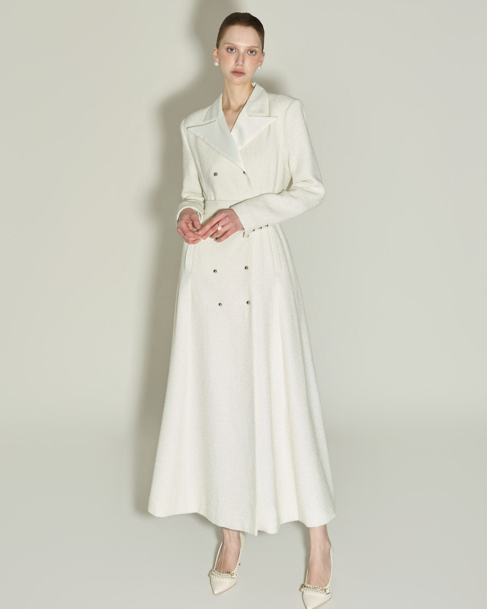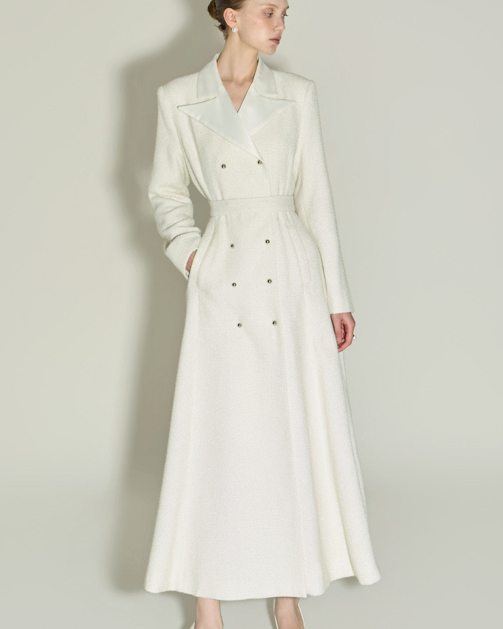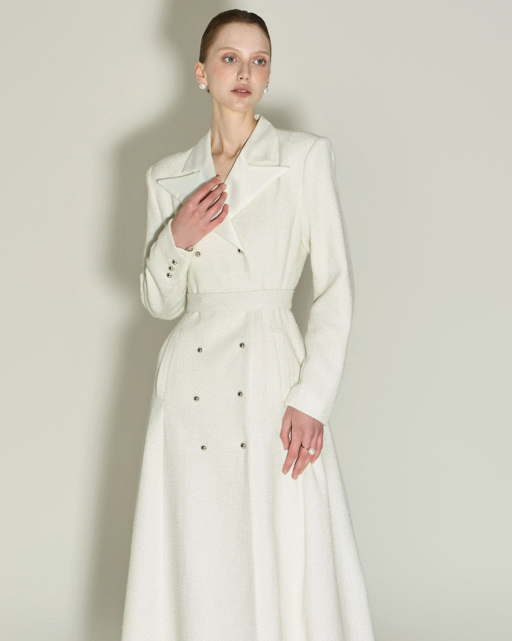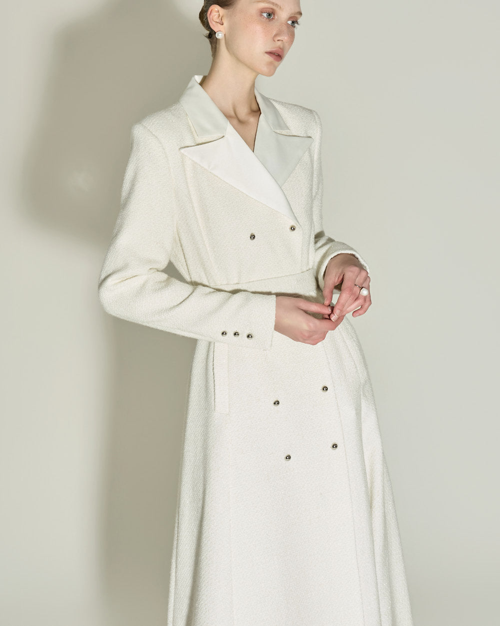 and the tailored collar and double-button front detailing