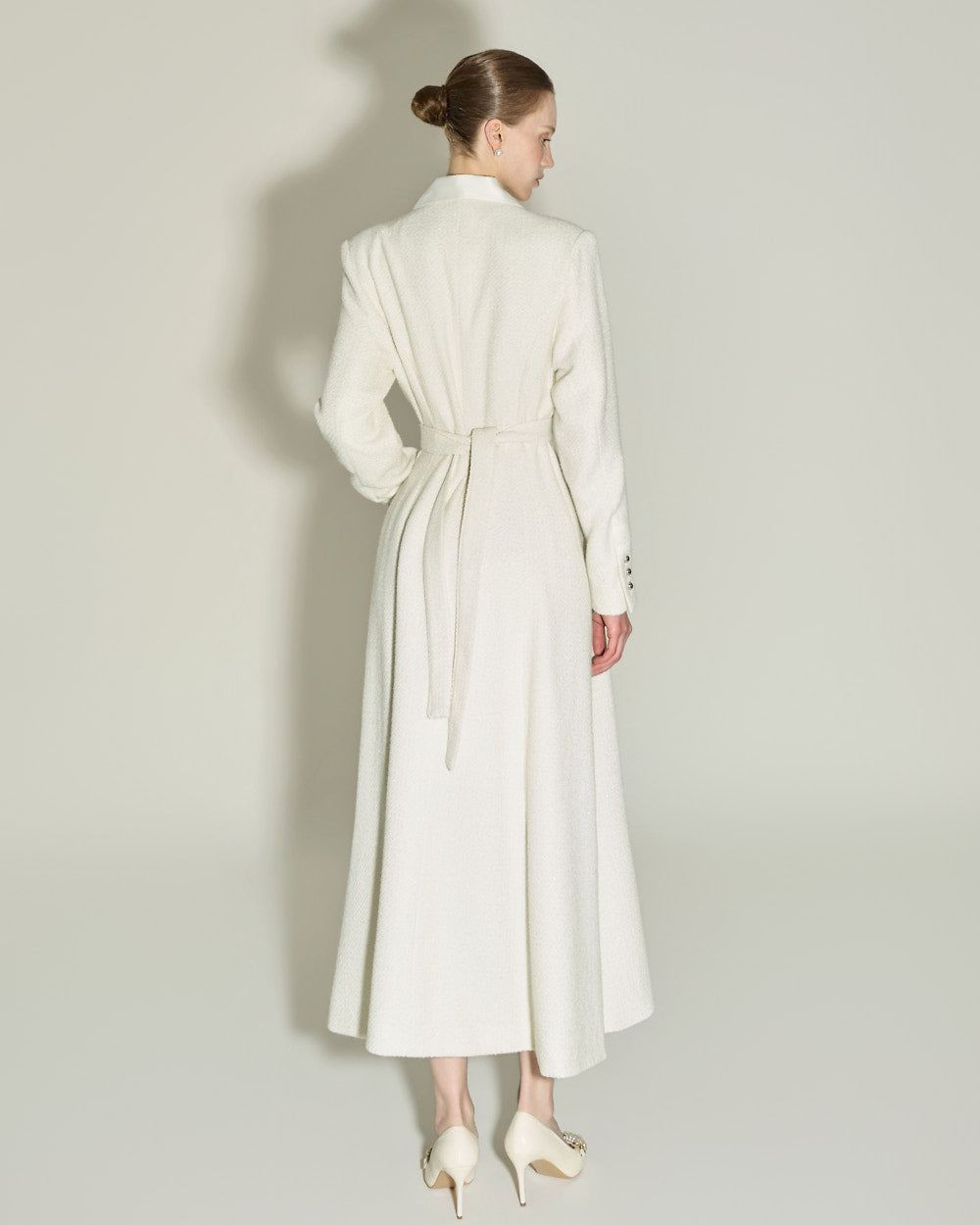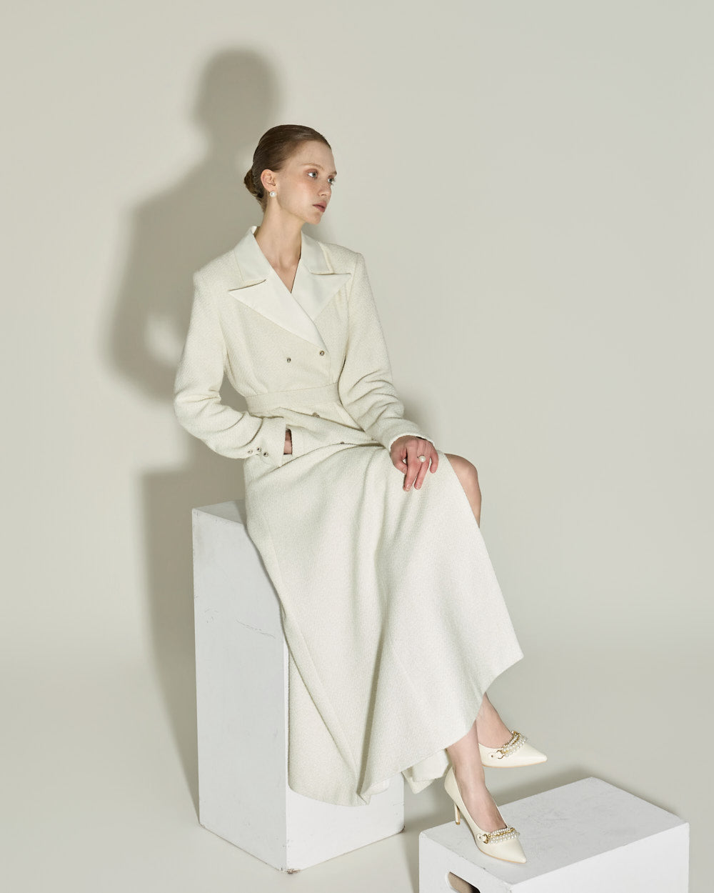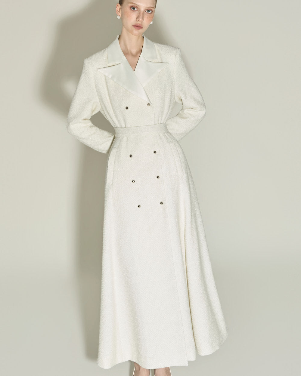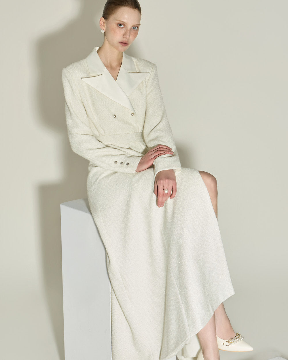 The 174cm model is wearing size ONE in IVORY.