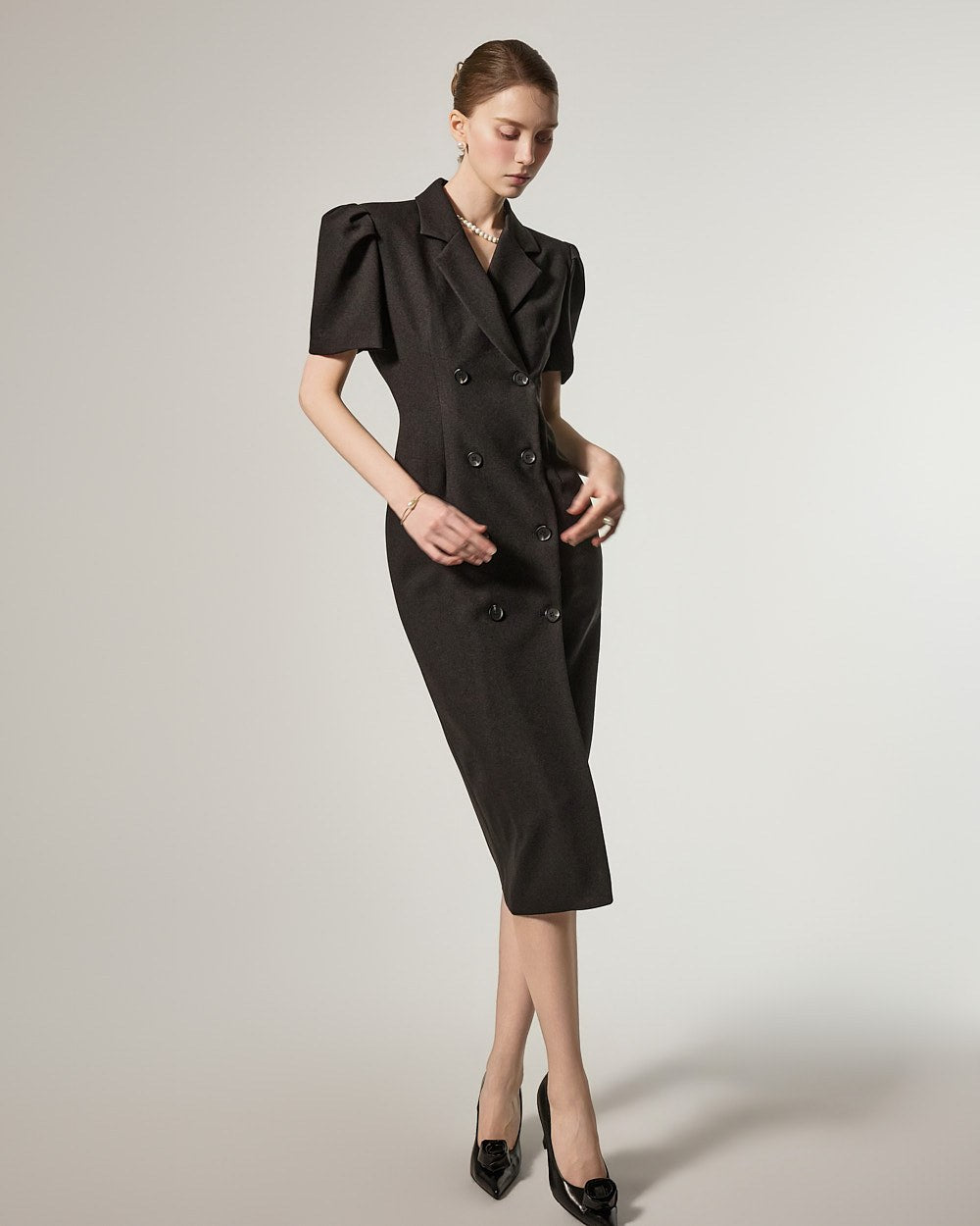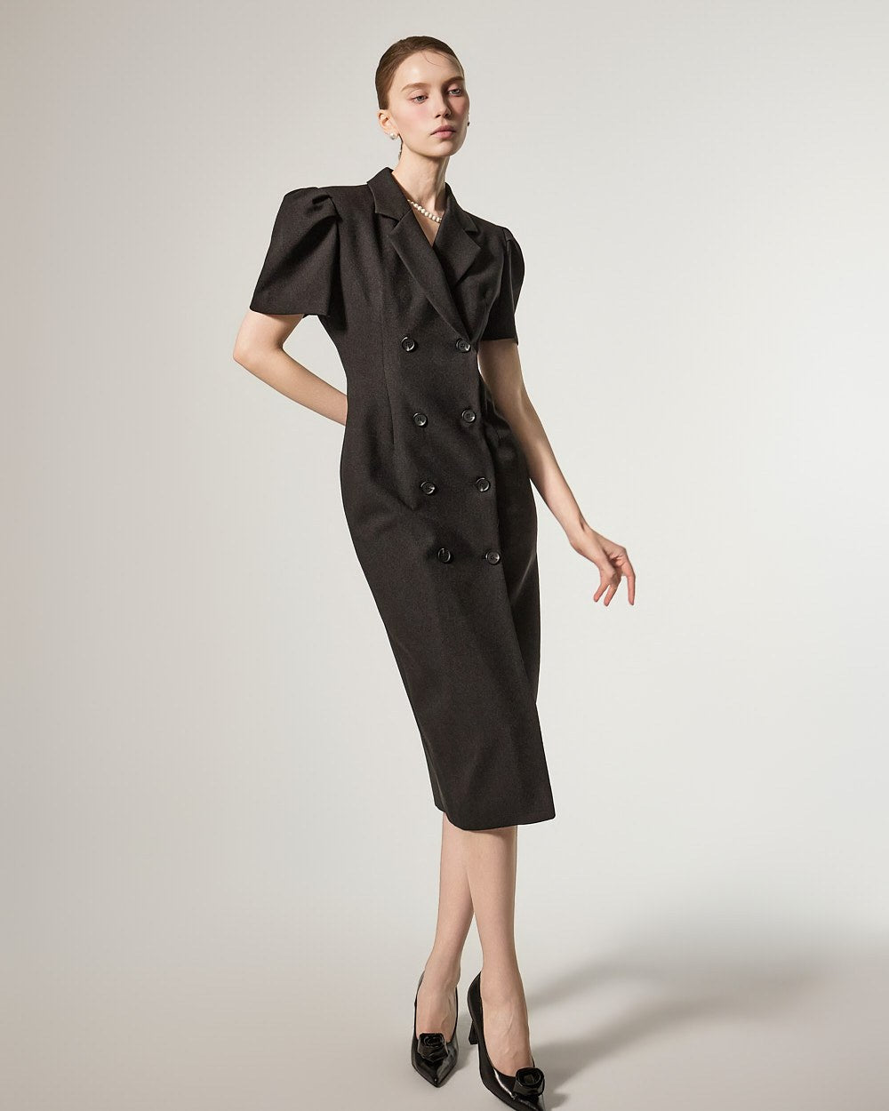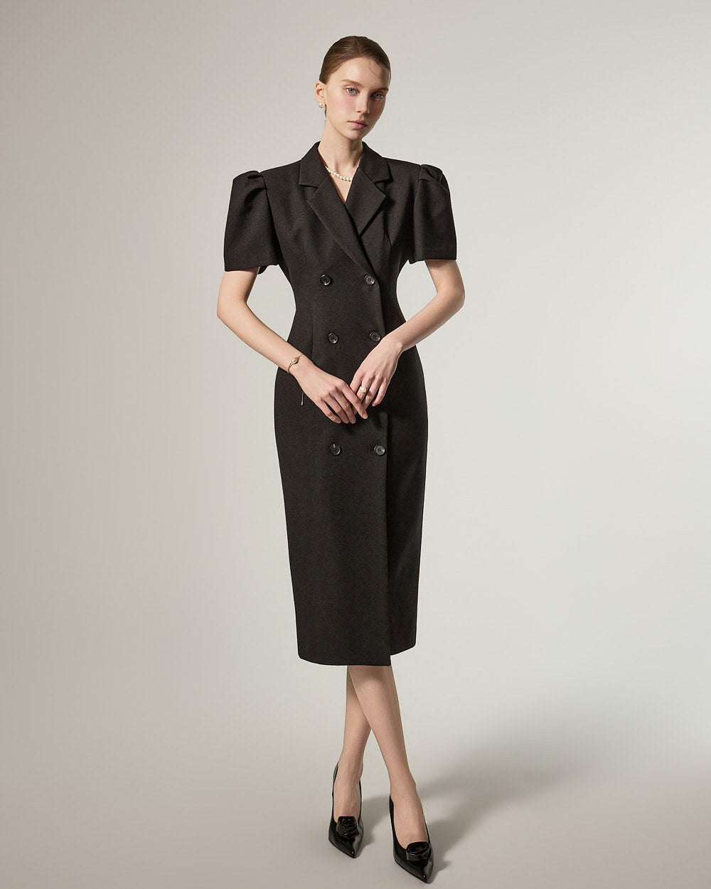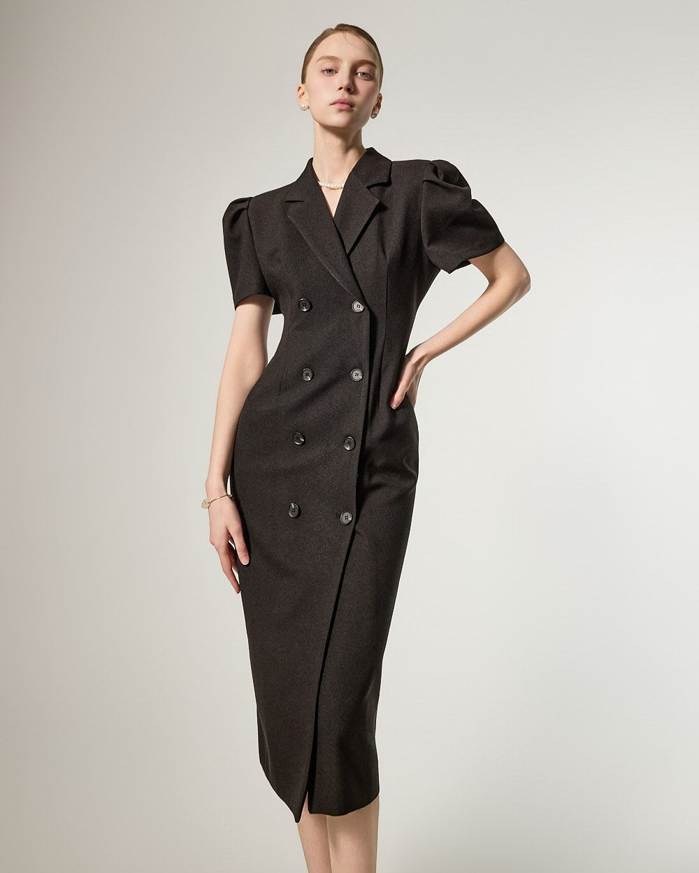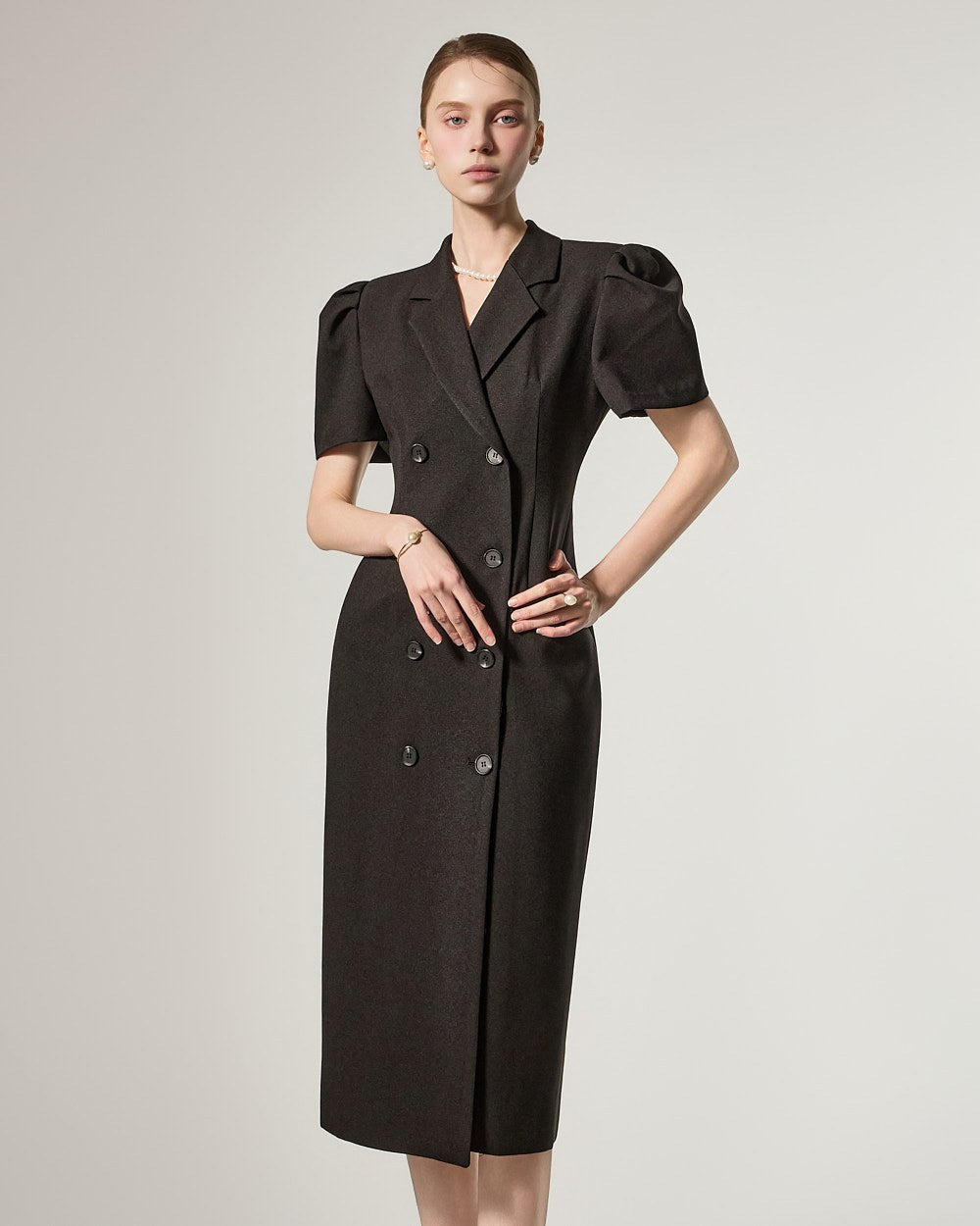 D5491 双排扣泡泡袖连衣裙