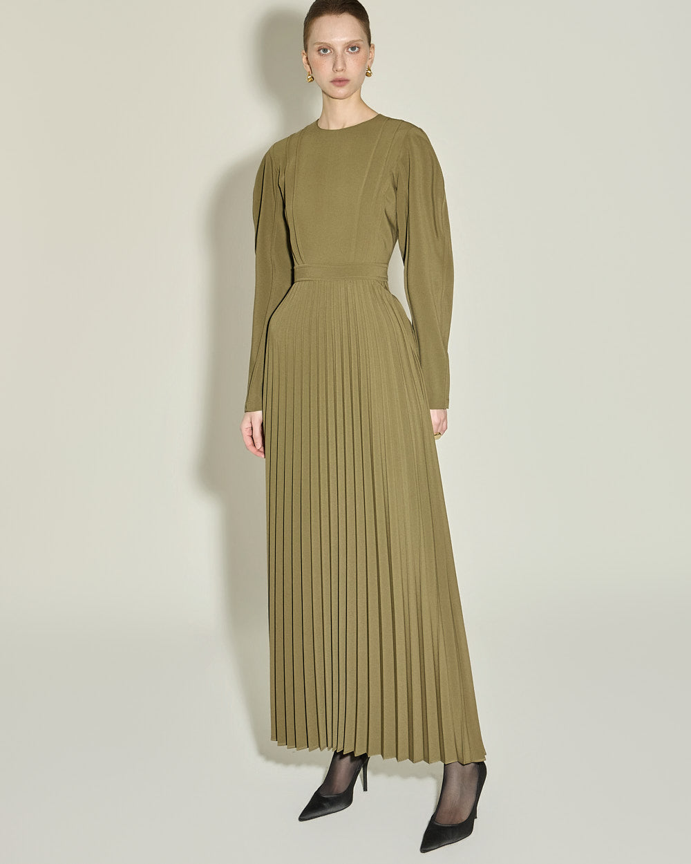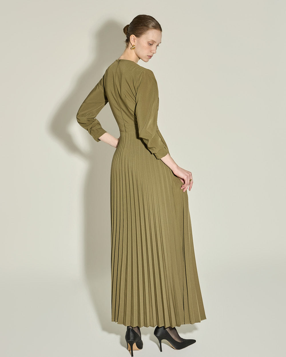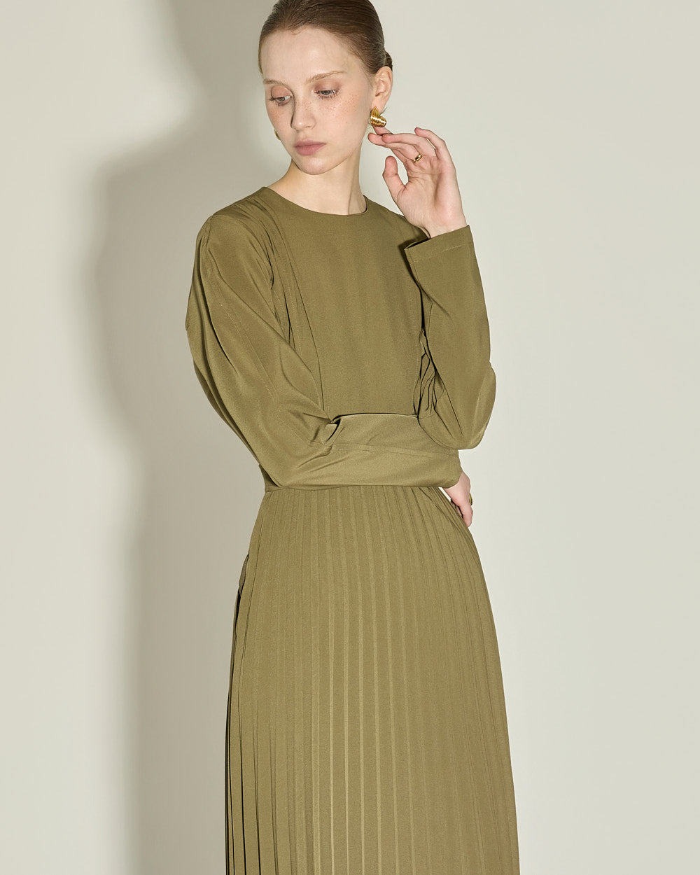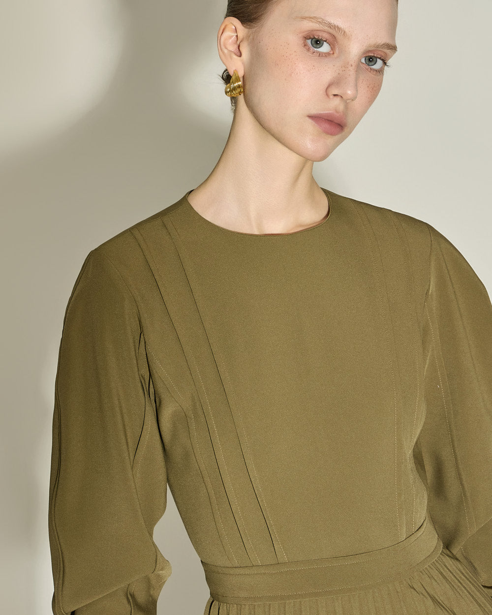 and gently pleated details below the waistline,
