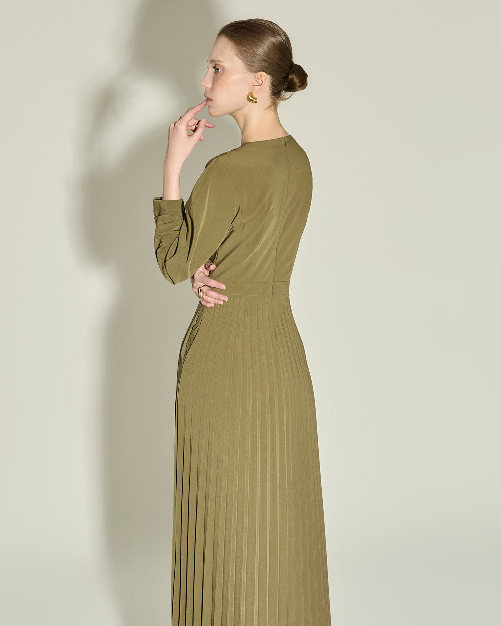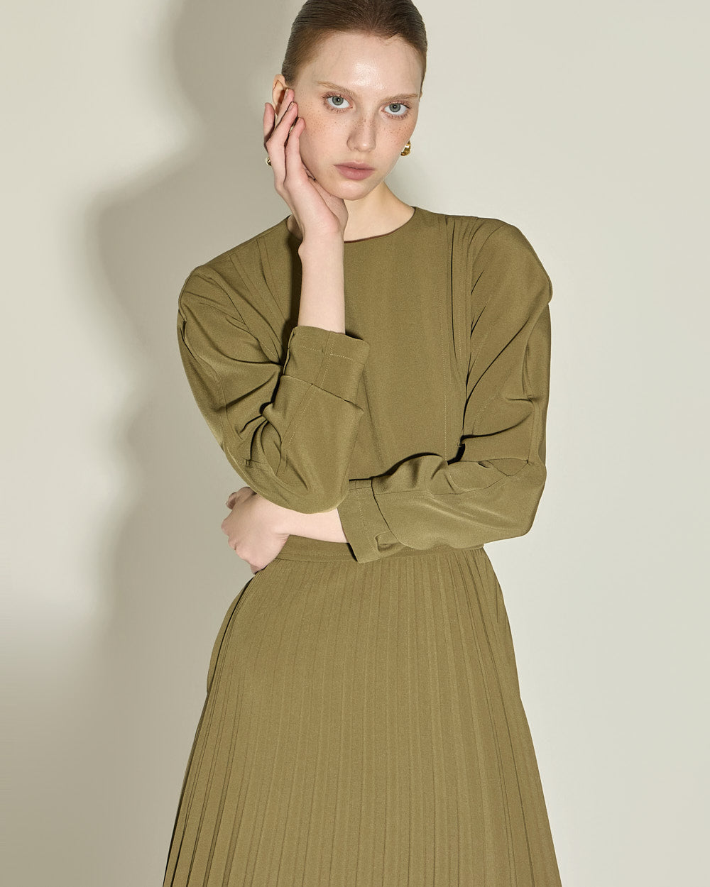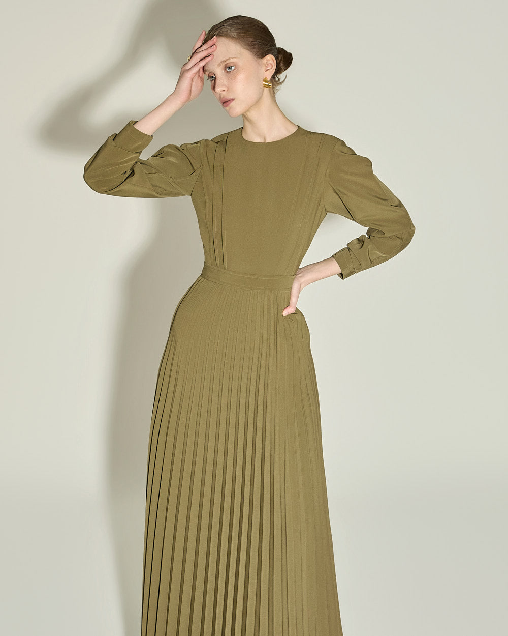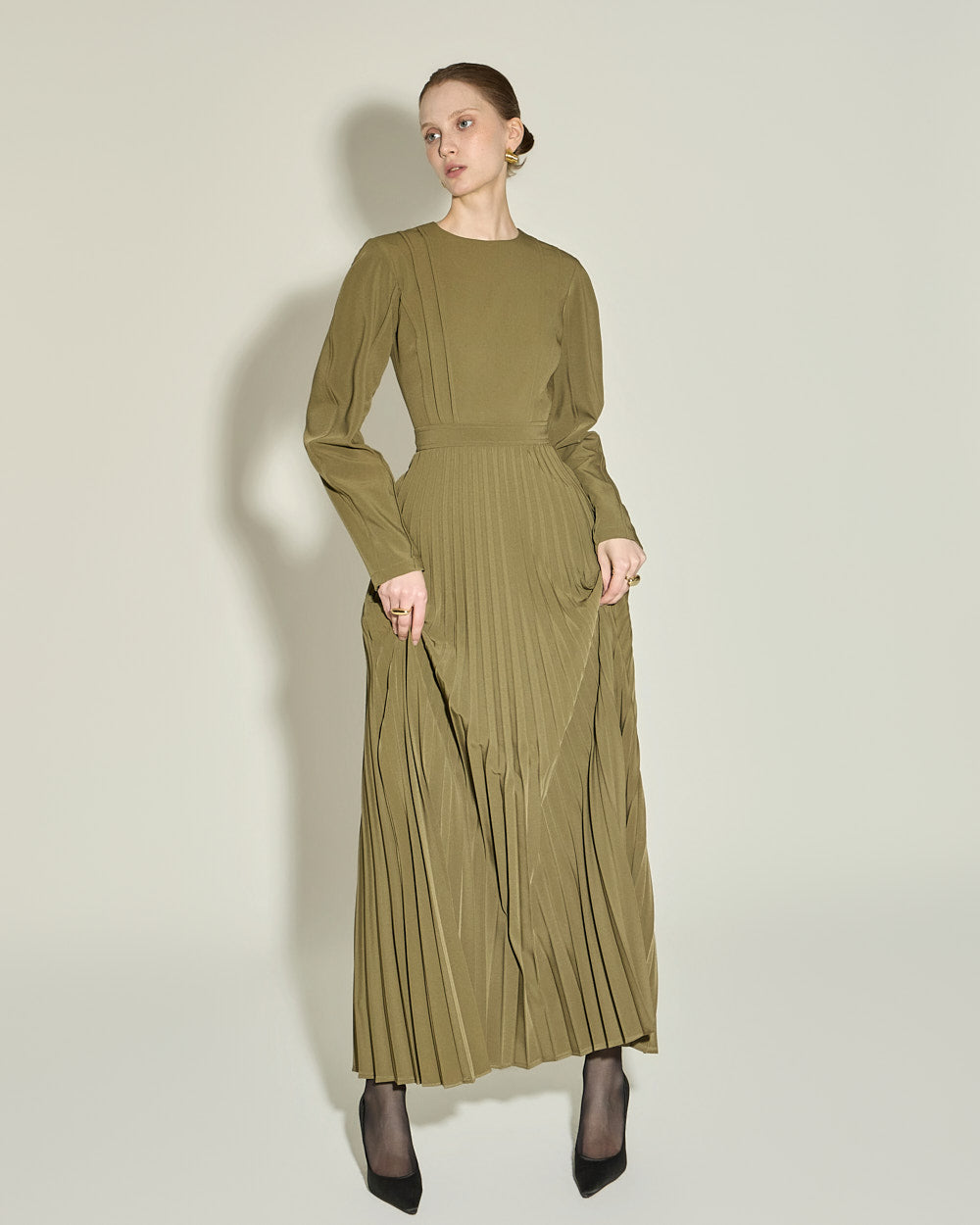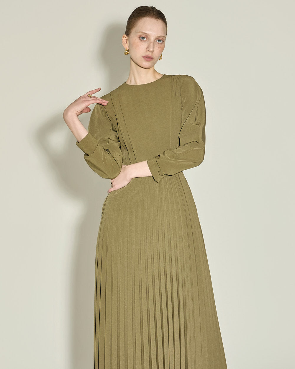 and gently pleated details below the waistline,