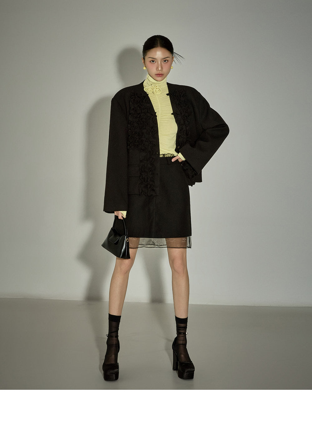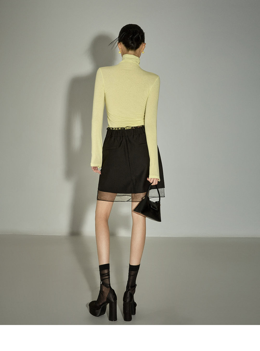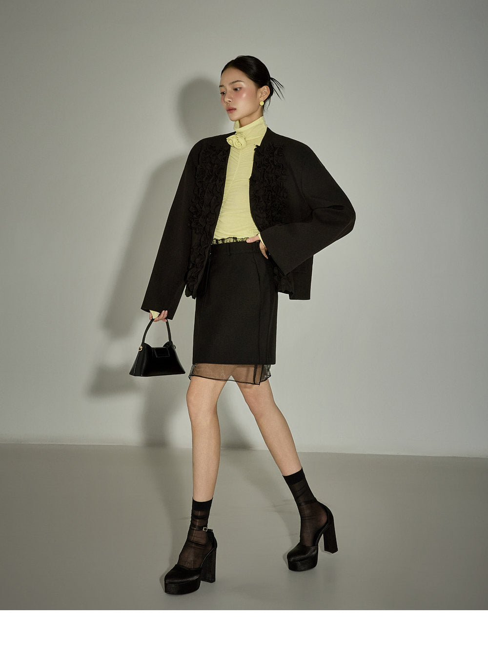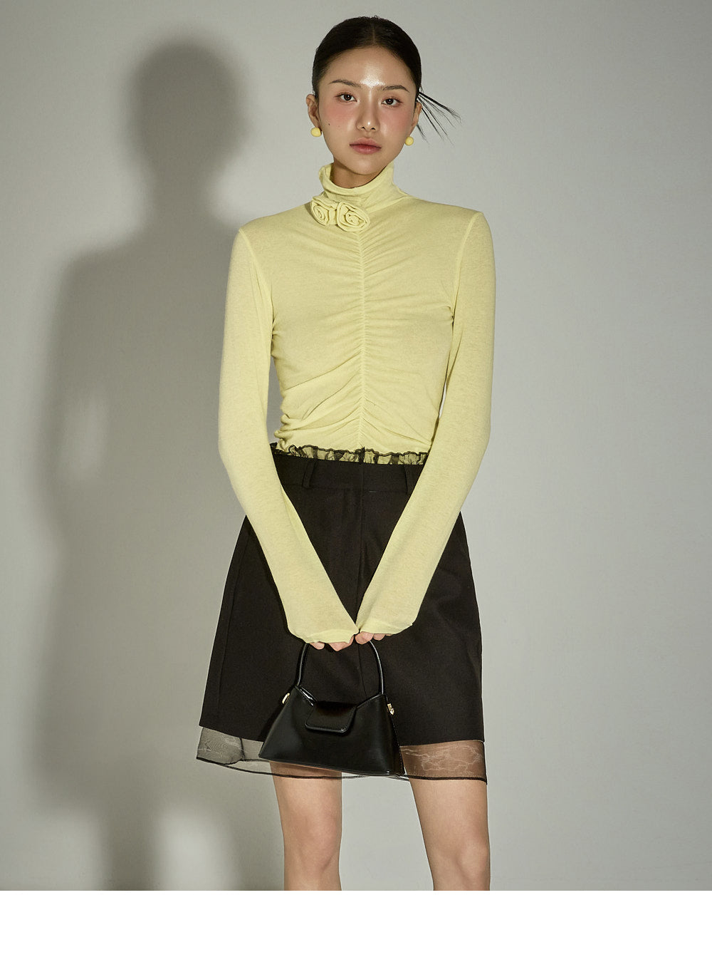 This lovely corsage set turtleneck top is crafted from a blend of various materials, including wool, cotton, and Tencel.