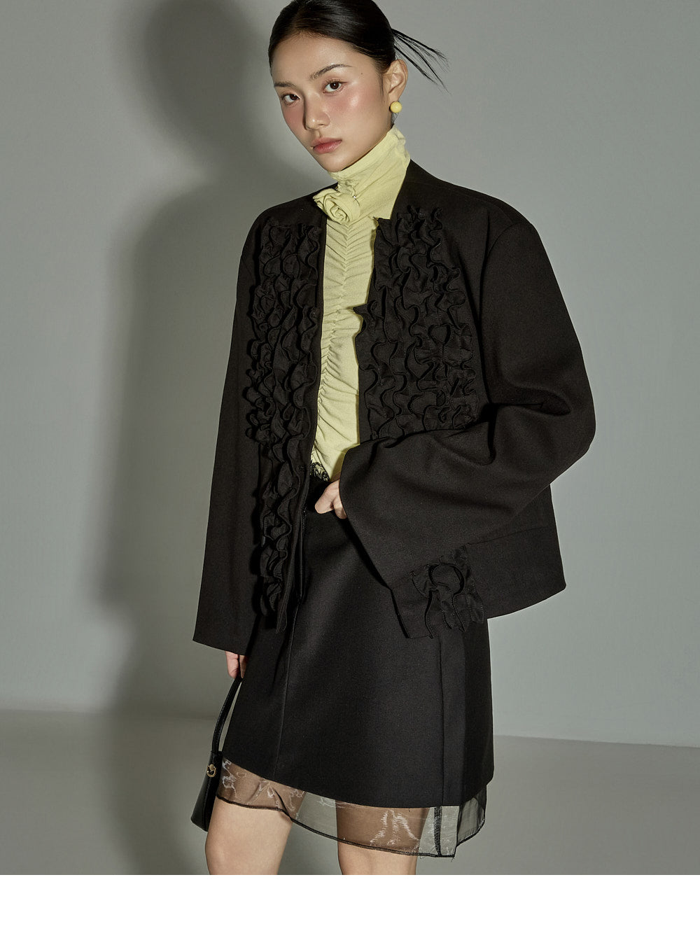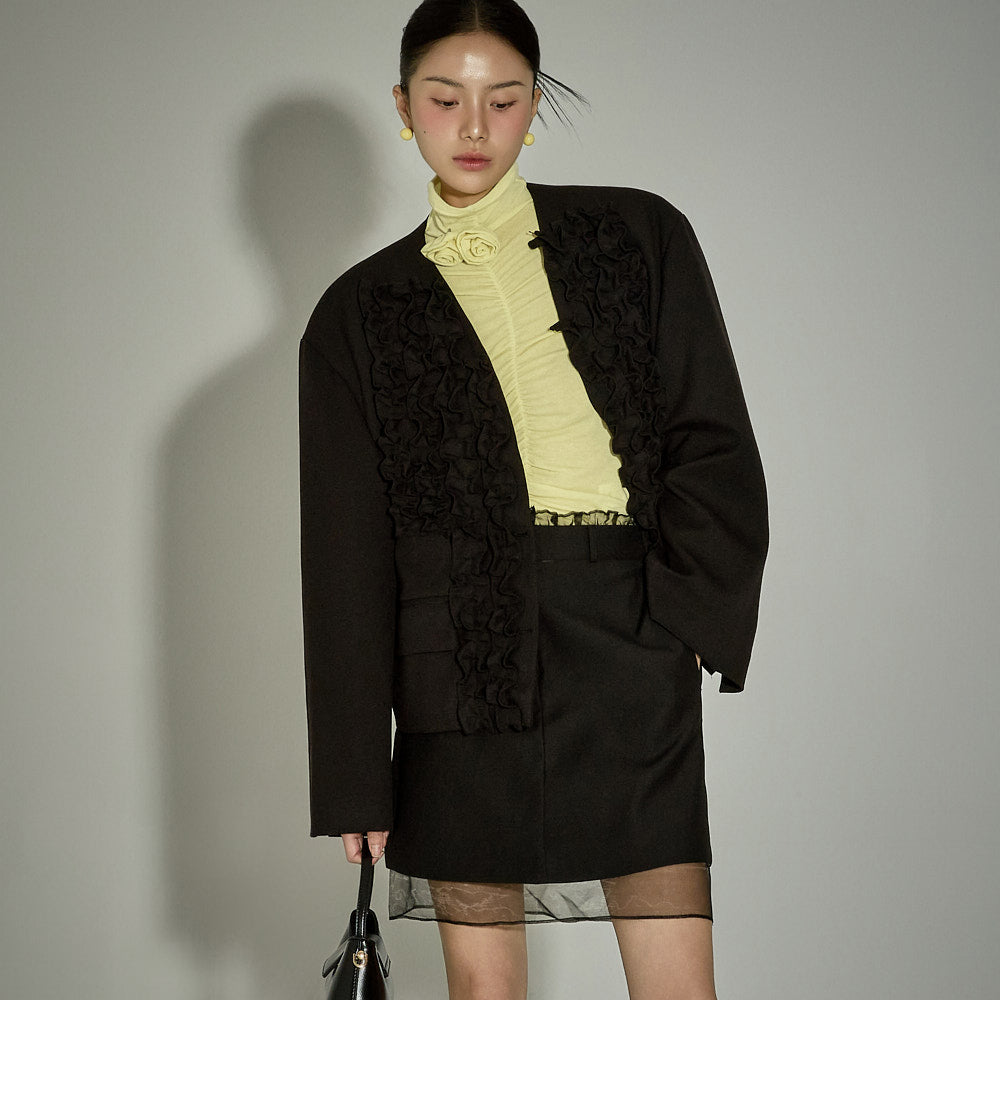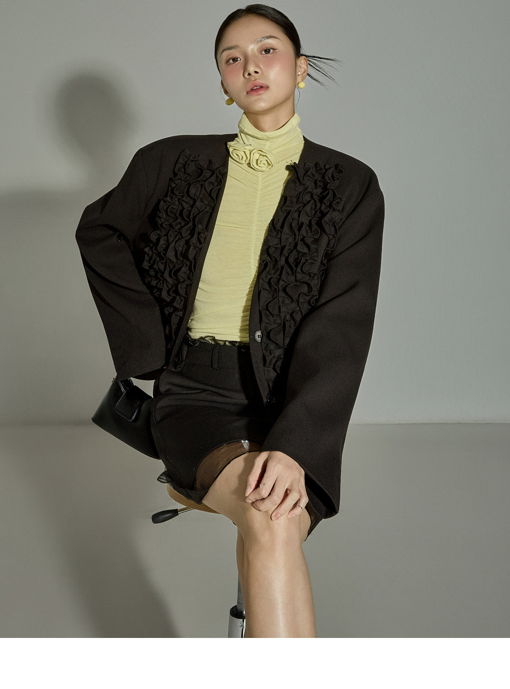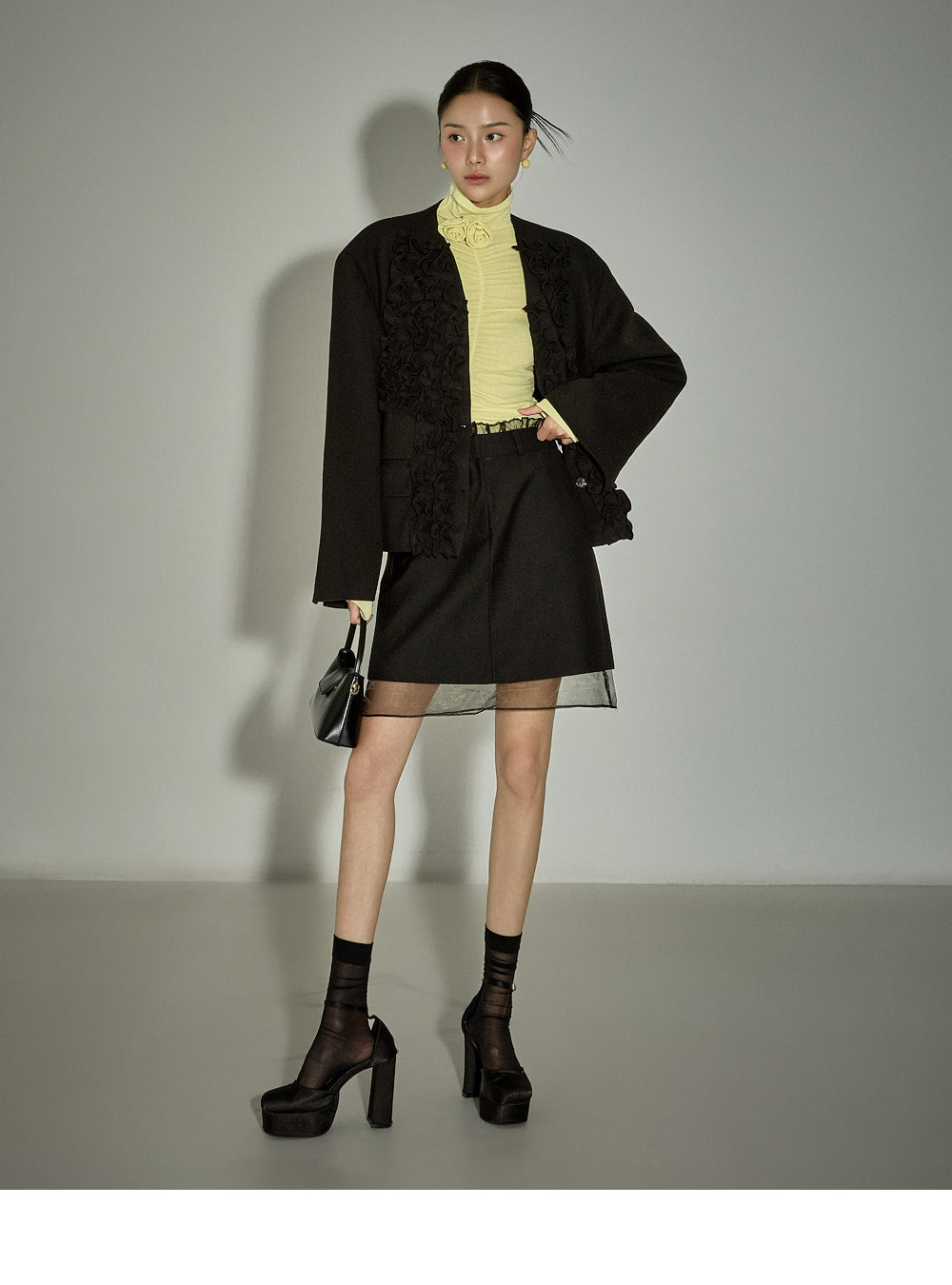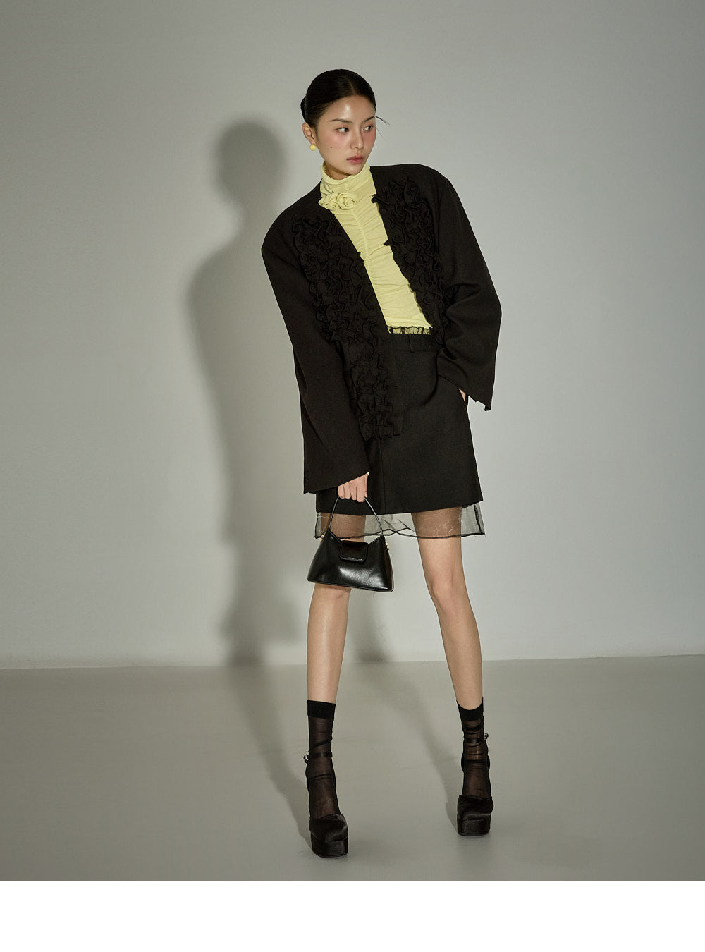 This lovely corsage set turtleneck top is crafted from a blend of various materials, including wool, cotton, and Tencel.