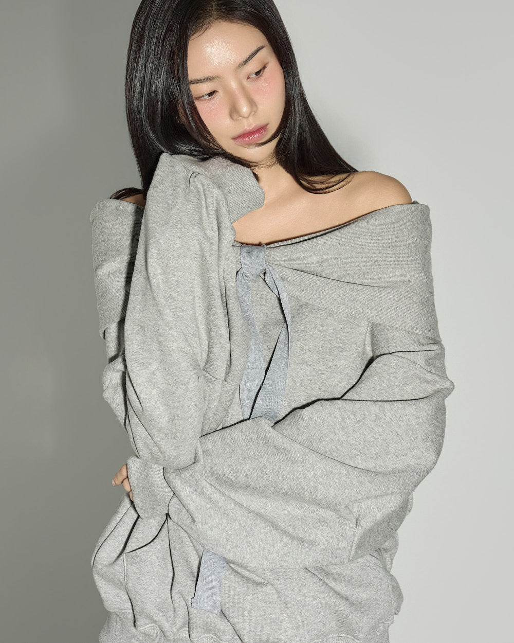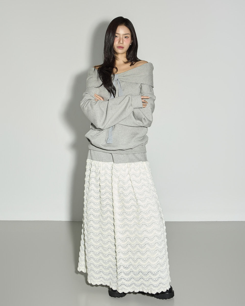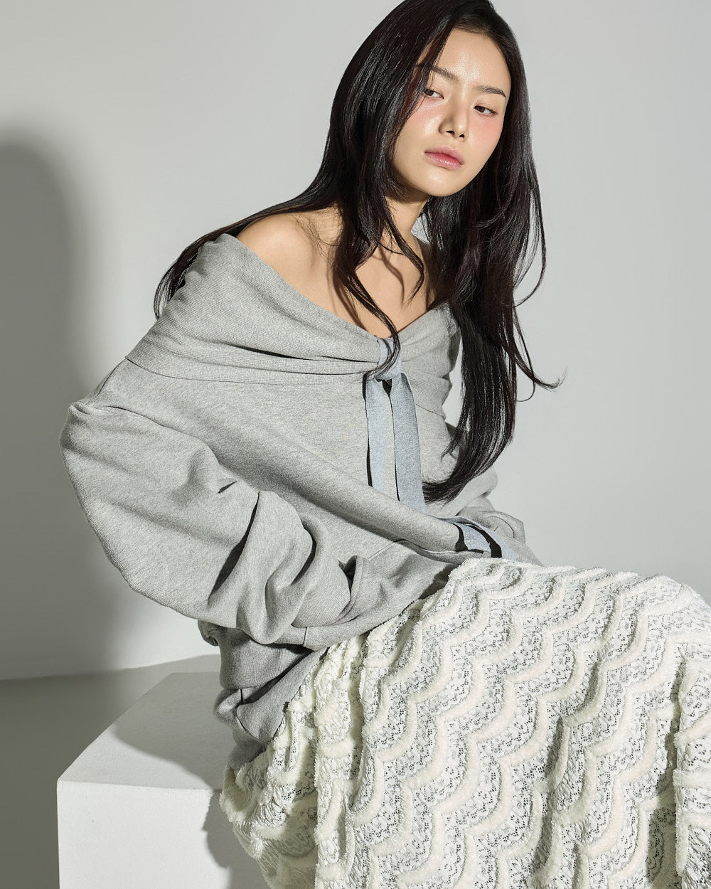 creating a harmonious balance between casual sweatshirt vibes and gentle feminine charm.