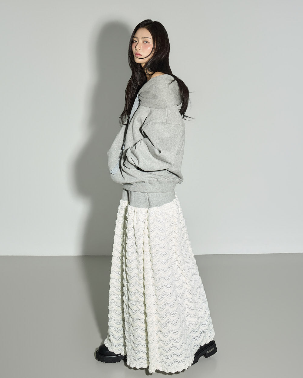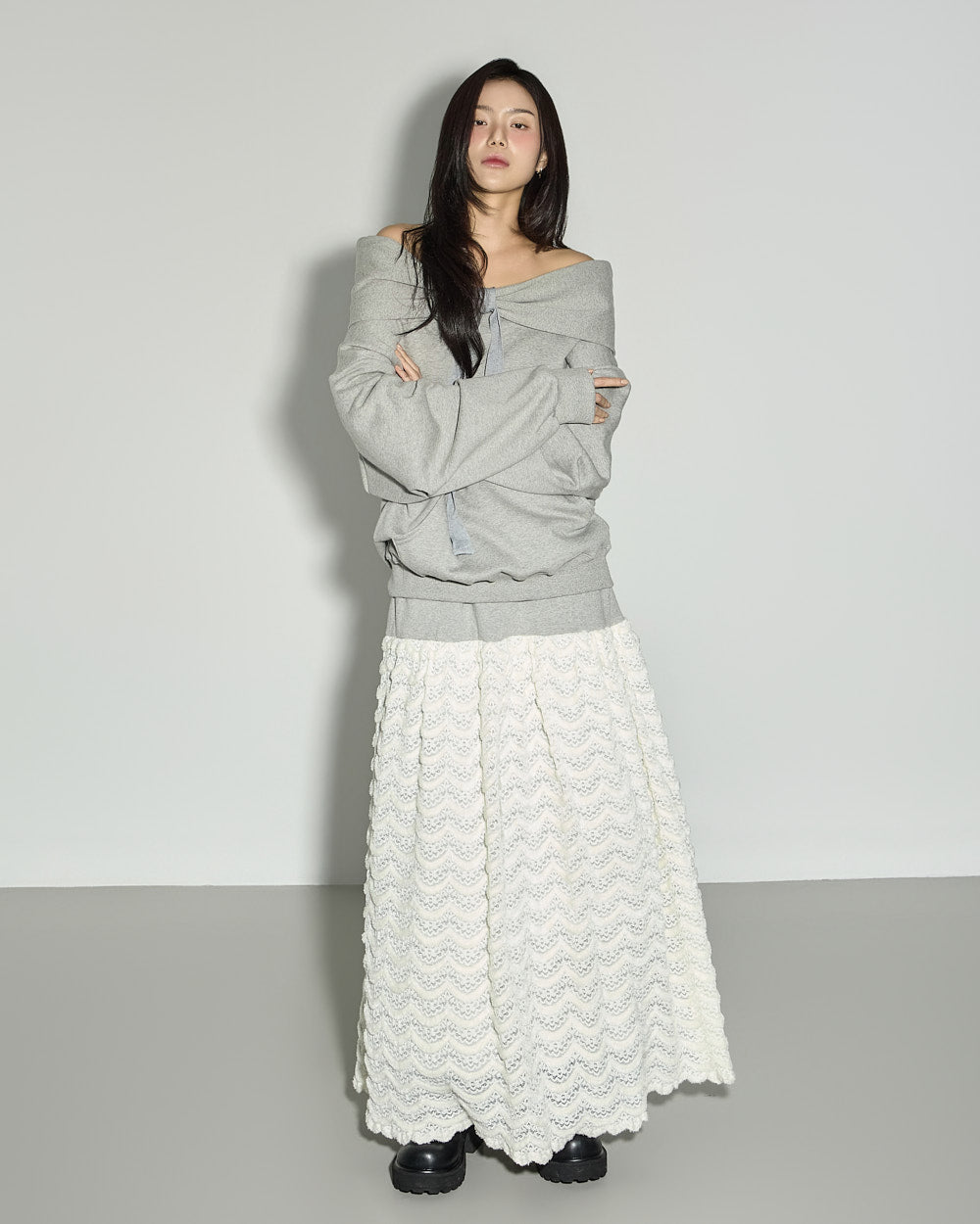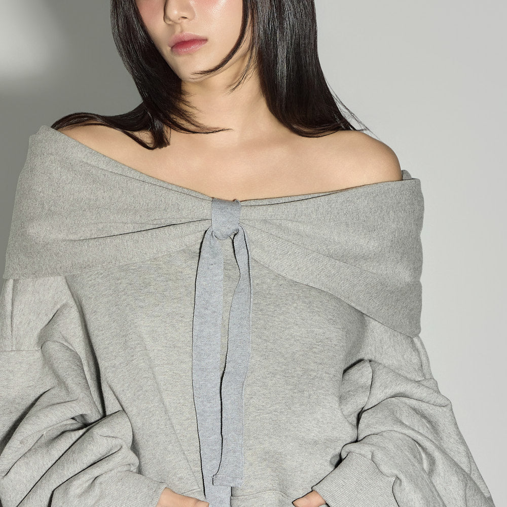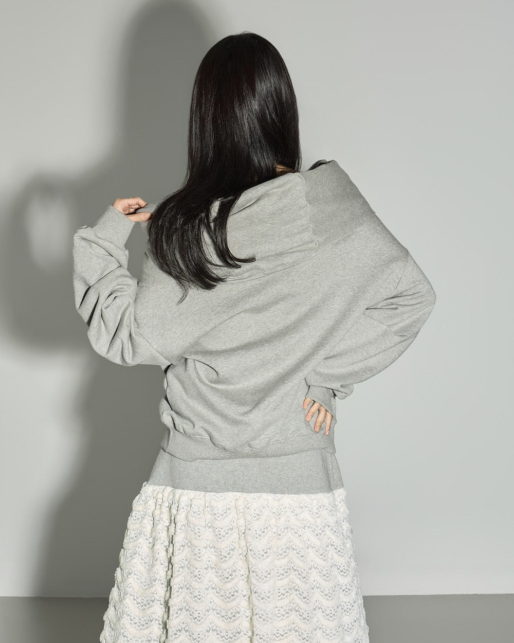 creating a harmonious balance between casual sweatshirt vibes and gentle feminine charm.