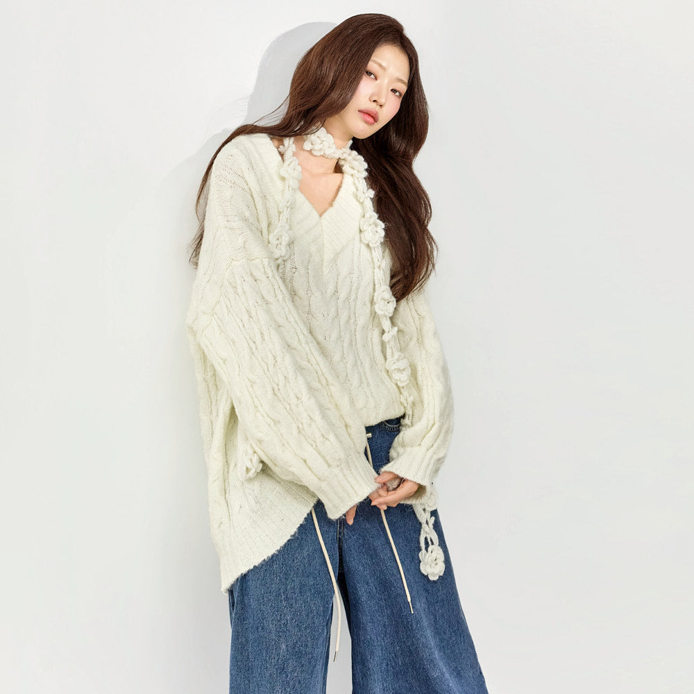 E4116 Cable V-Neck Knit