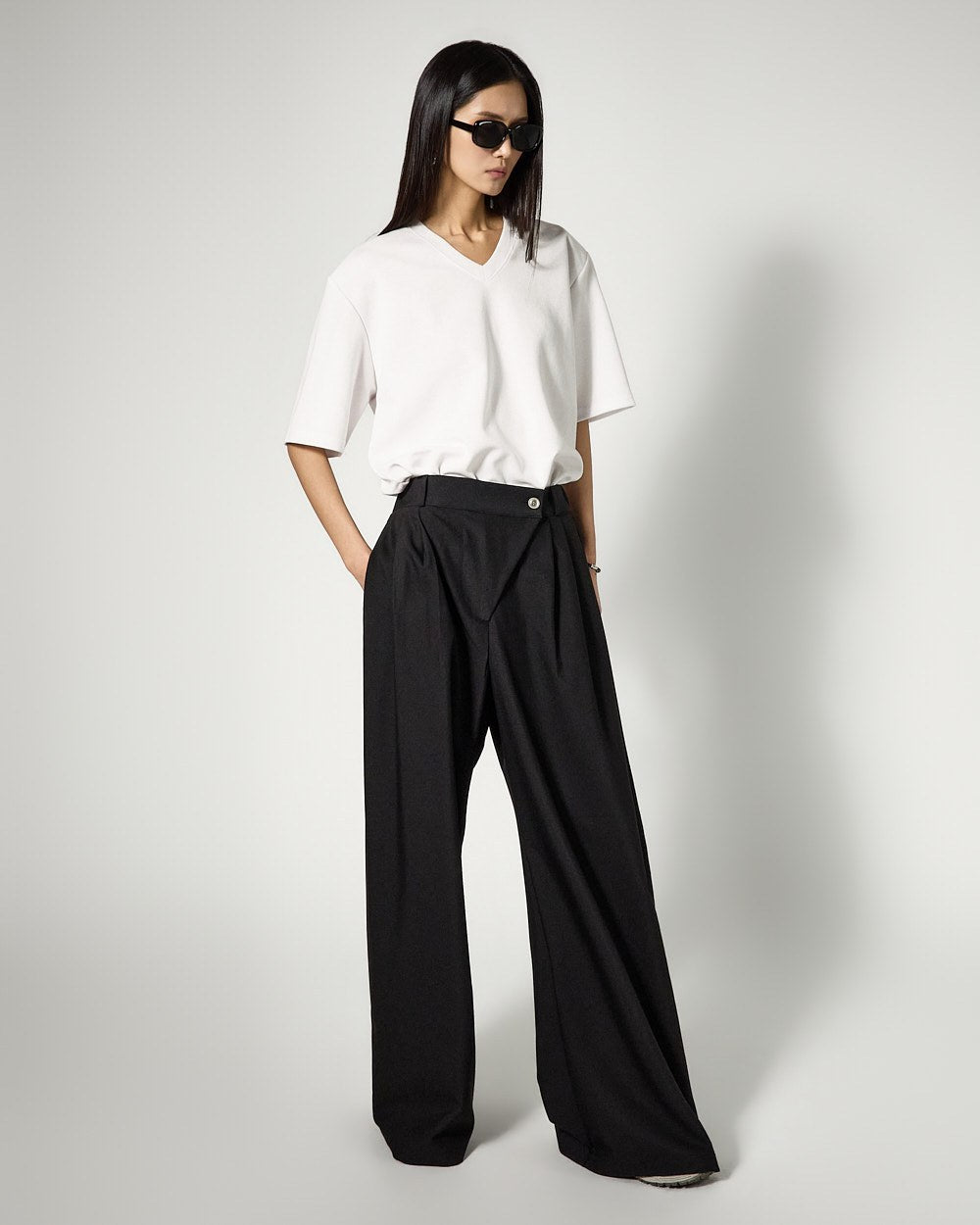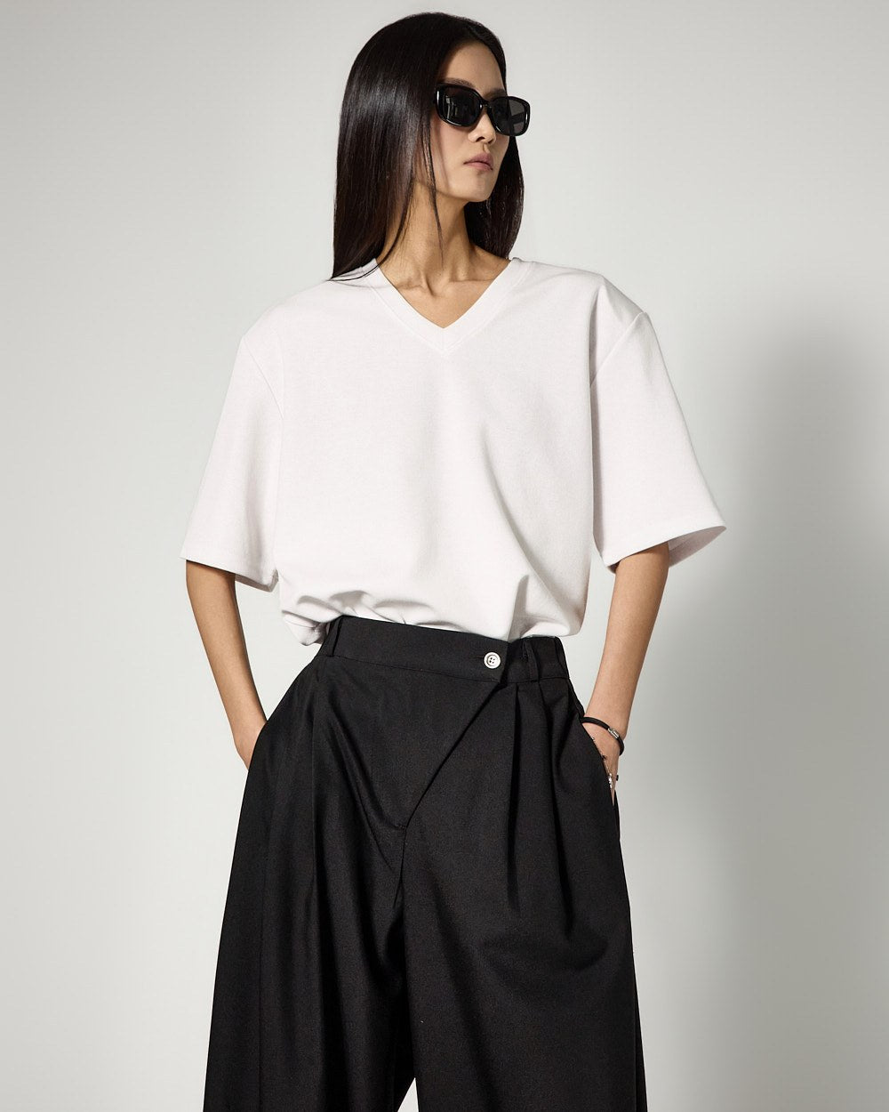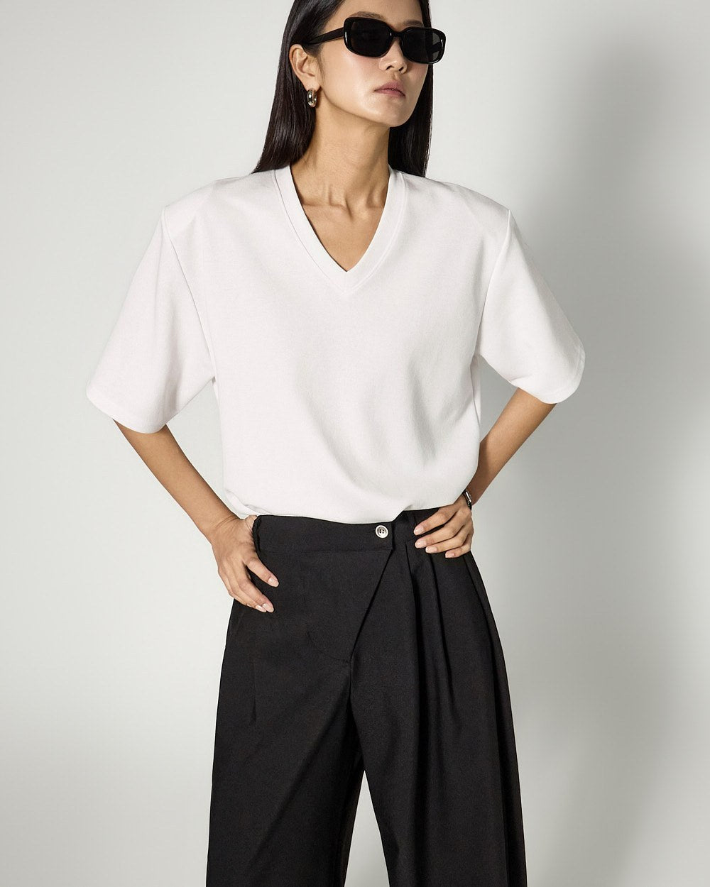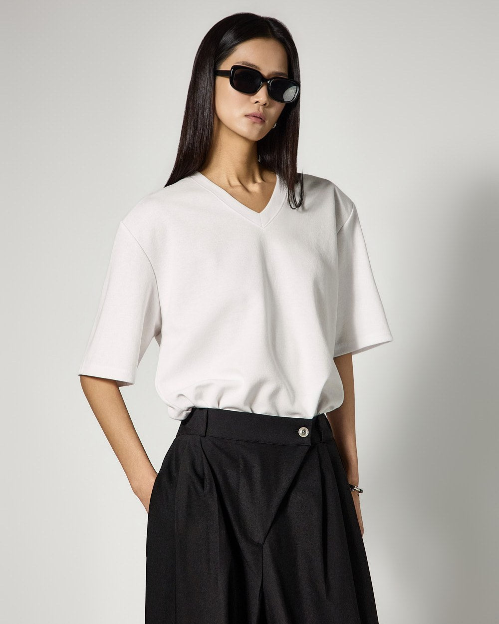 The V-neck design naturally reveals the neckline,