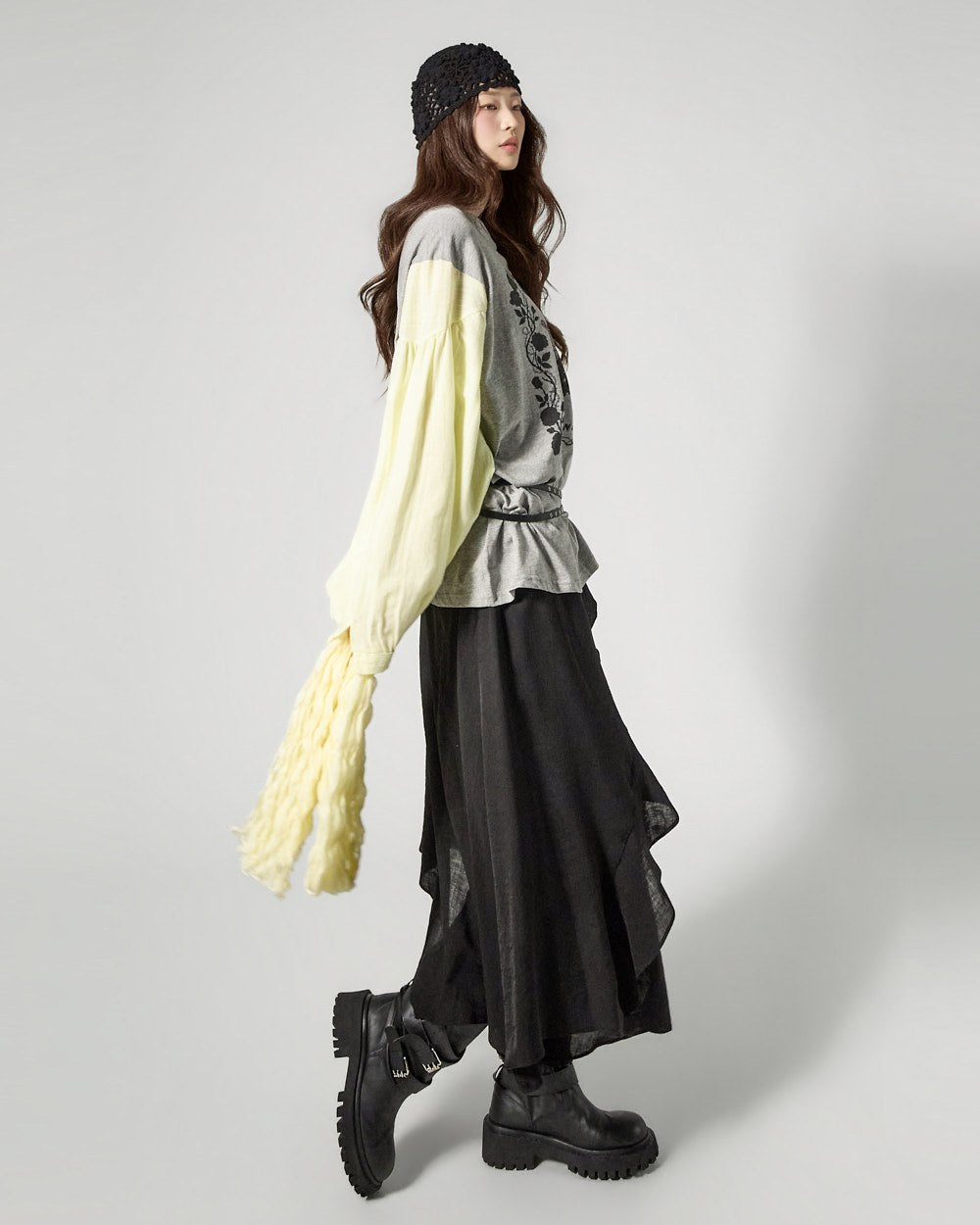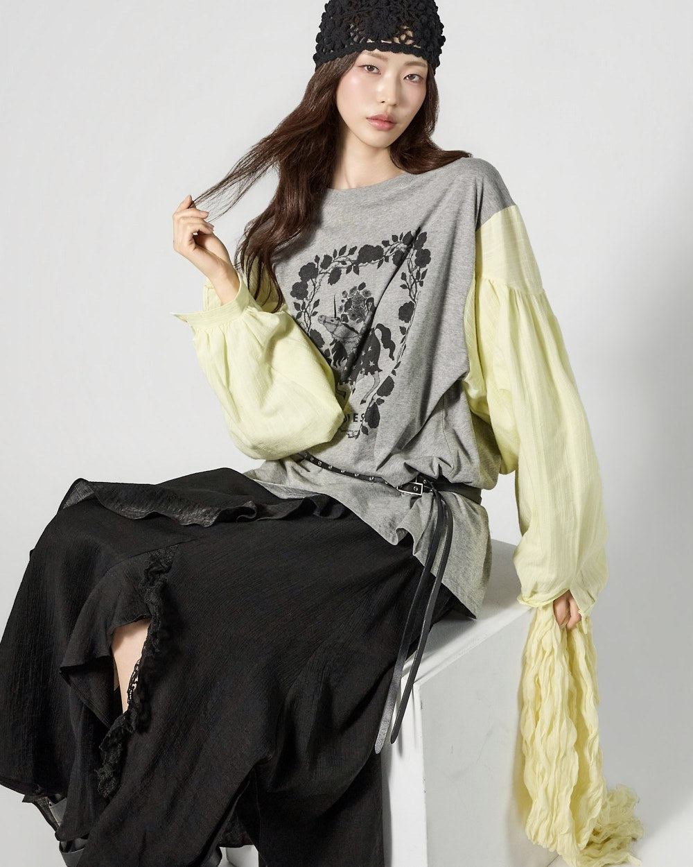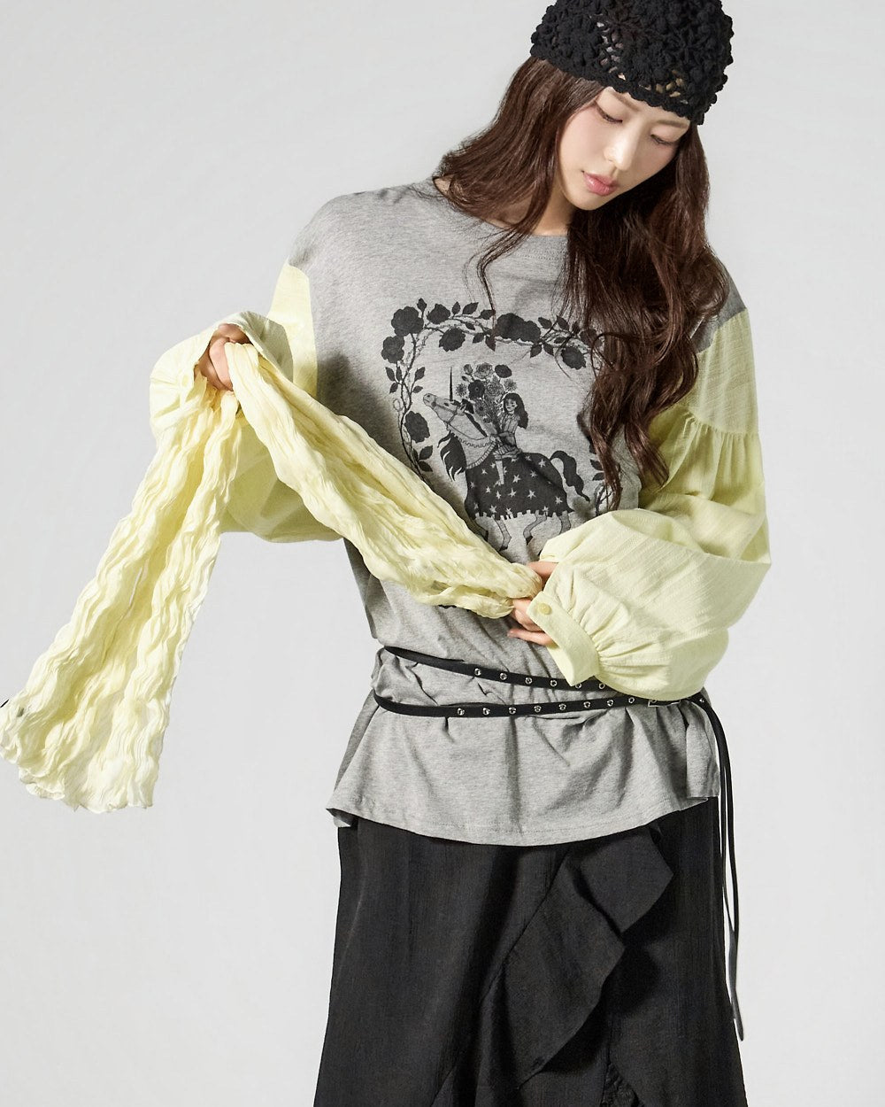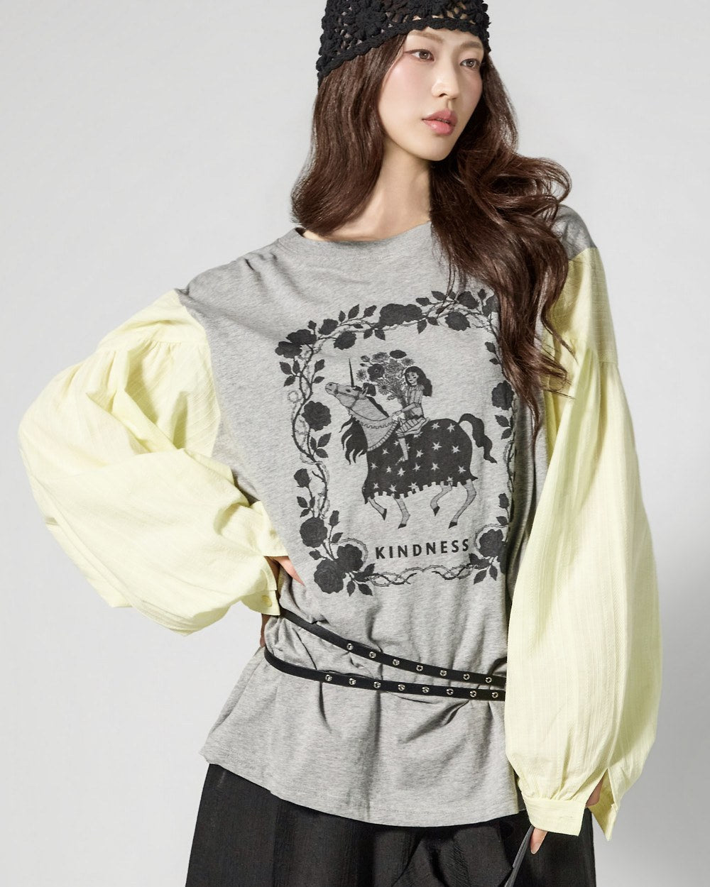 The contrast sleeve details create a stylish and unique atmosphere.