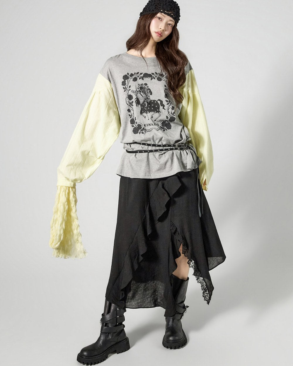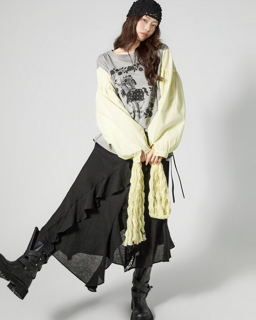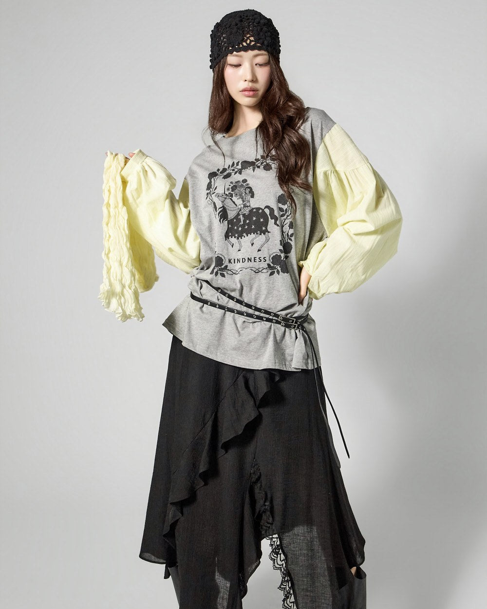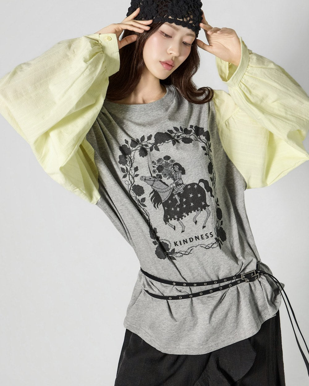 The contrast sleeve details create a stylish and unique atmosphere.