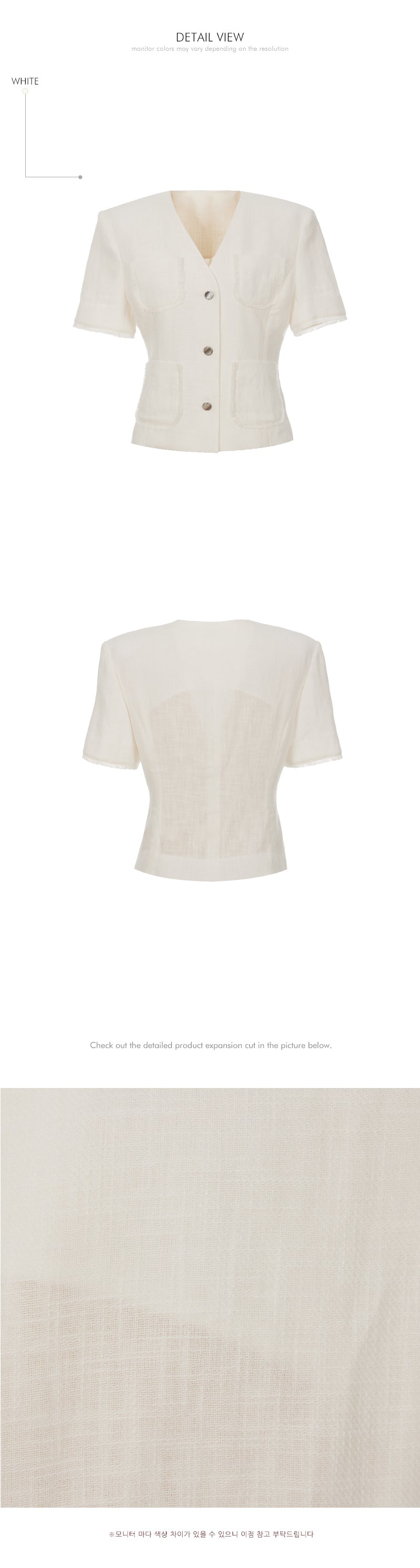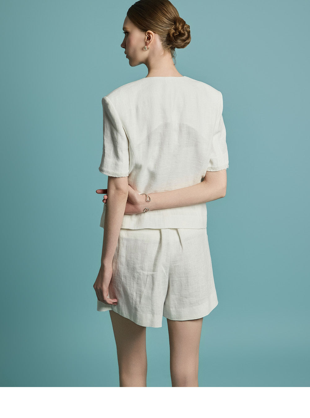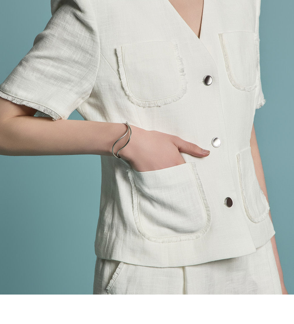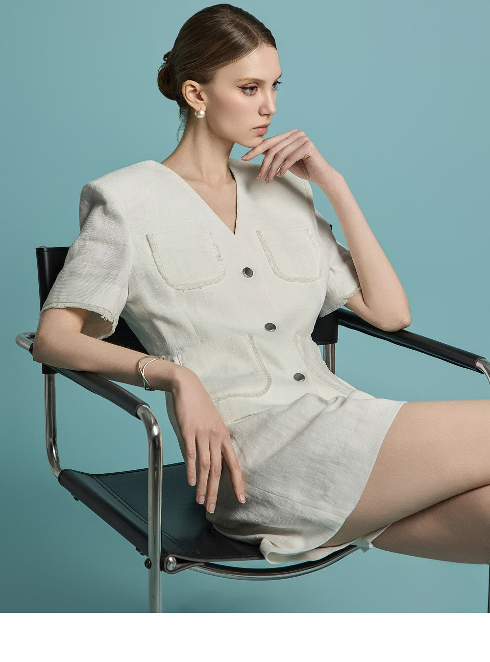 无领的干净领口和前面的银色纽扣增添了精致的感觉。