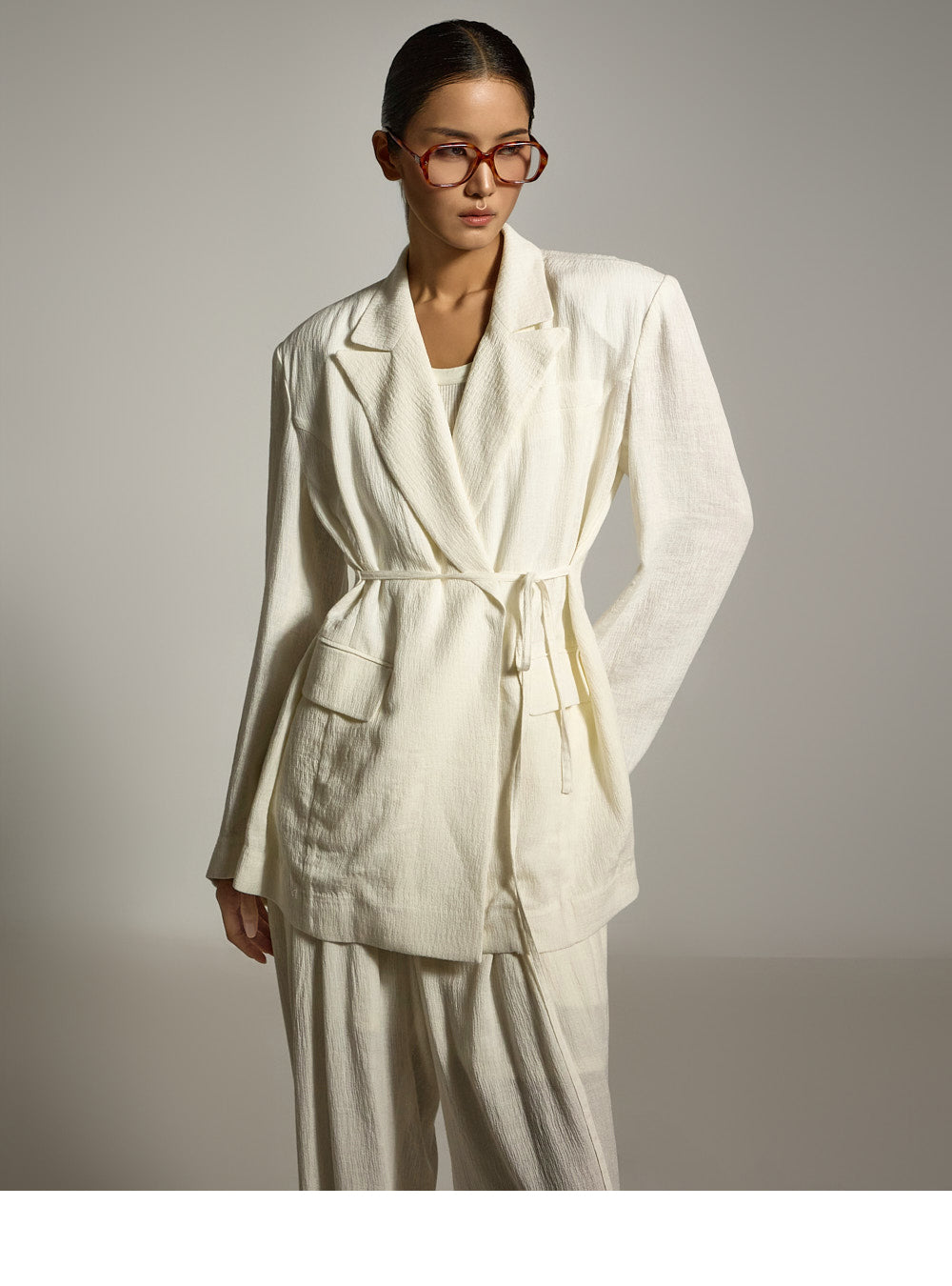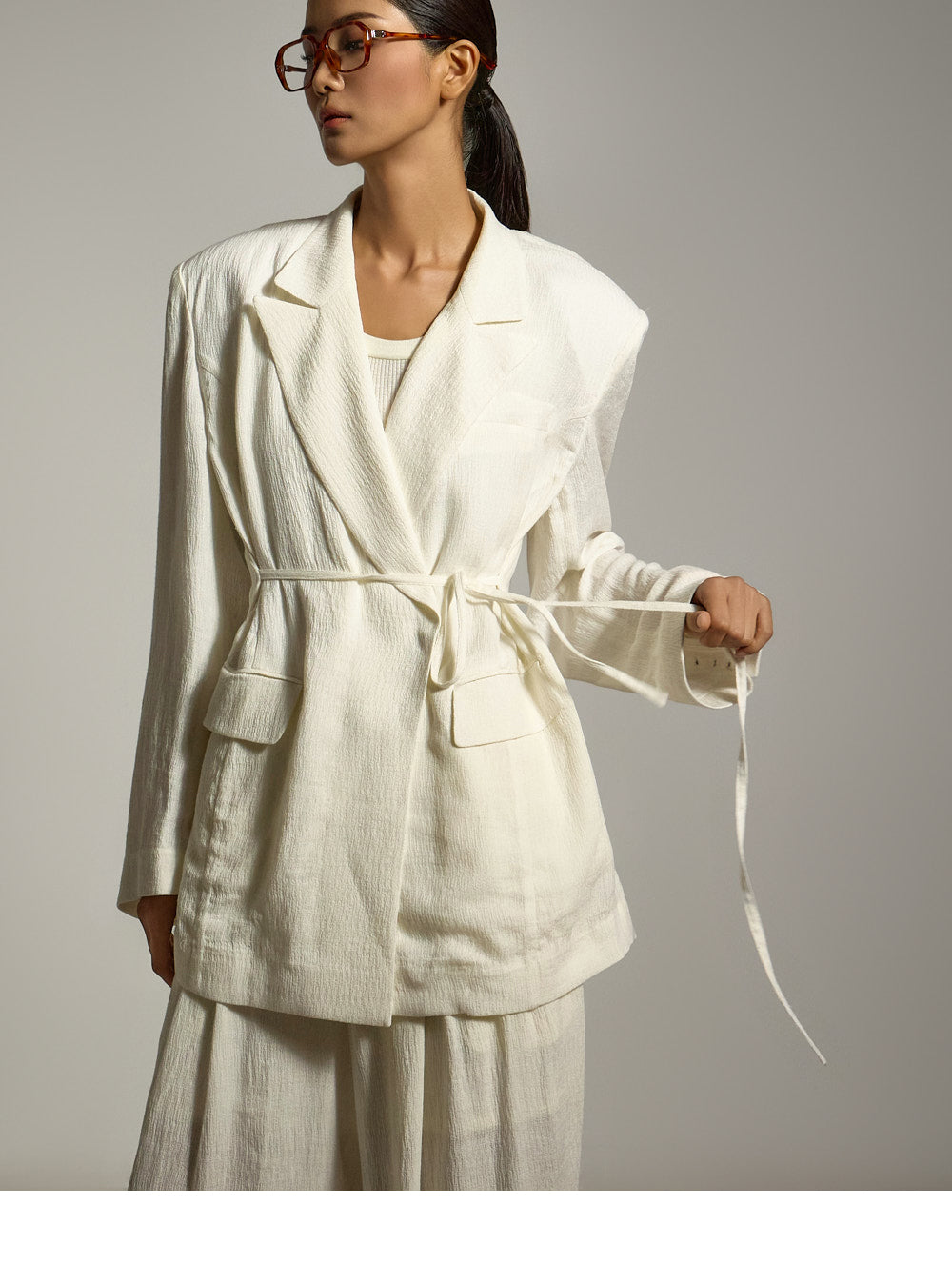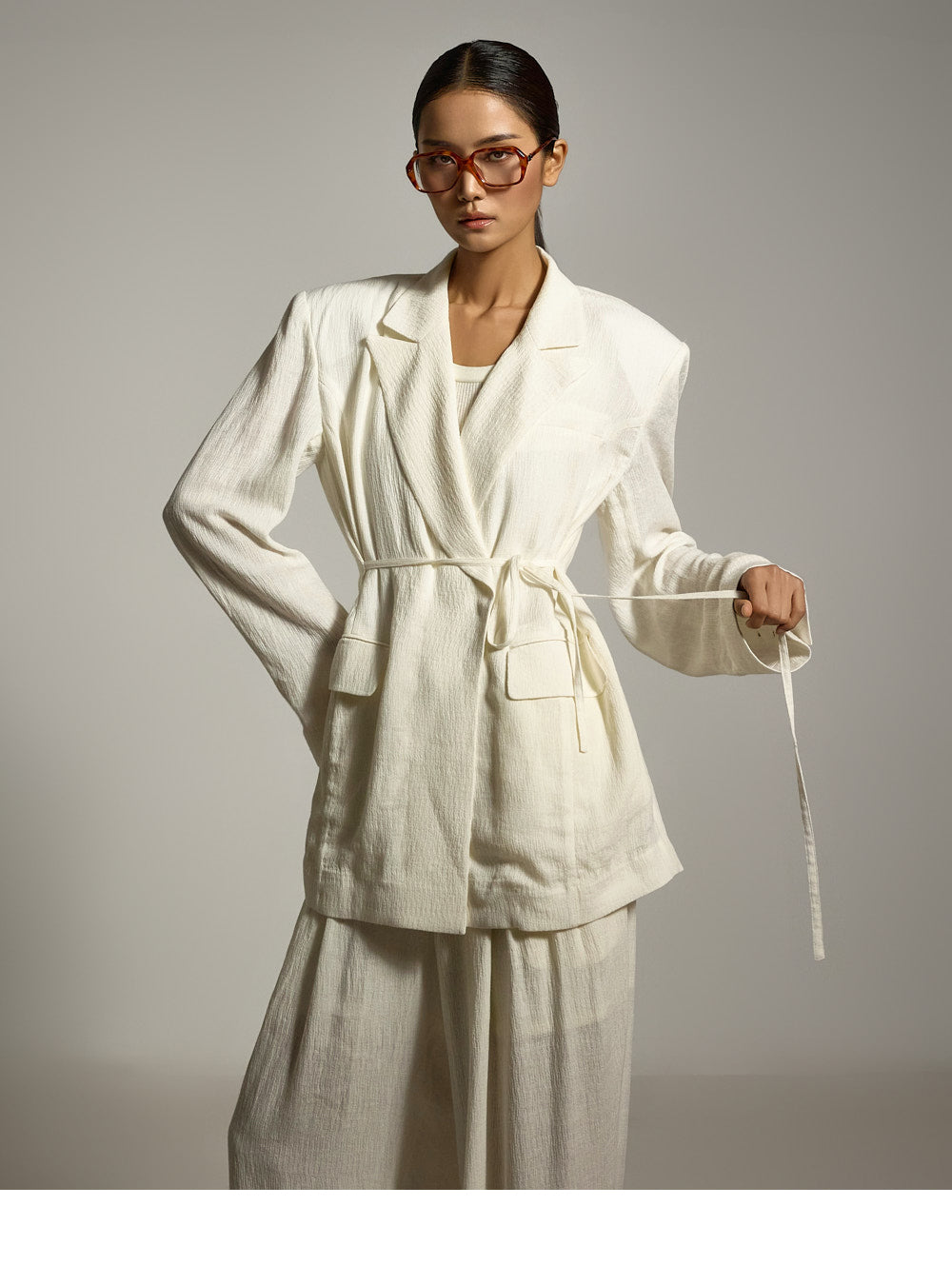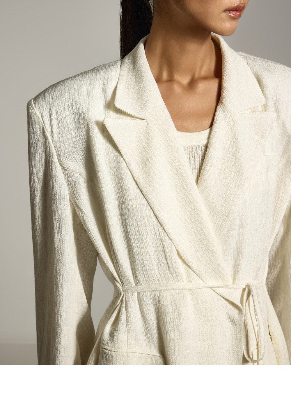 结构化的垫肩则增添了精致的造型。