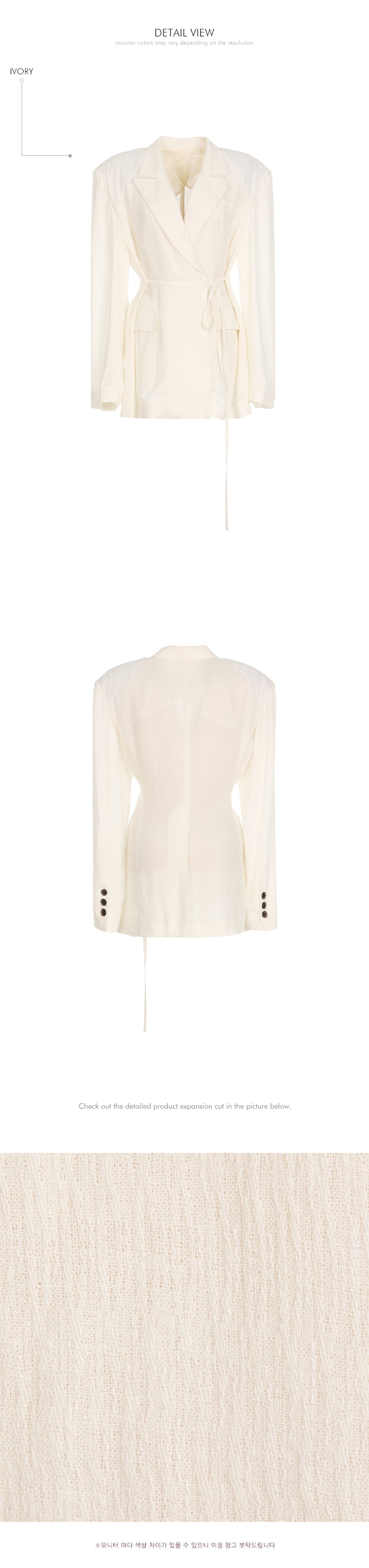 正面纽扣闭合、背面开衩等细节,