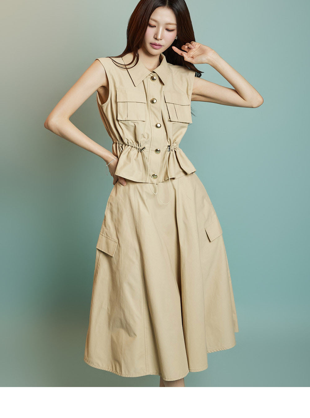 正面的金色纽扣增添了微妙的点缀,