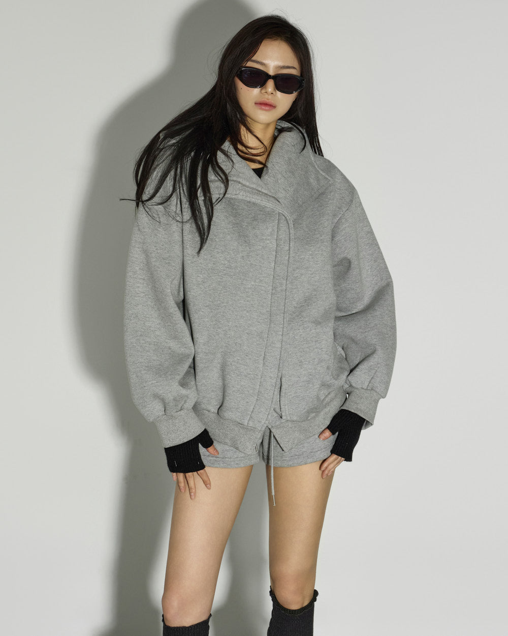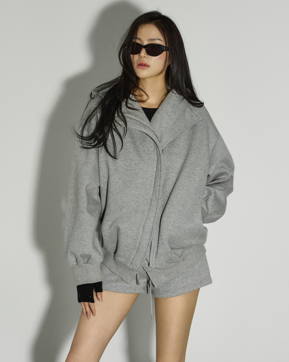 The two-way zipper allows for versatile styling.