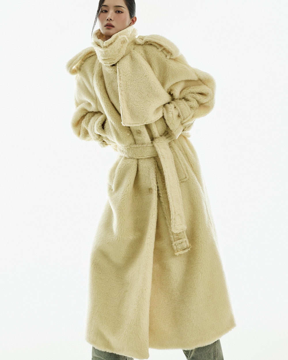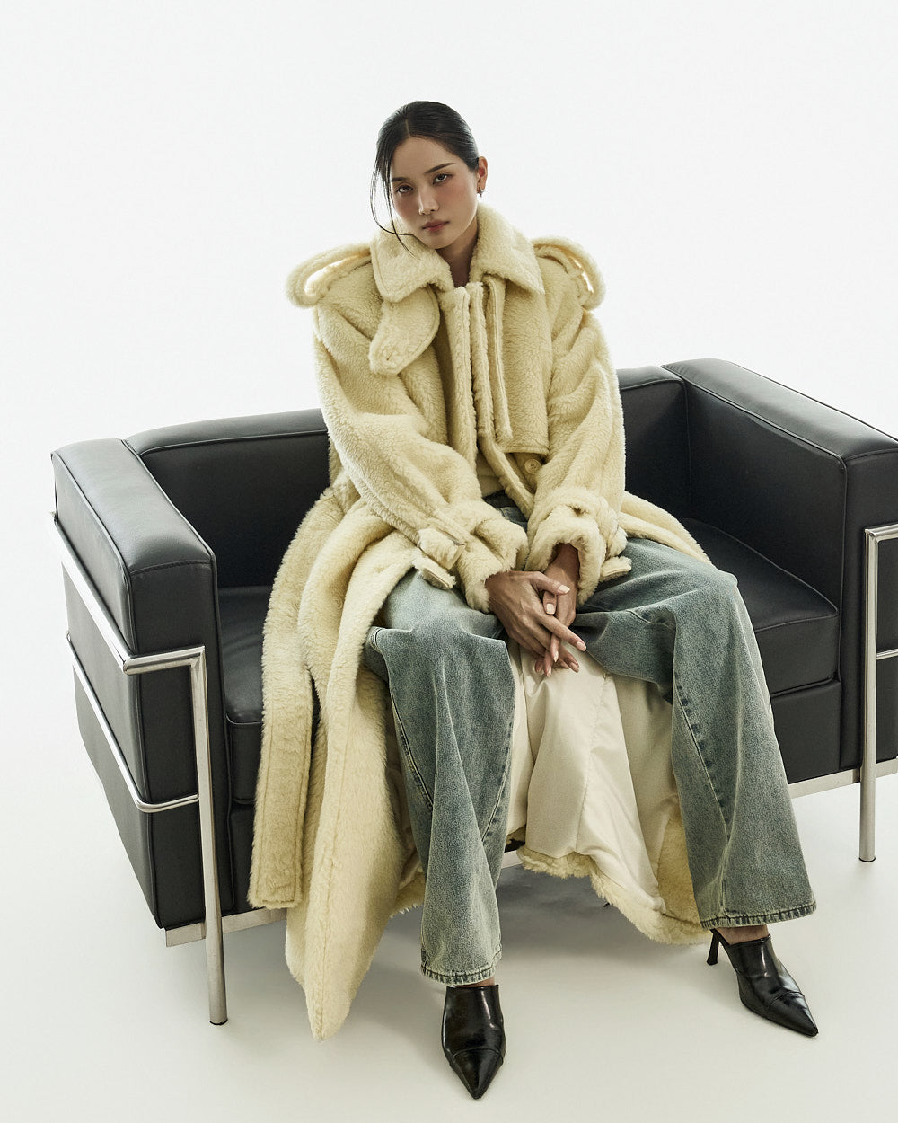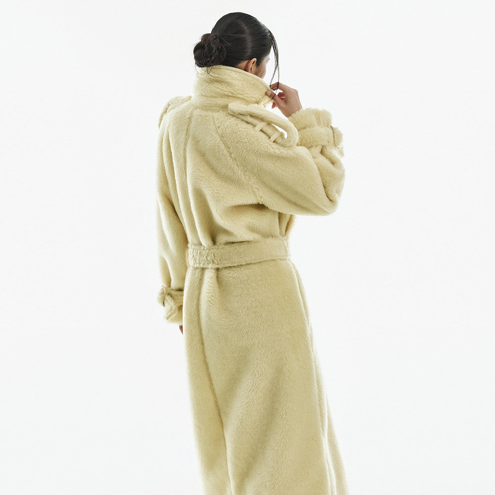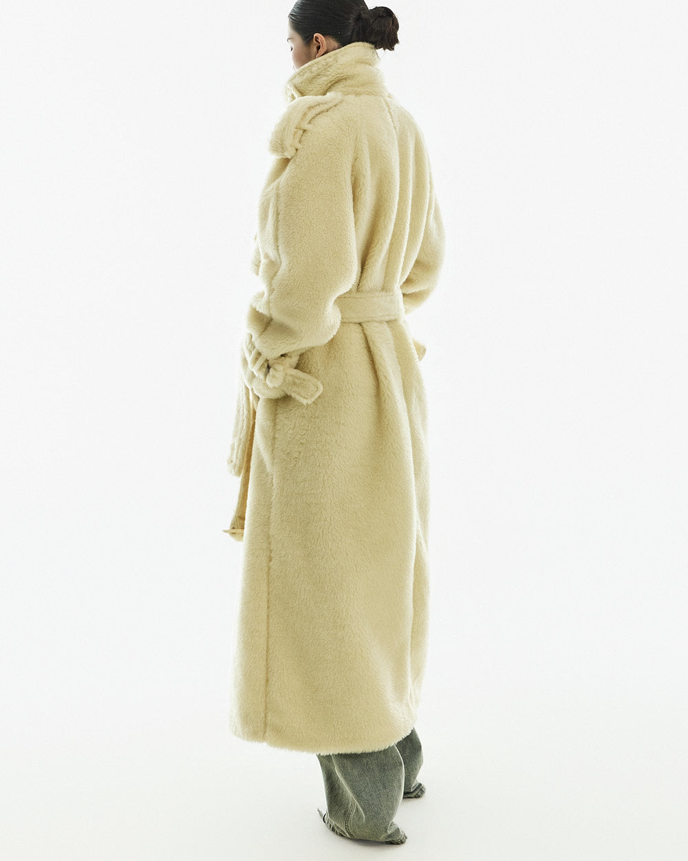 The coat is crafted from a polyester and acrylic blend of fur.