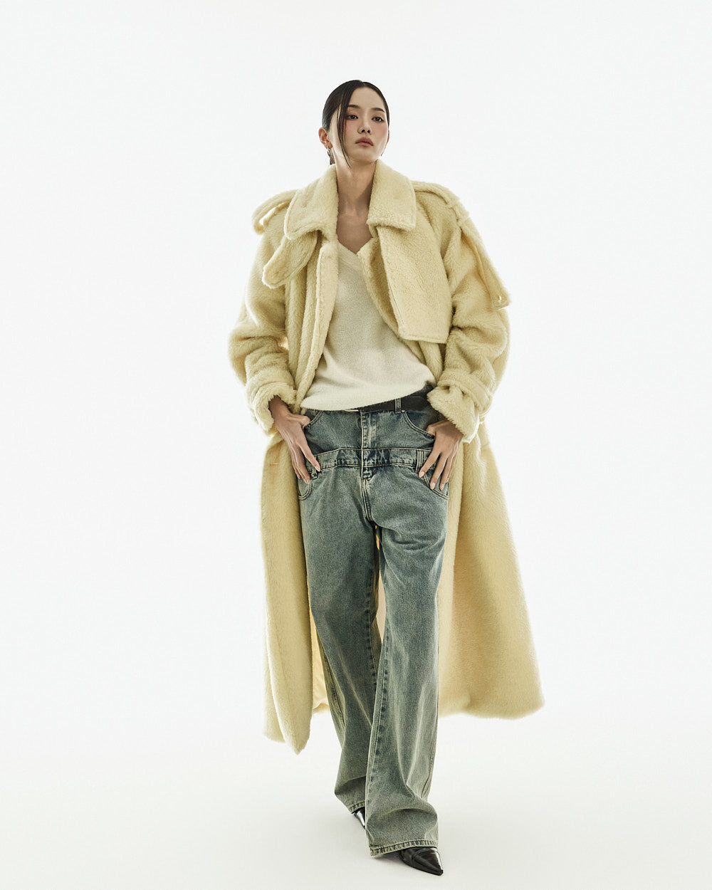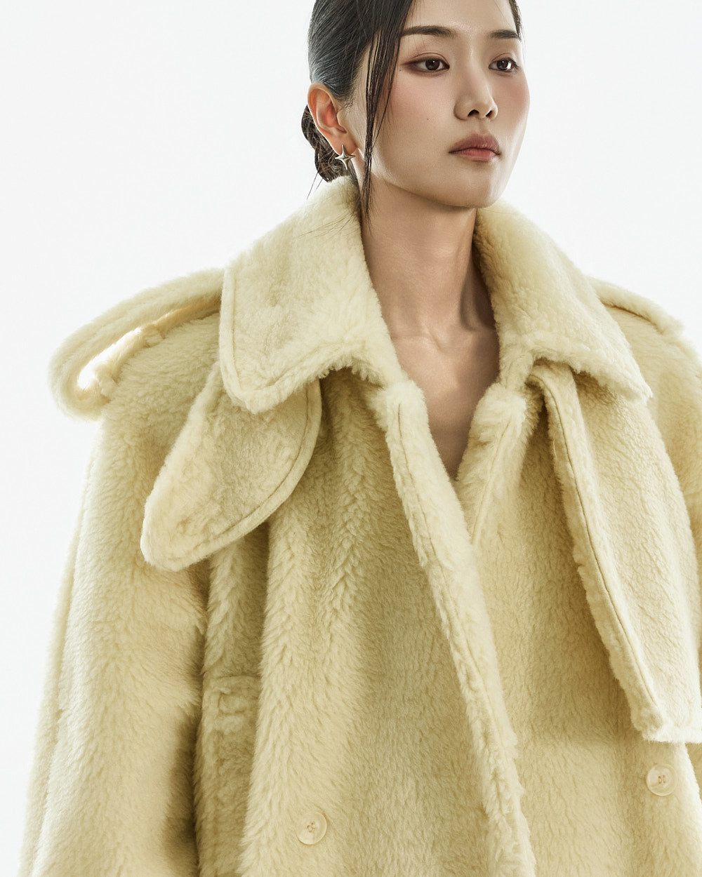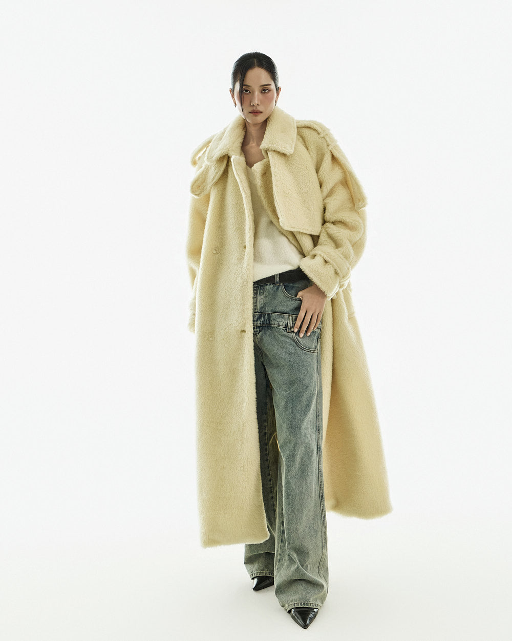 The coat is crafted from a polyester and acrylic blend of fur.