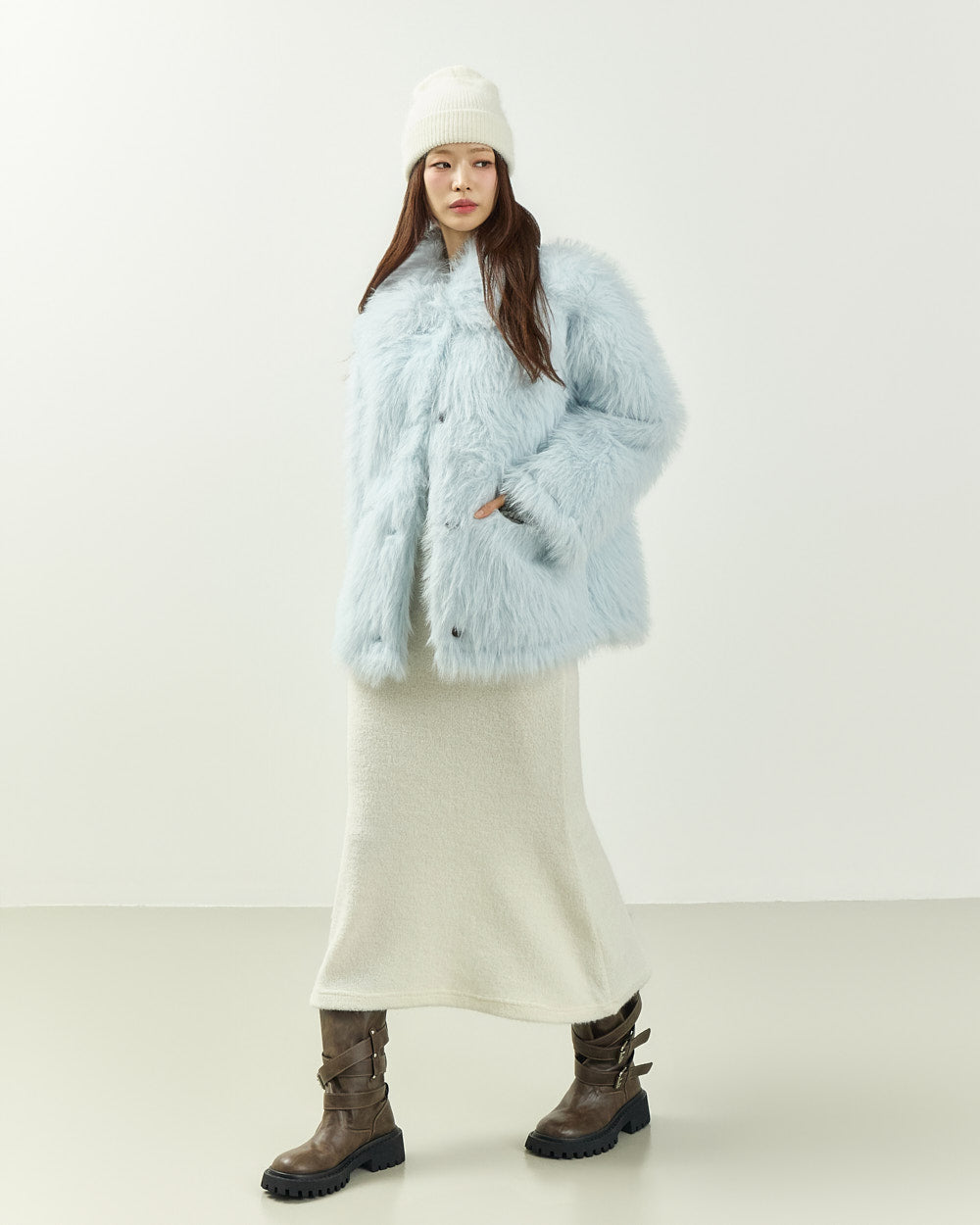 This hairy fur jacket exudes a romantic, feminine vibe.