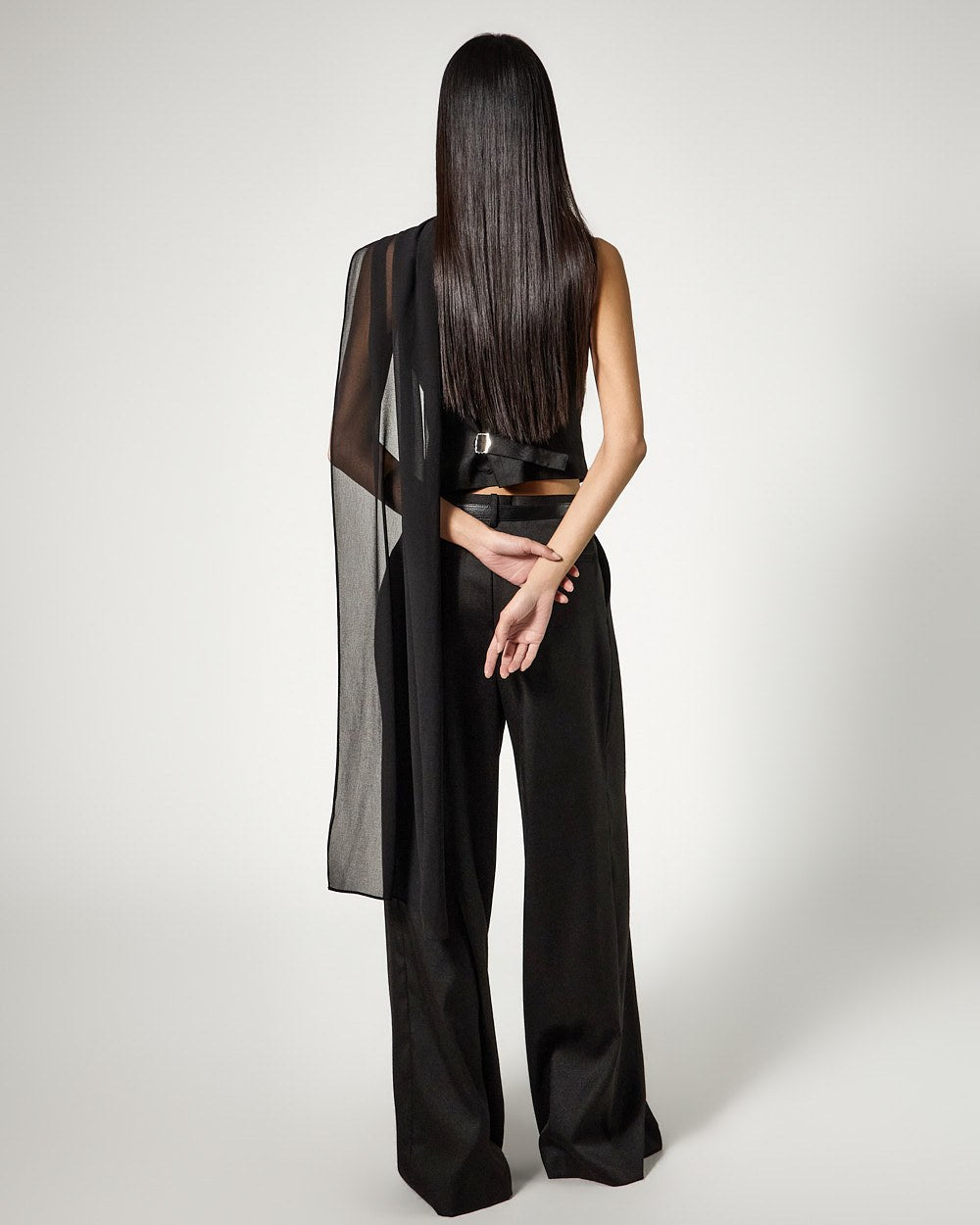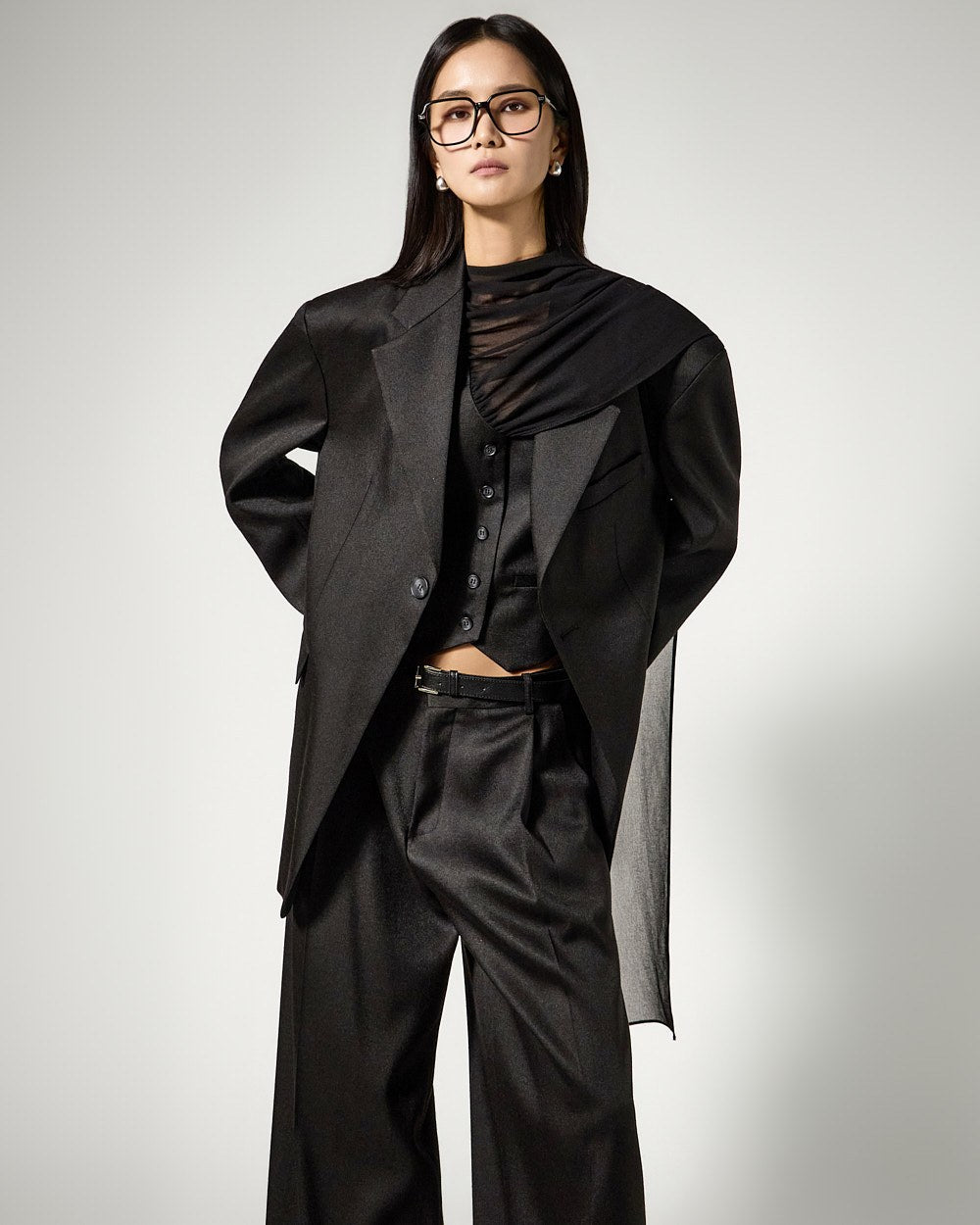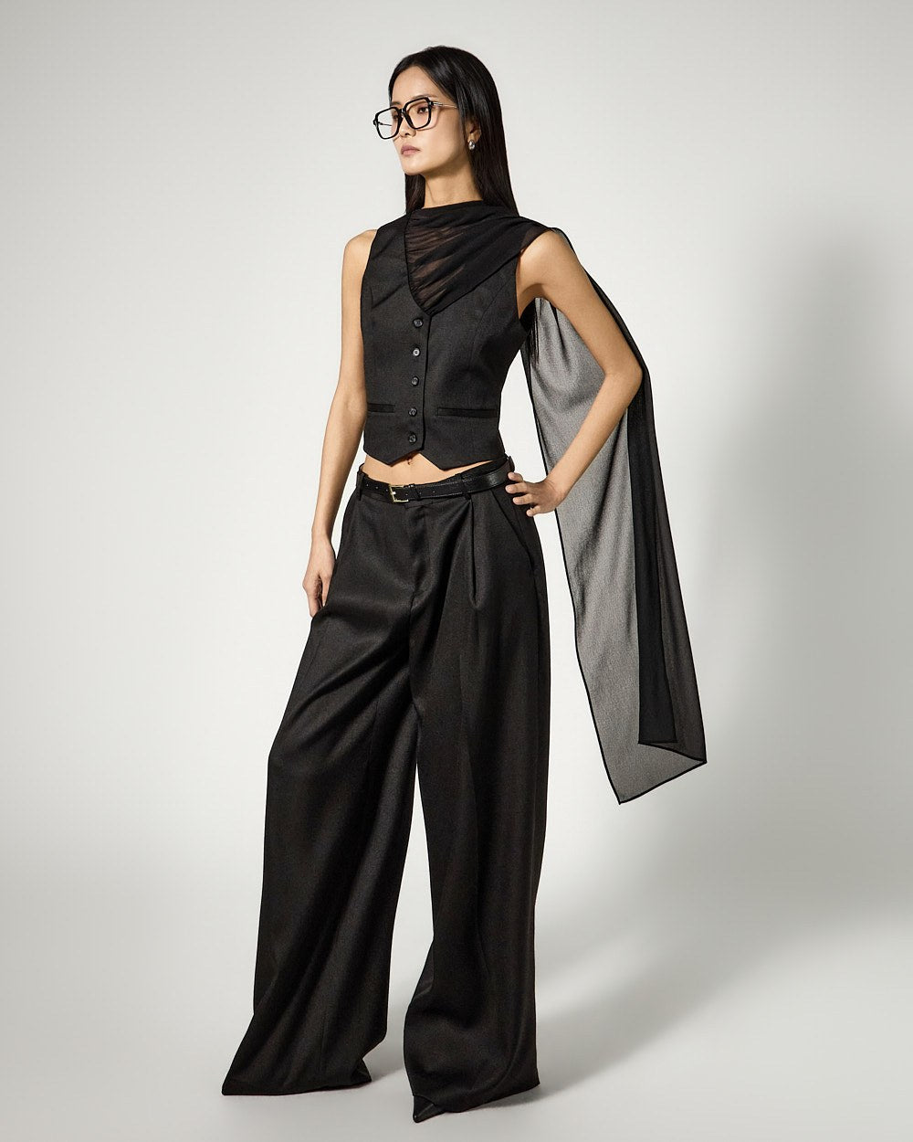 The layered scarf detail with added drape emphasizes an elegant atmosphere,