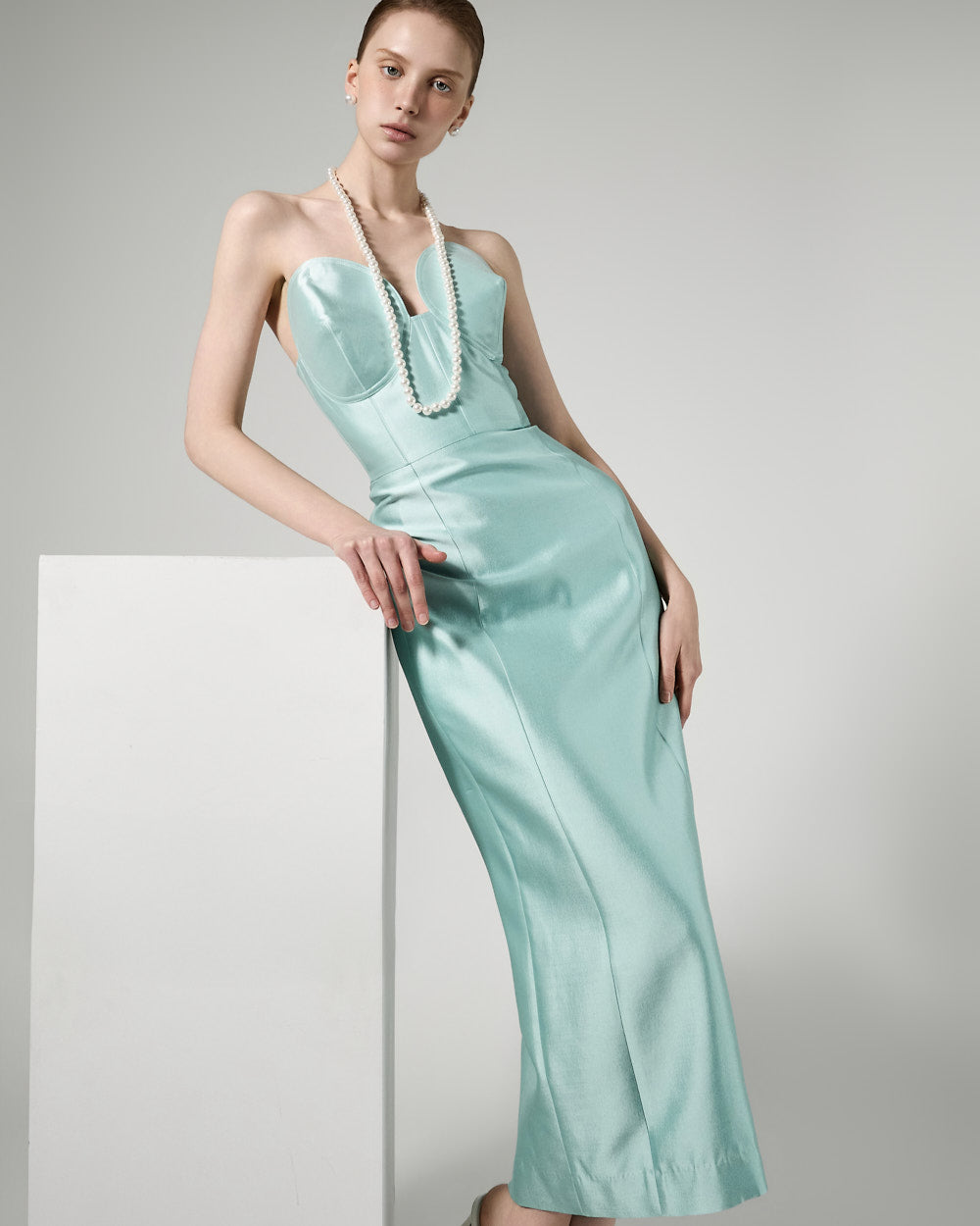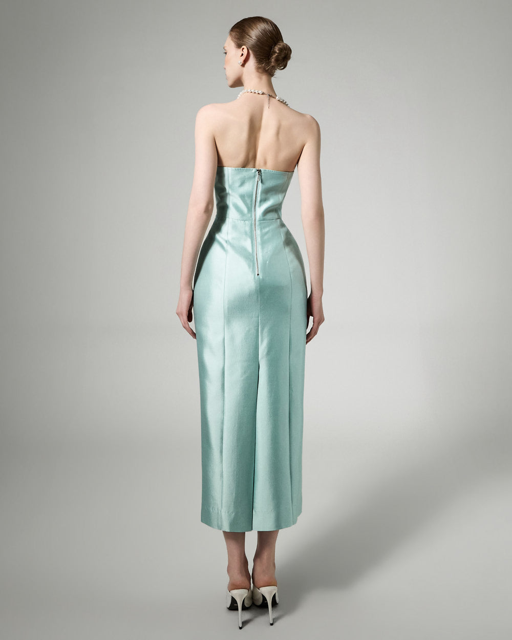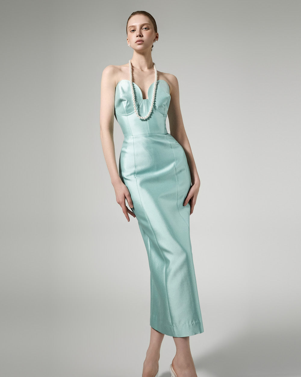 This slim-fit dress has a luxurious silhouette.