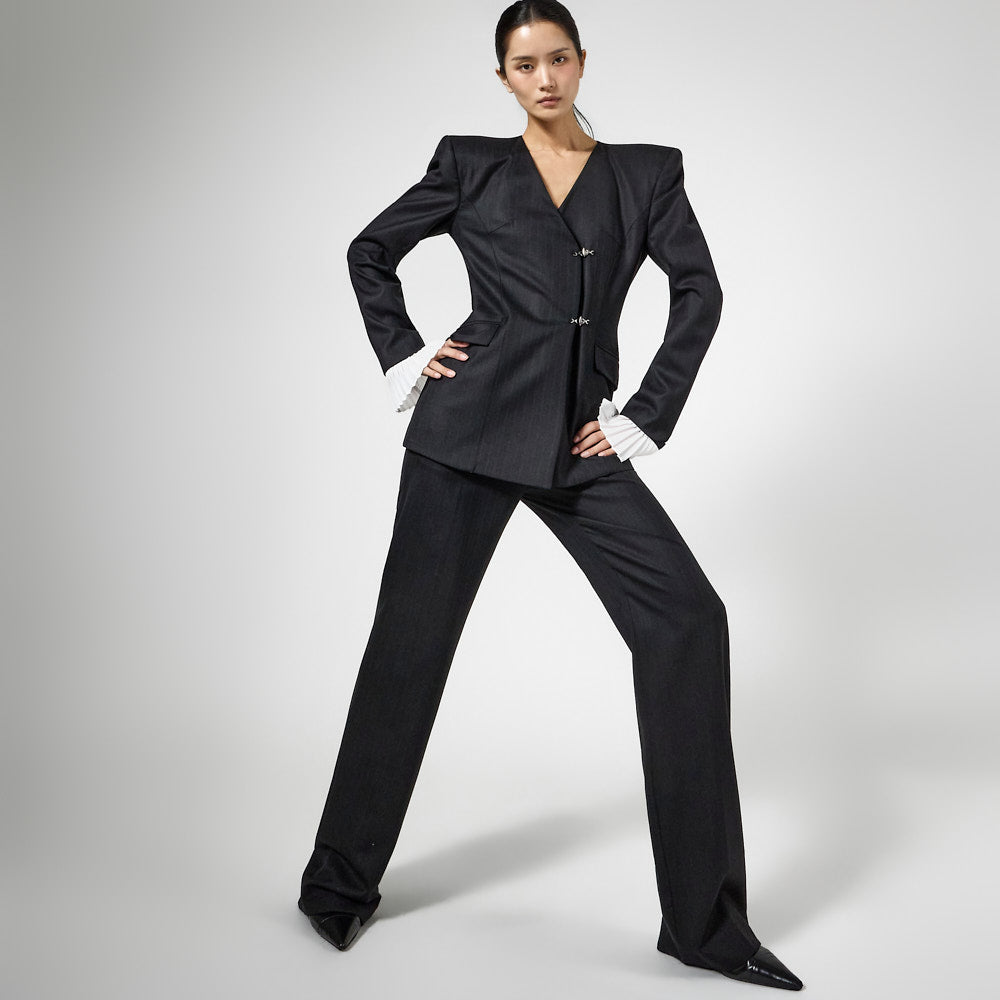 这是一套具有男性化轮廓的西装。