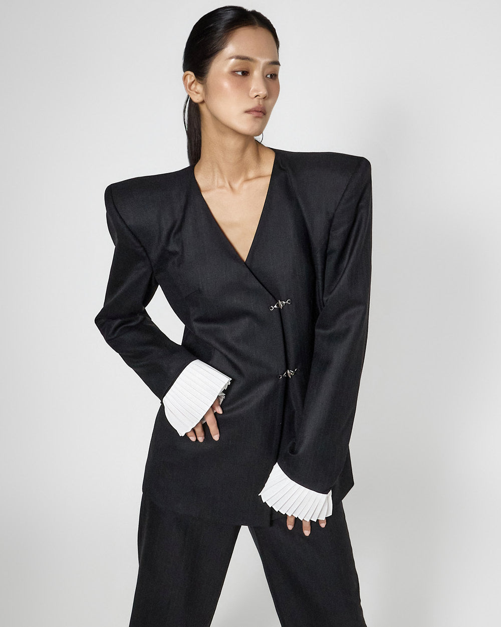 宽肩线上有厚垫,营造出丰盈的轮廓。