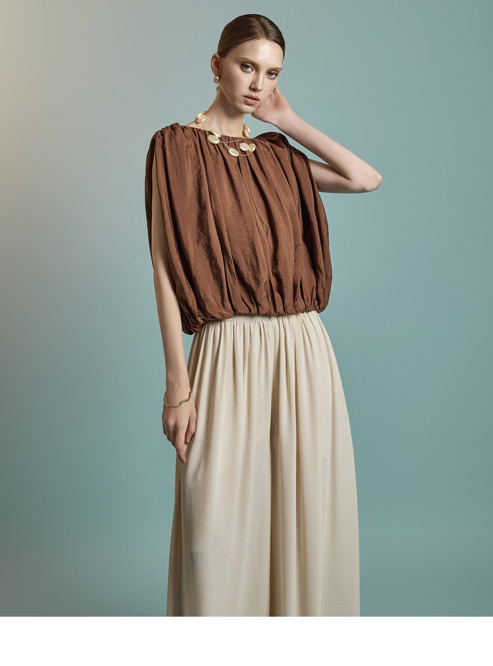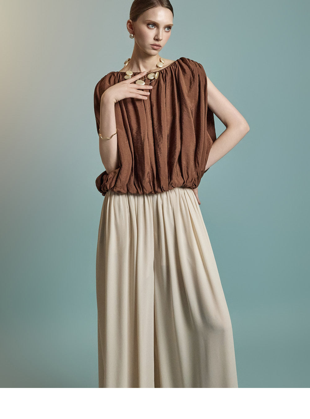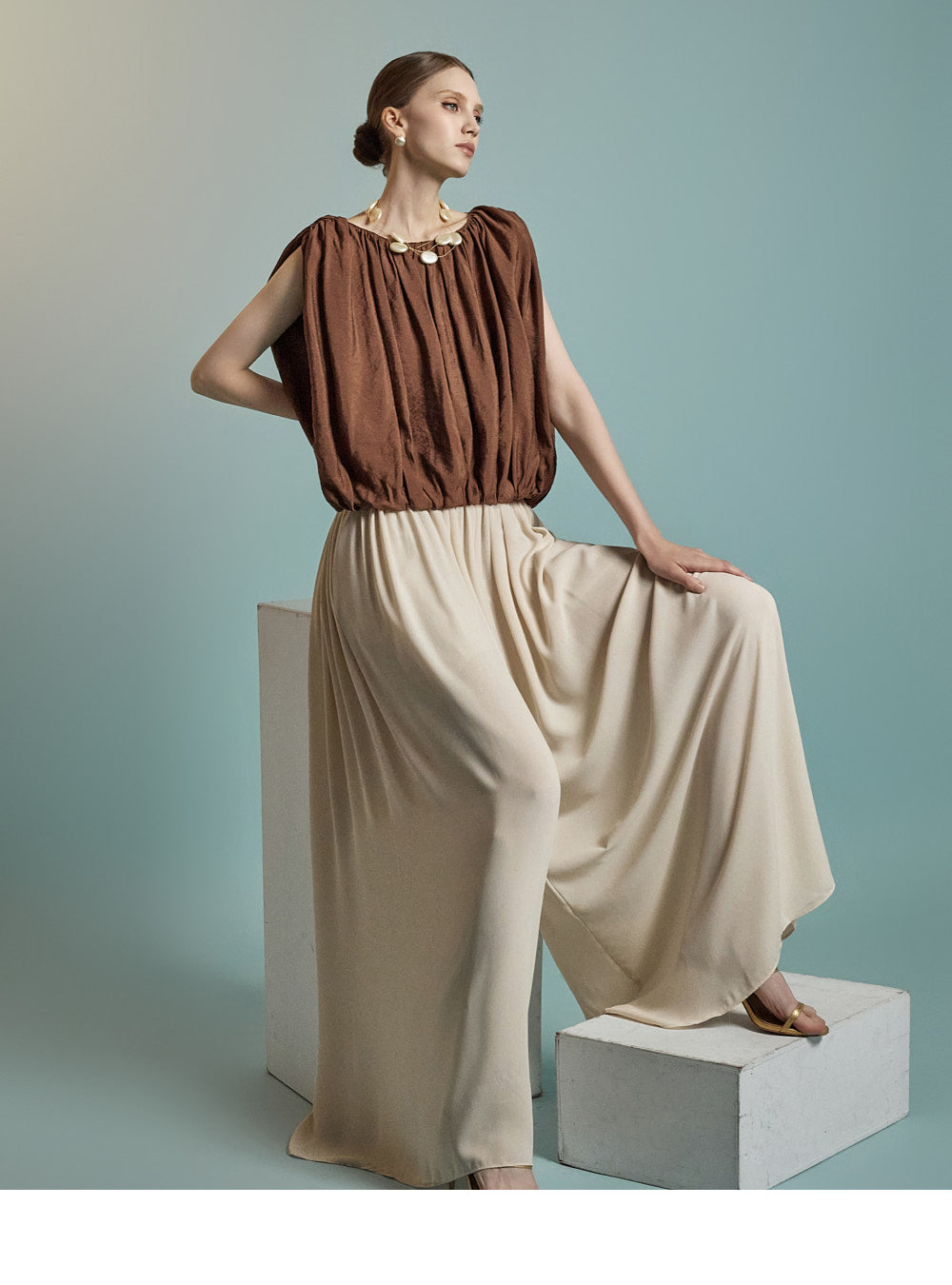 The loose wide-leg silhouette creates a graceful and stylish outline,