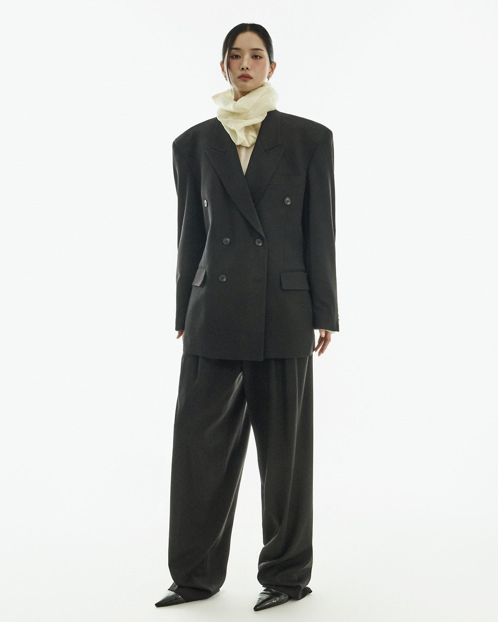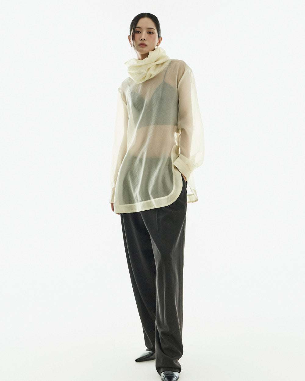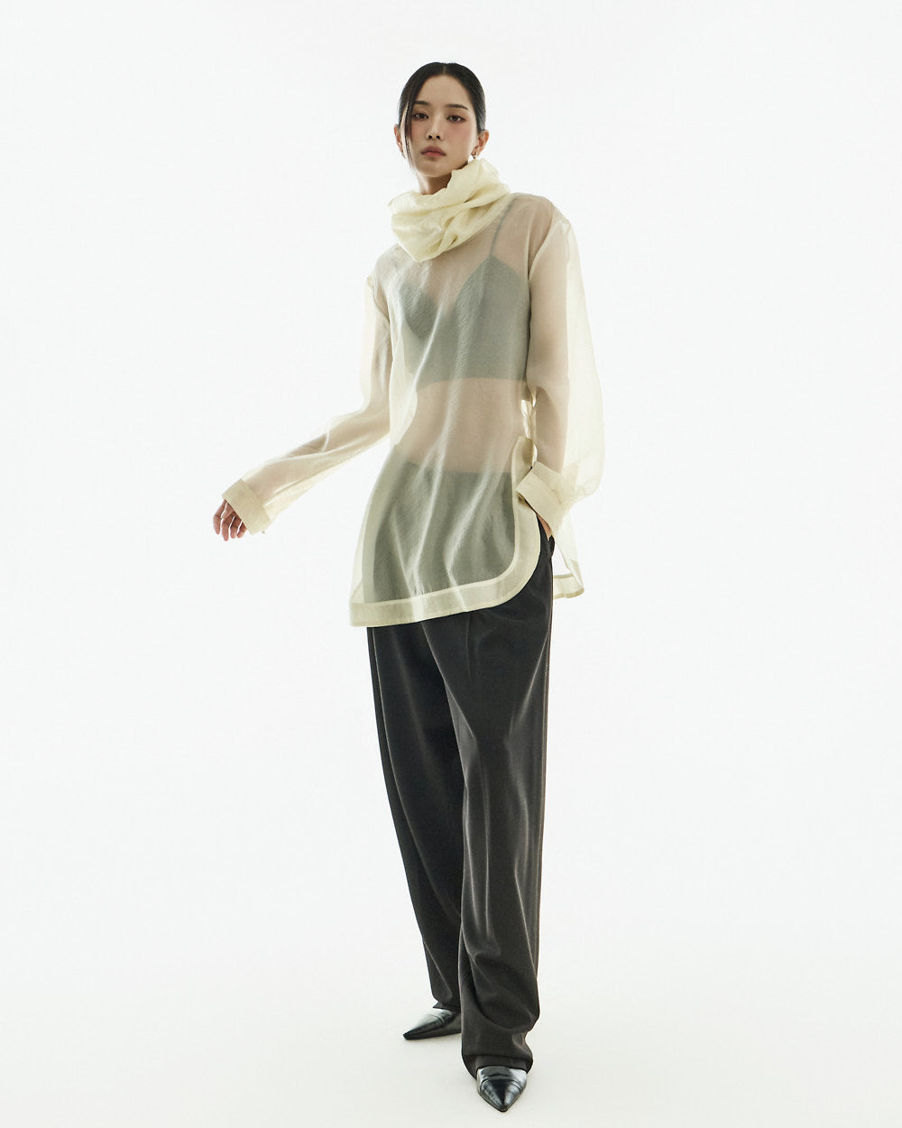 These curved slit slacks have a modern vibe.