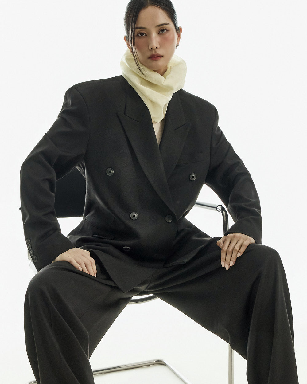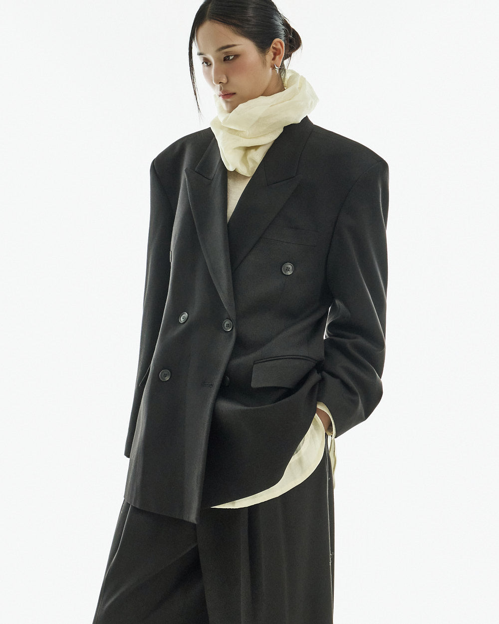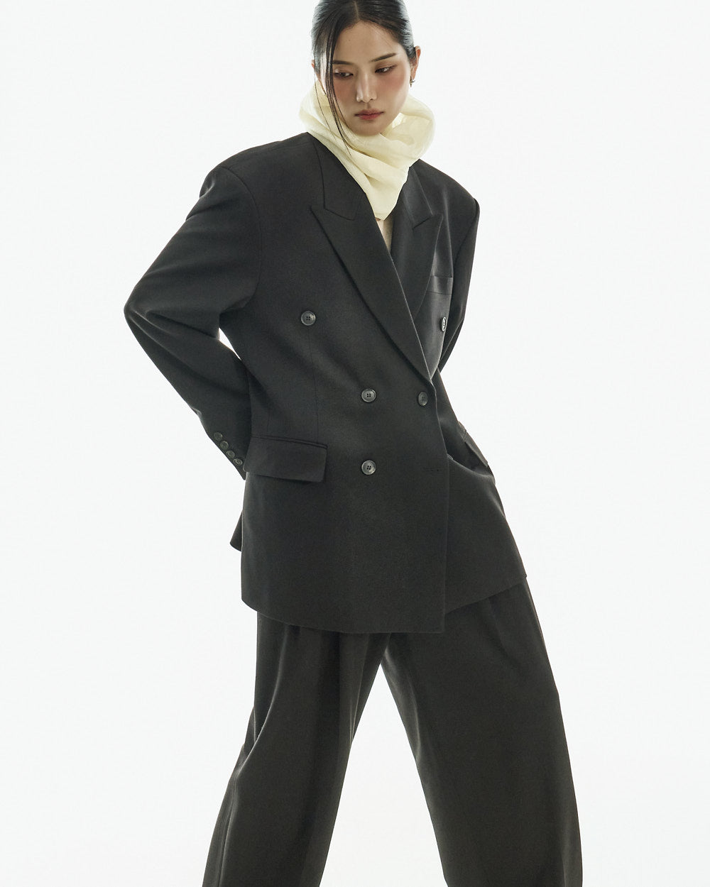 These curved slit slacks have a modern vibe.