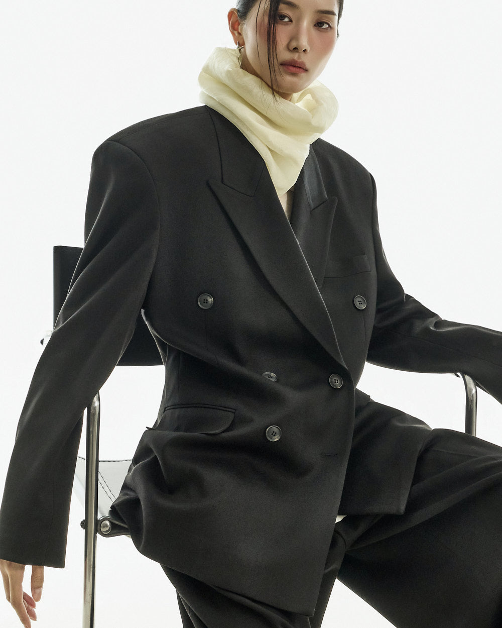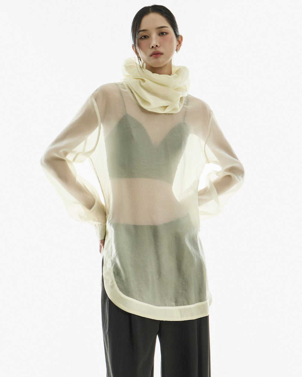 The pin tuck detail and low waist design accentuate the structured lines.