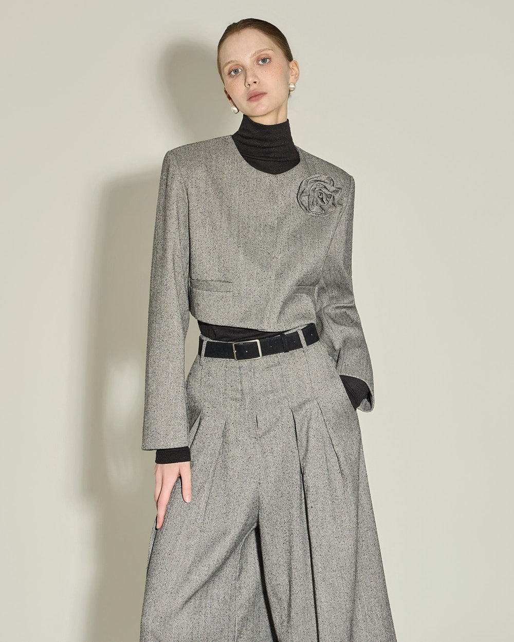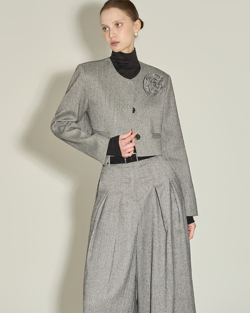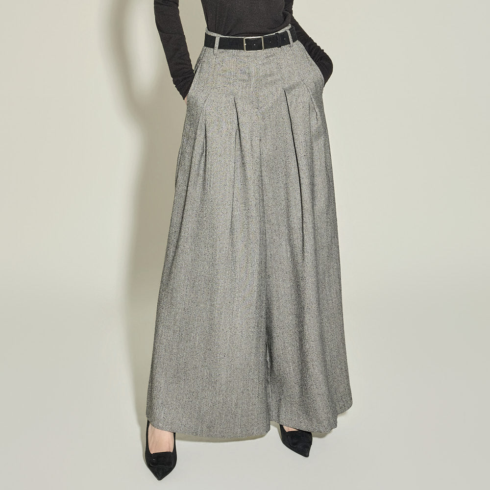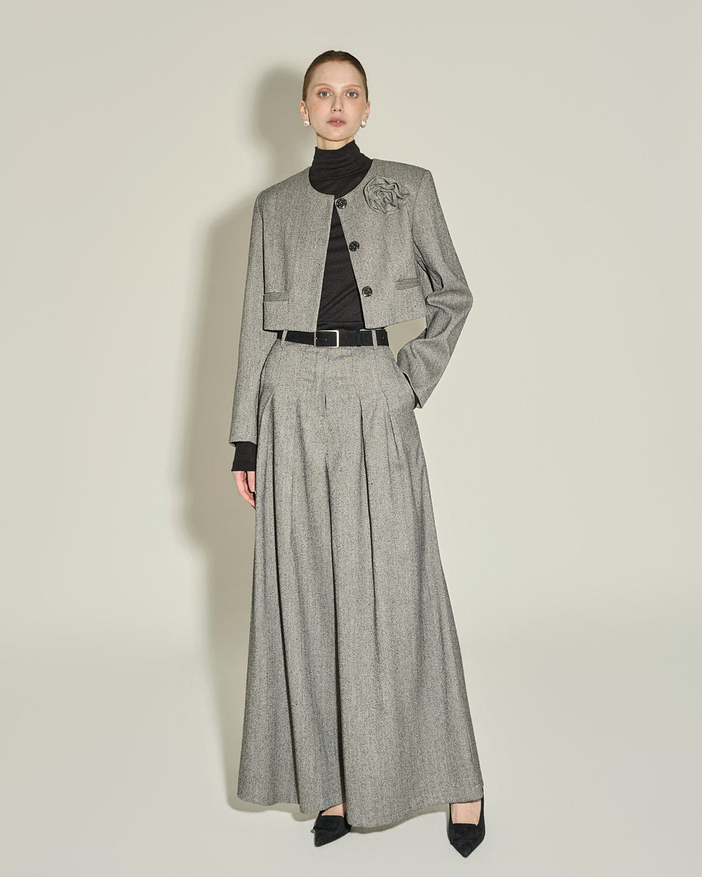 The wide flared fit and front pintuck detailing