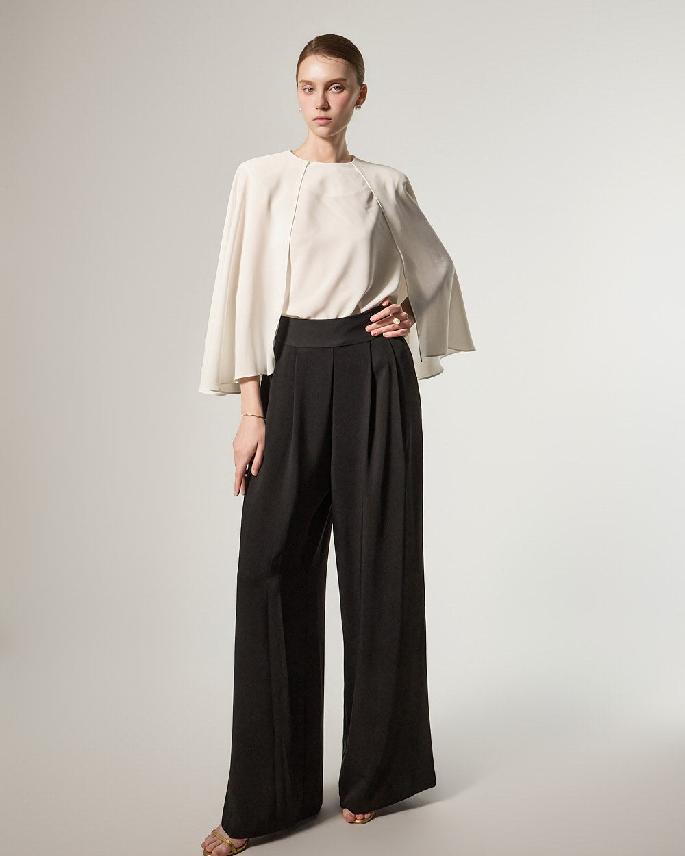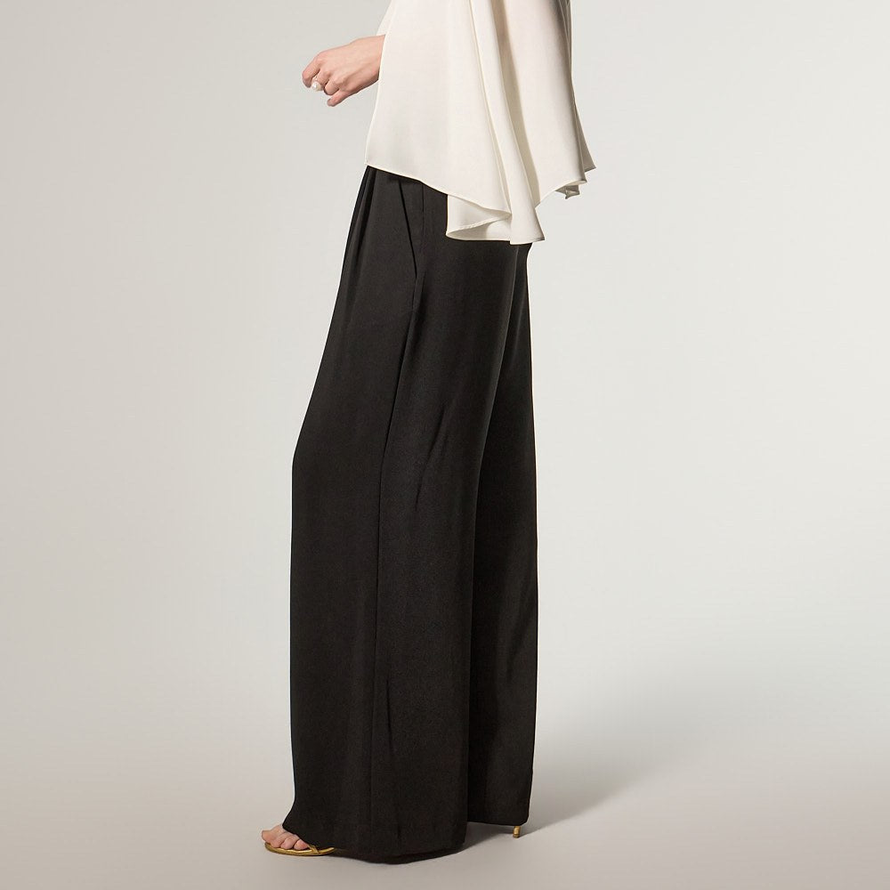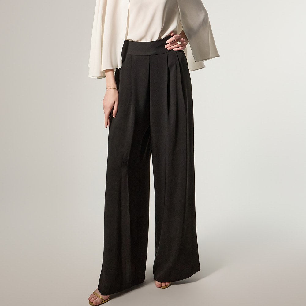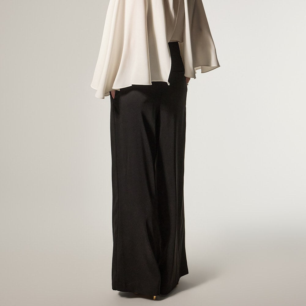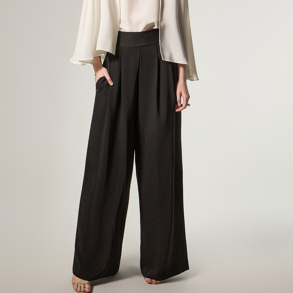这是一款宽腿裤,散发着精致优雅的氛围。