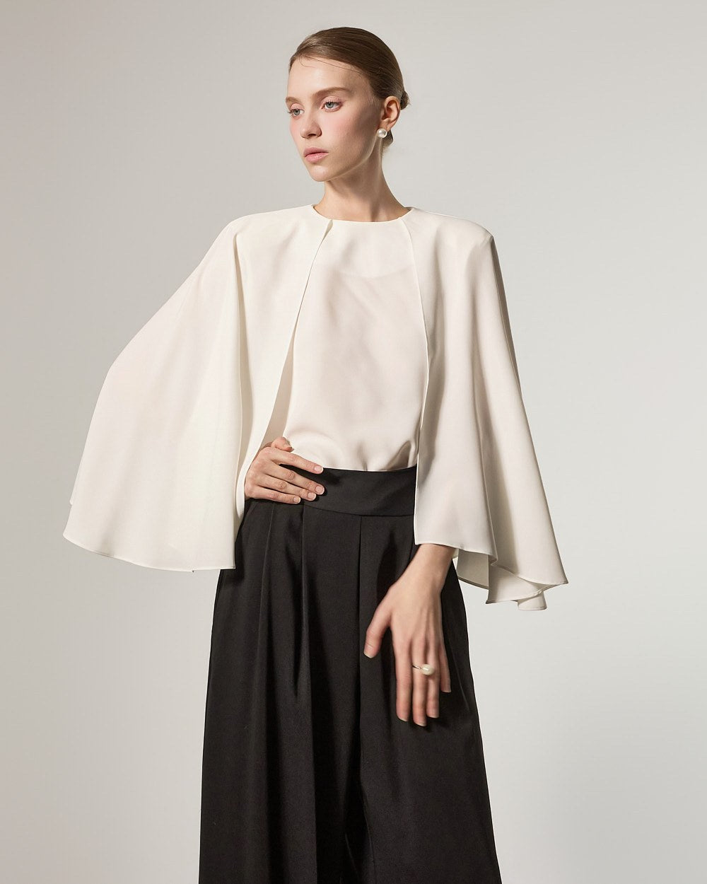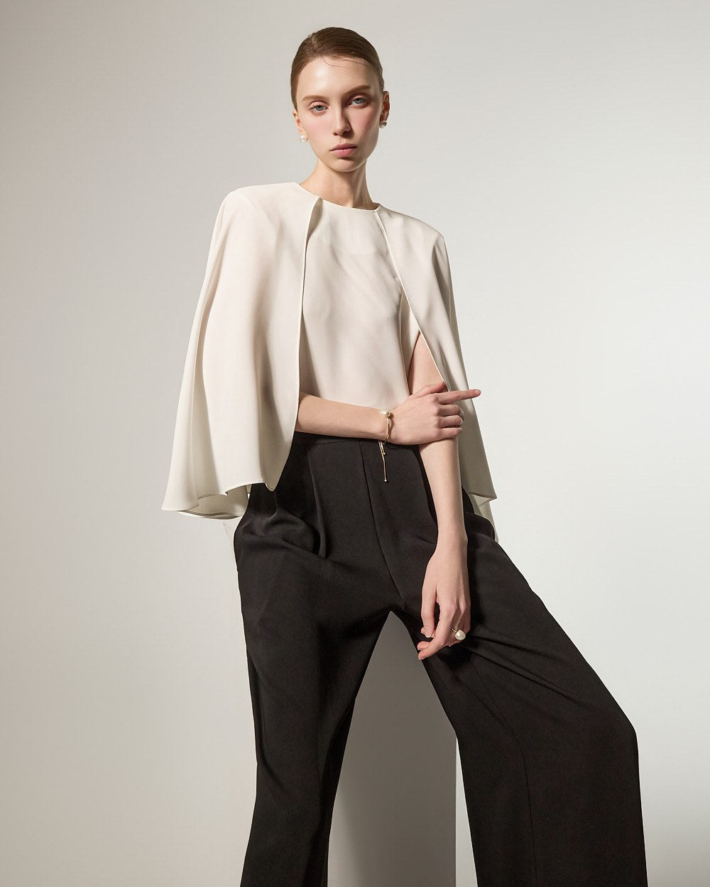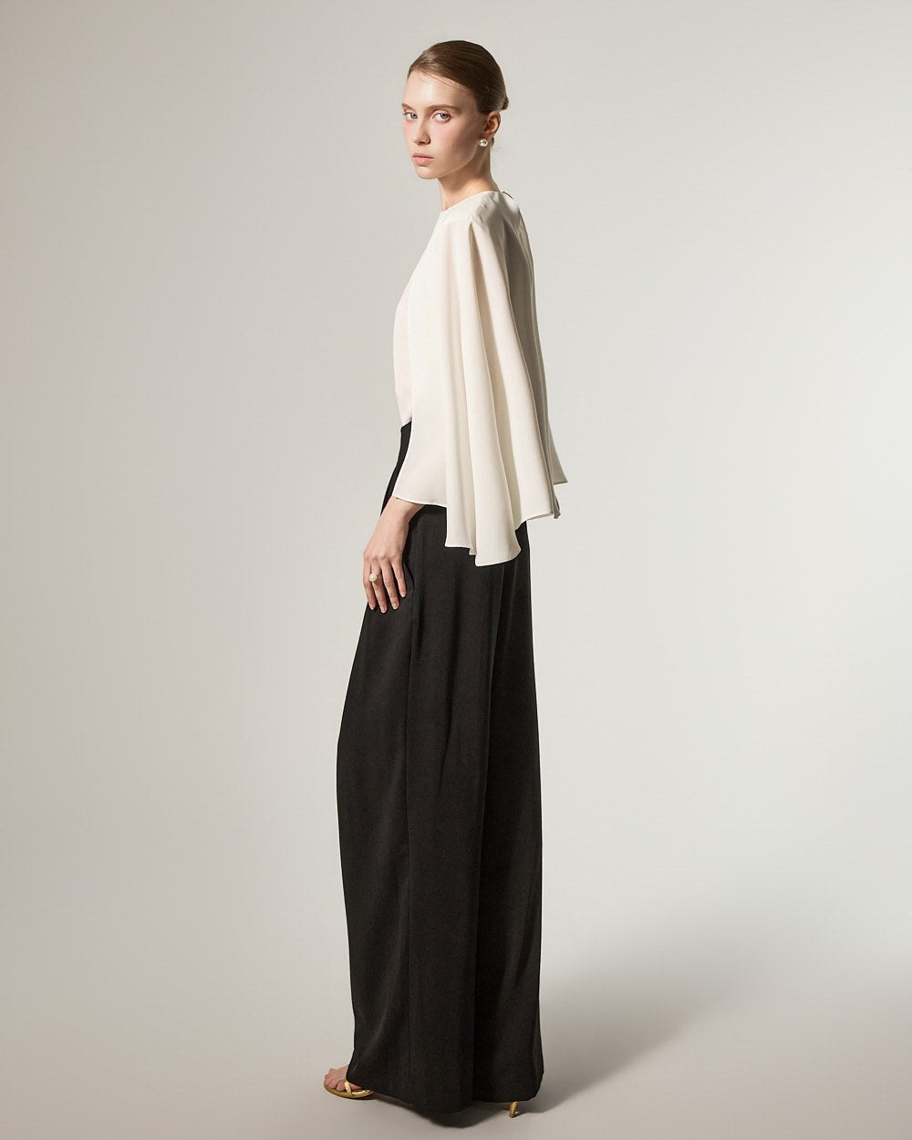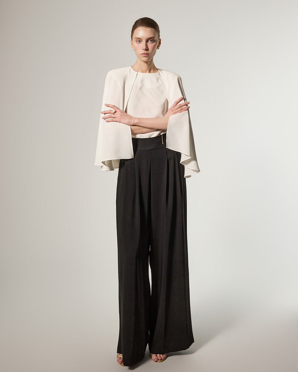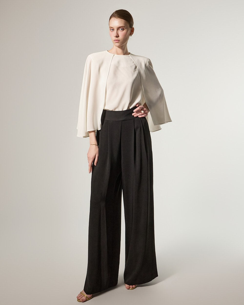 这是一款宽腿裤,散发着精致优雅的氛围。
