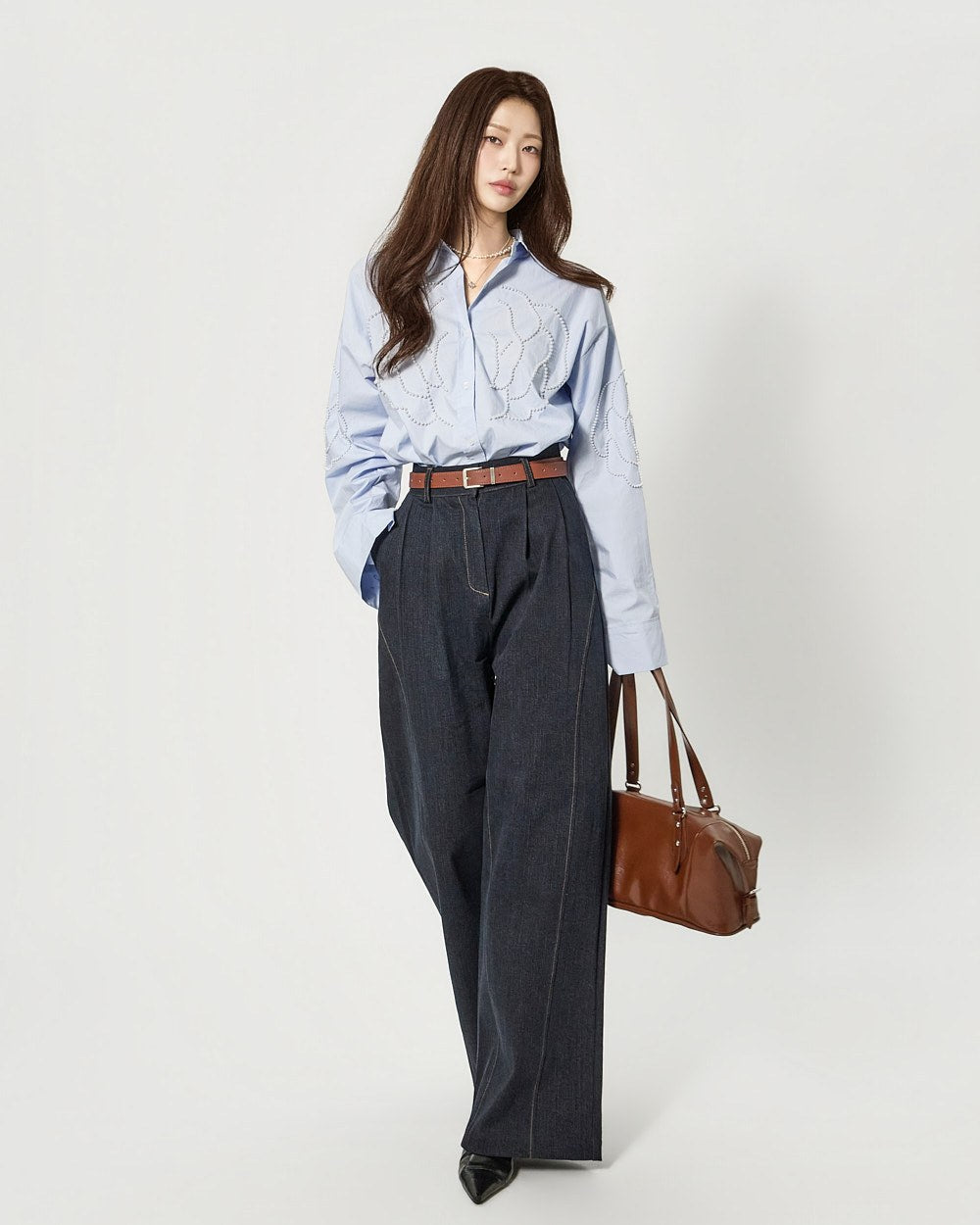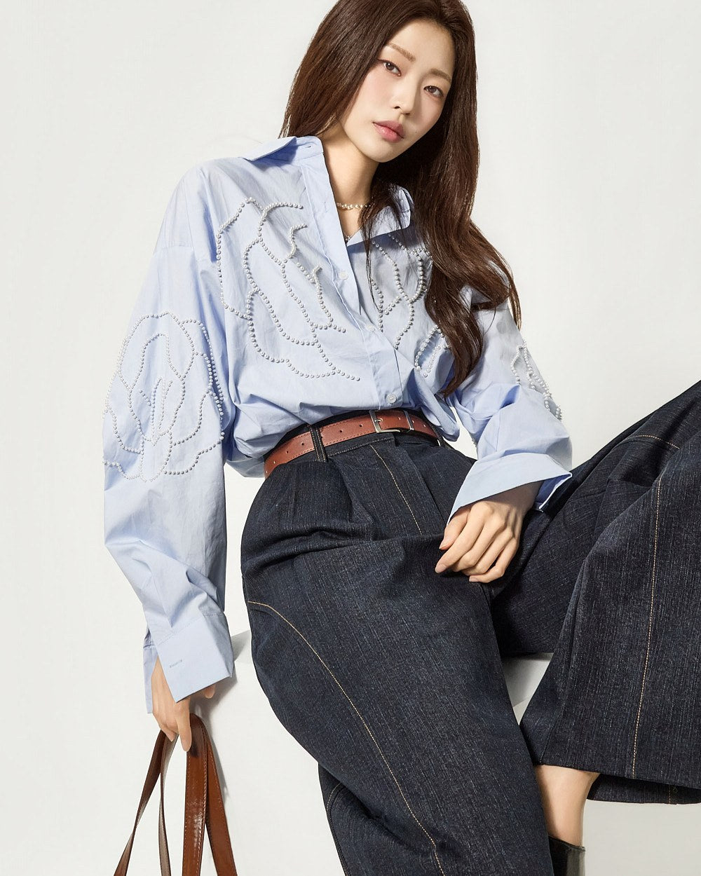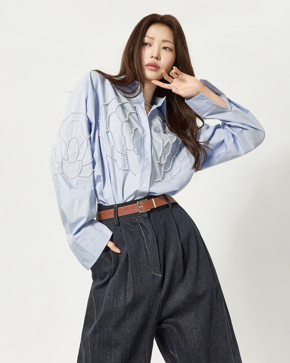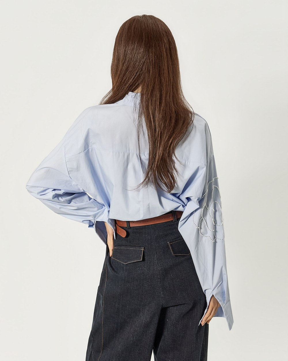这款衬衫饰有引人注目的珍珠玫瑰细节。