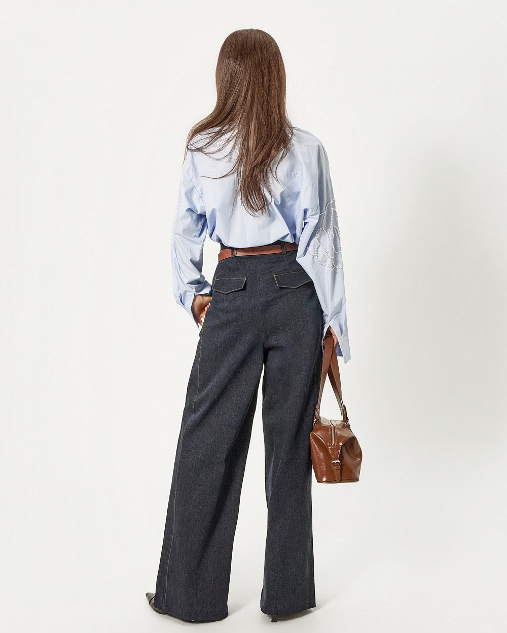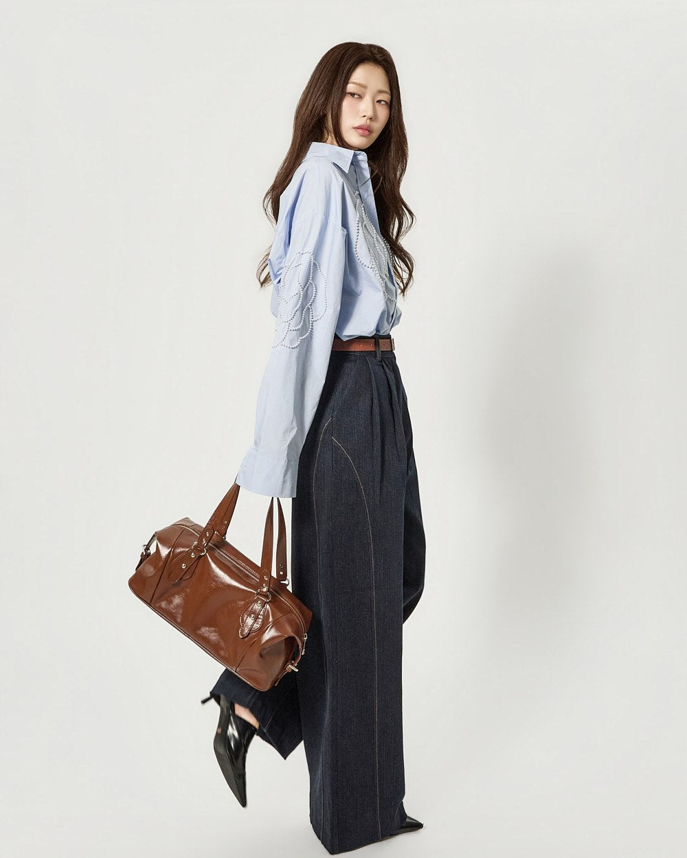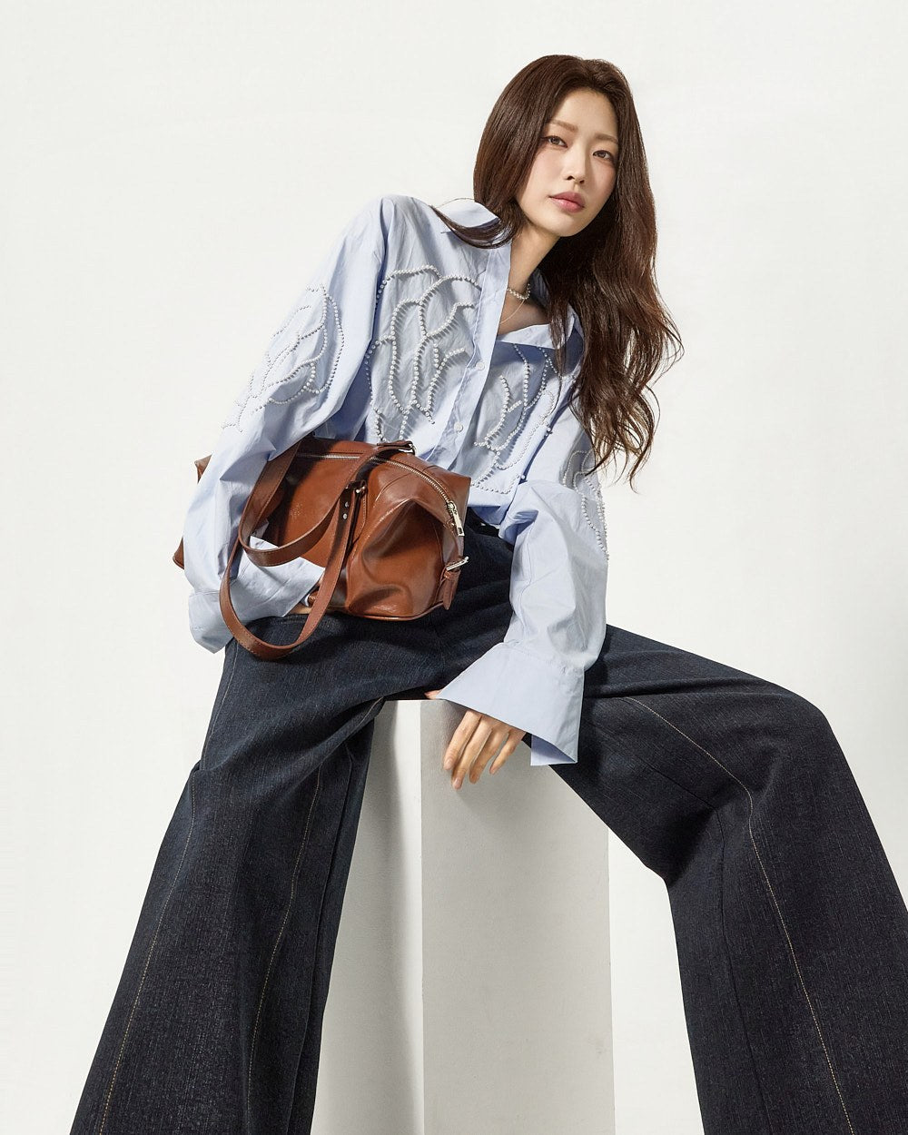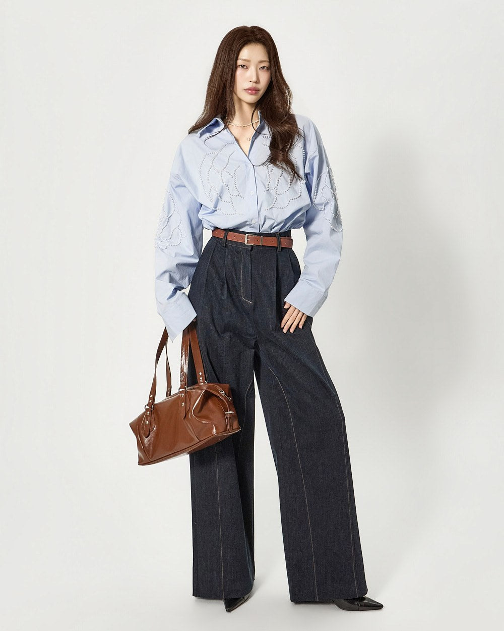 这款衬衫饰有引人注目的珍珠玫瑰细节。