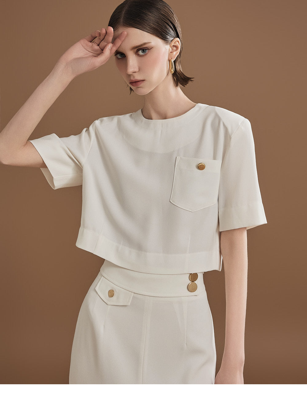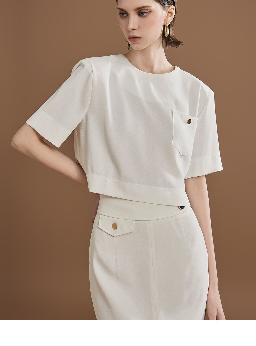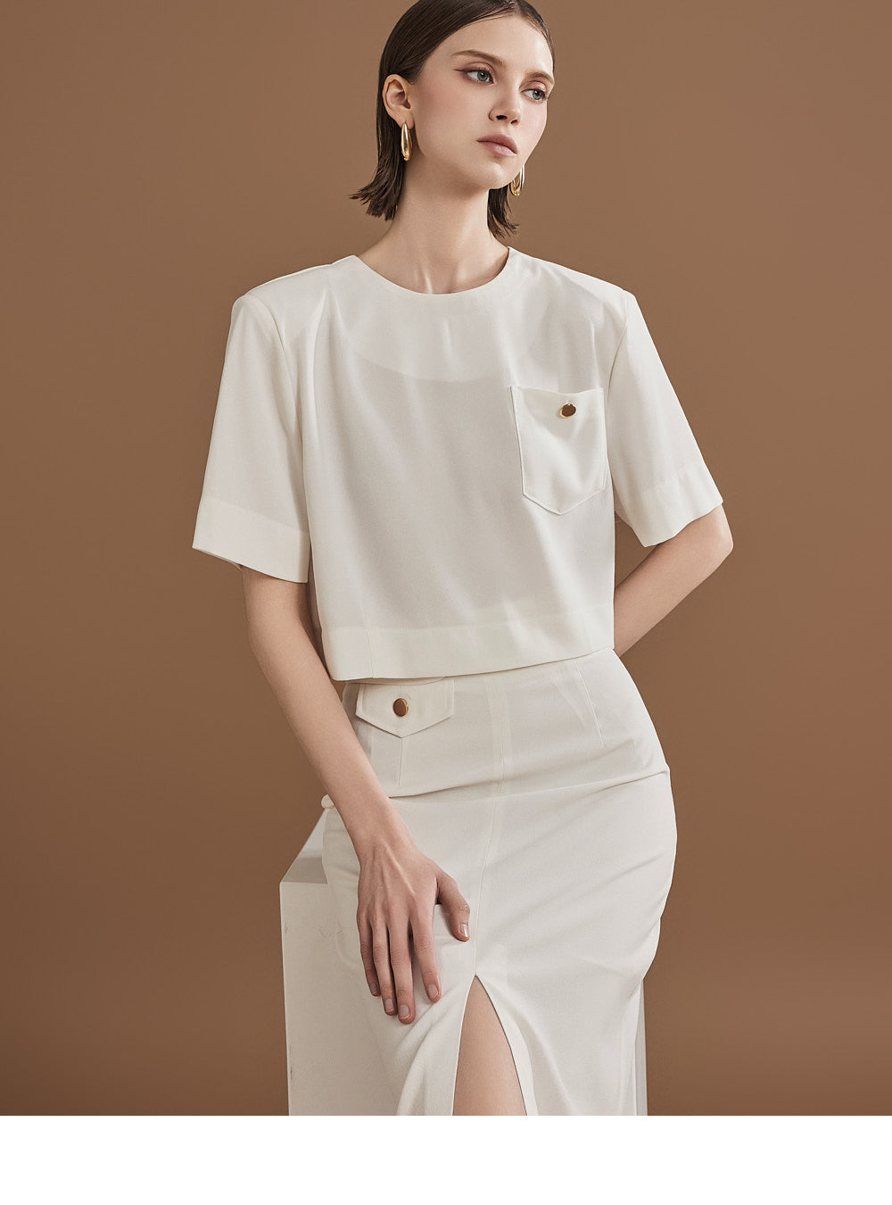 由身高 174 厘米的模特展示,穿着 S 码的白色衣服。