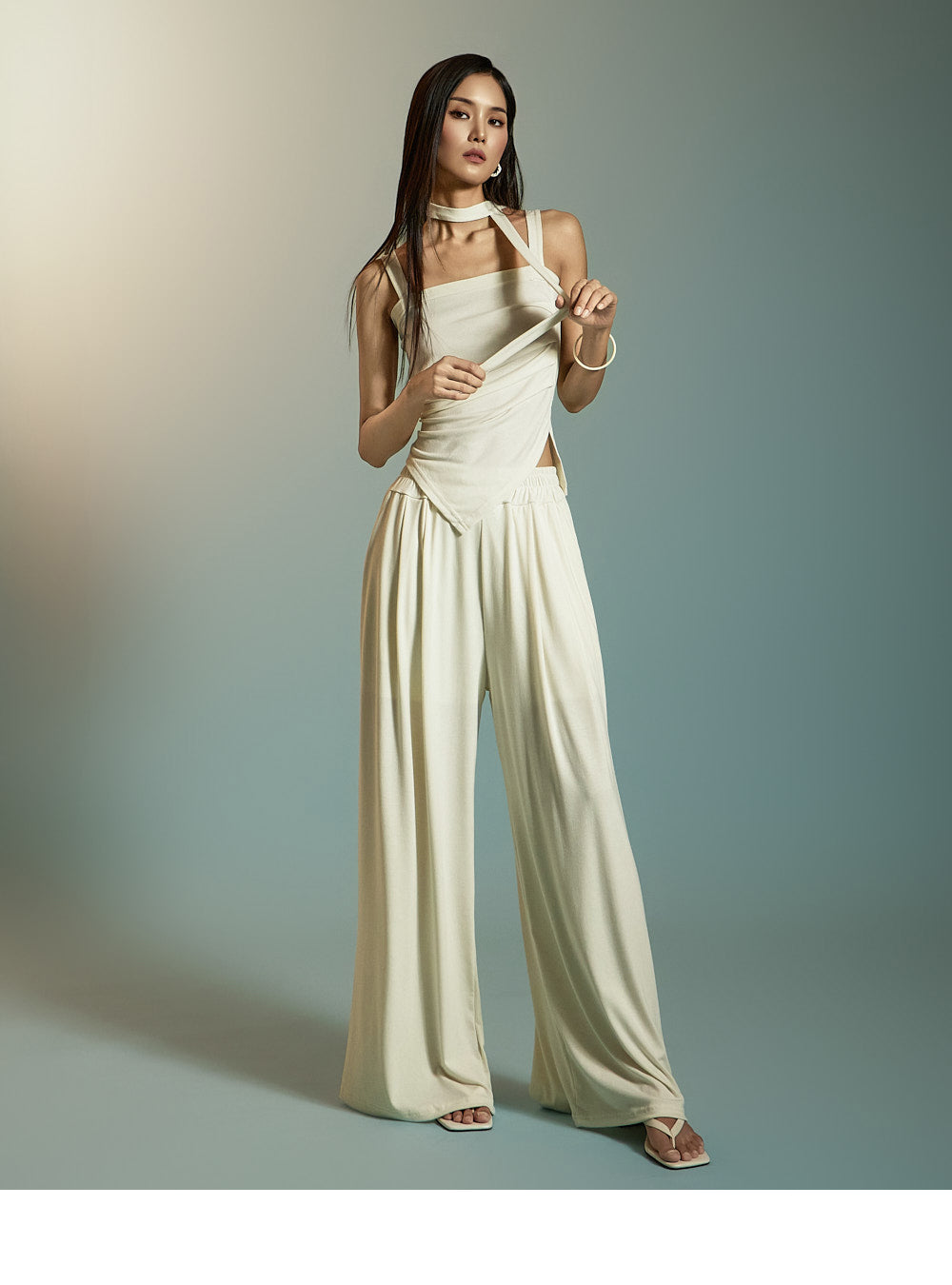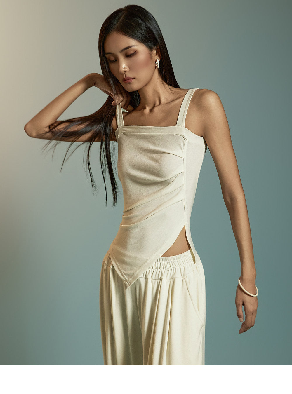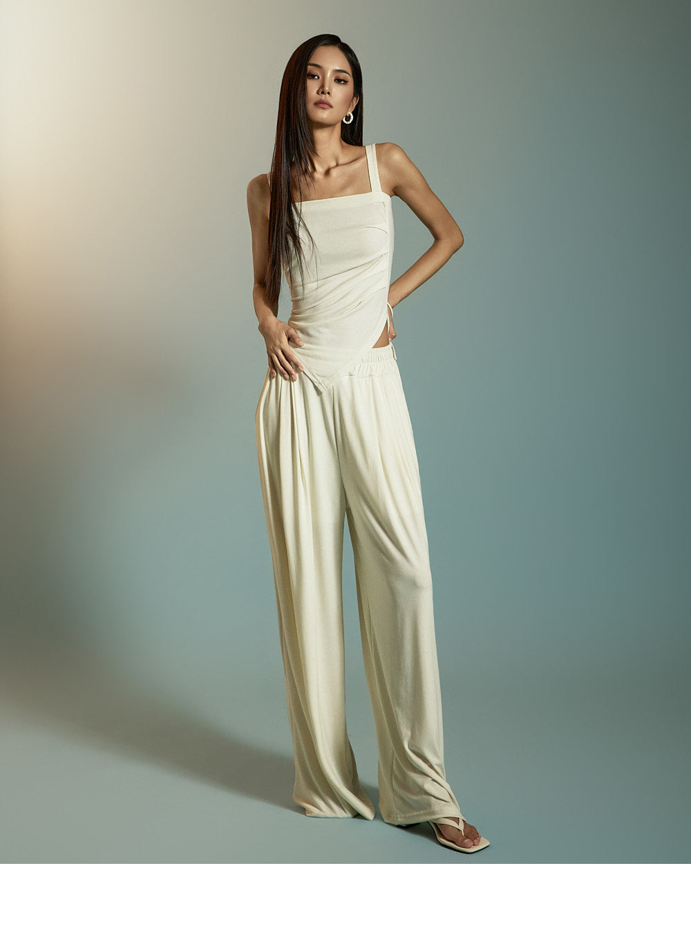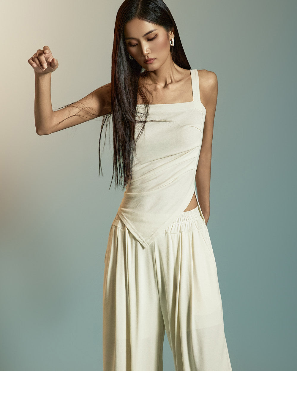 模特身高 173 厘米,穿均码象牙色服装。