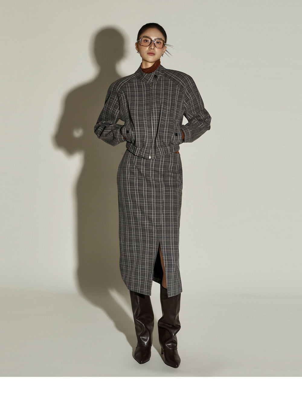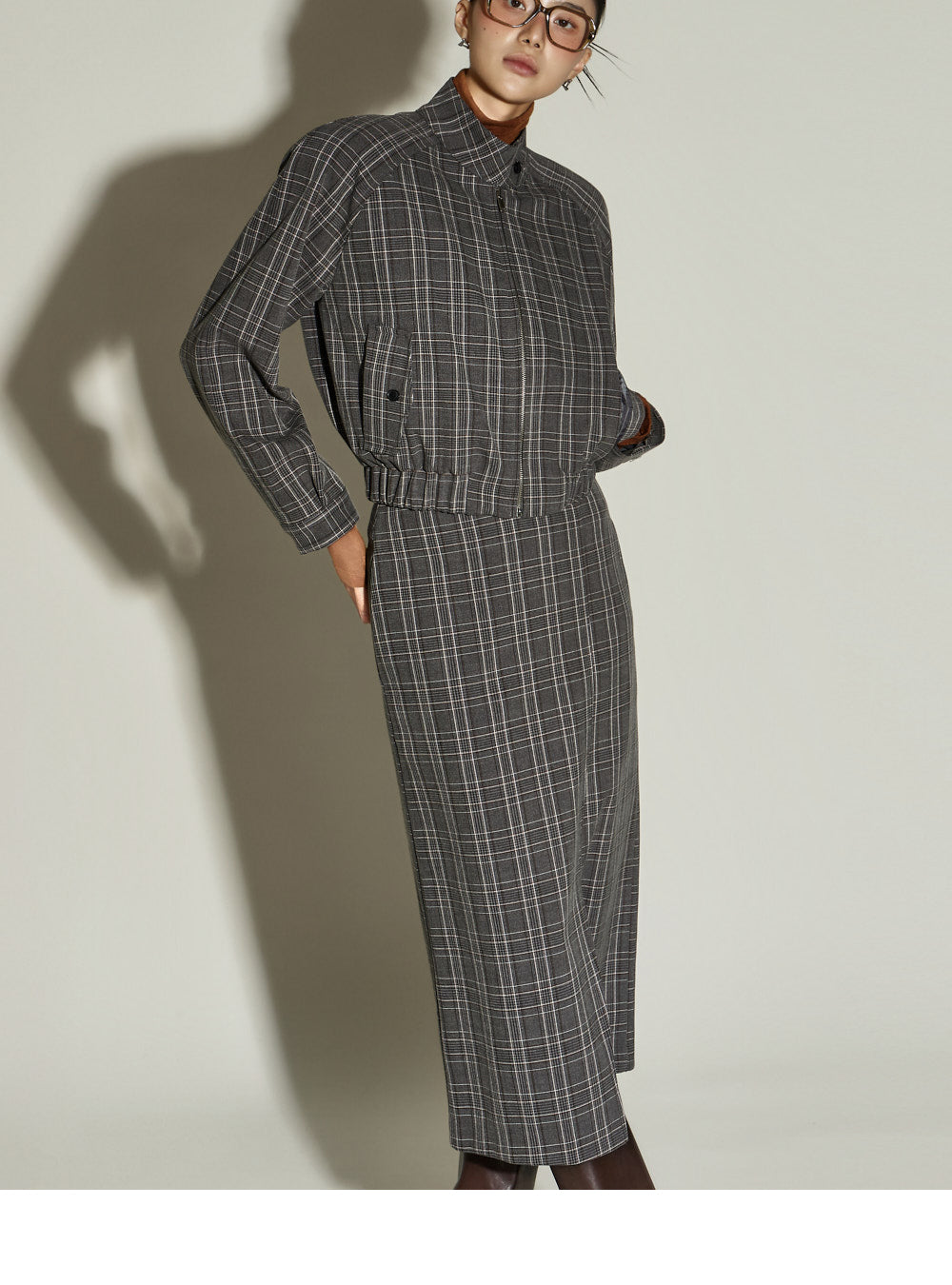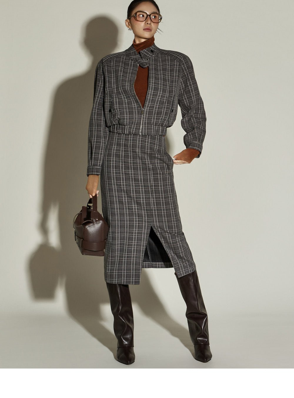 The skirt, with its H-line midi length, creates a neat silhouette,