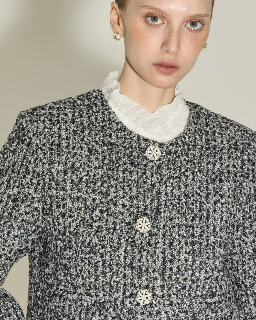 The jacket, with its no-collar design and short length,