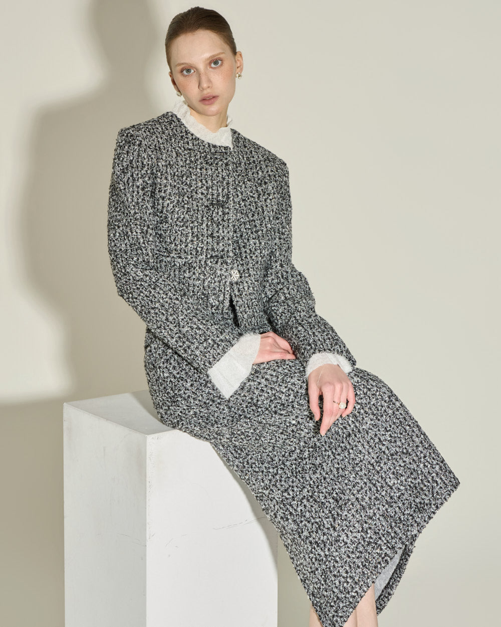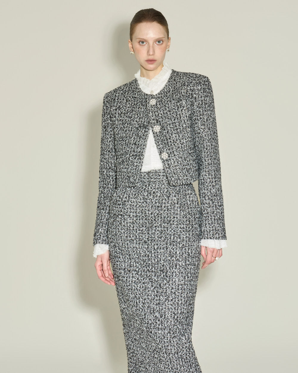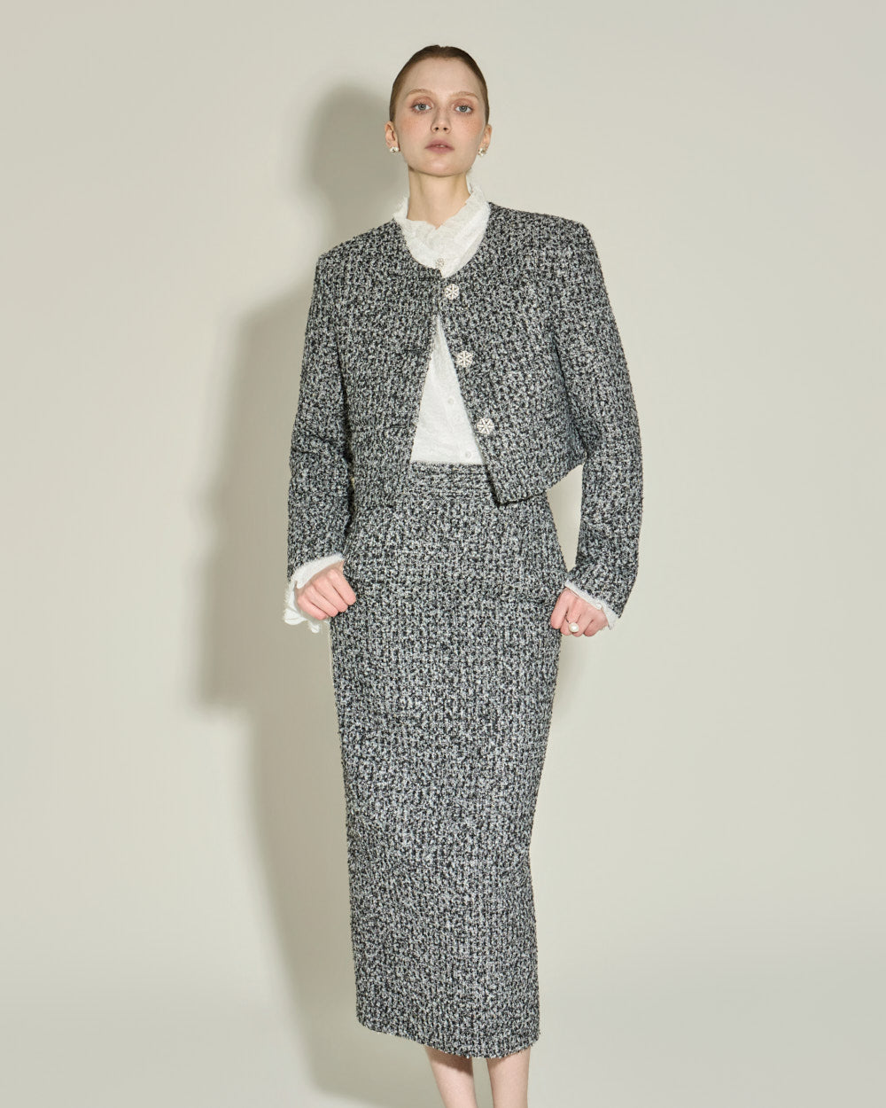 Model (174cm) is wearing the jacket (ONE) and skirt (S),