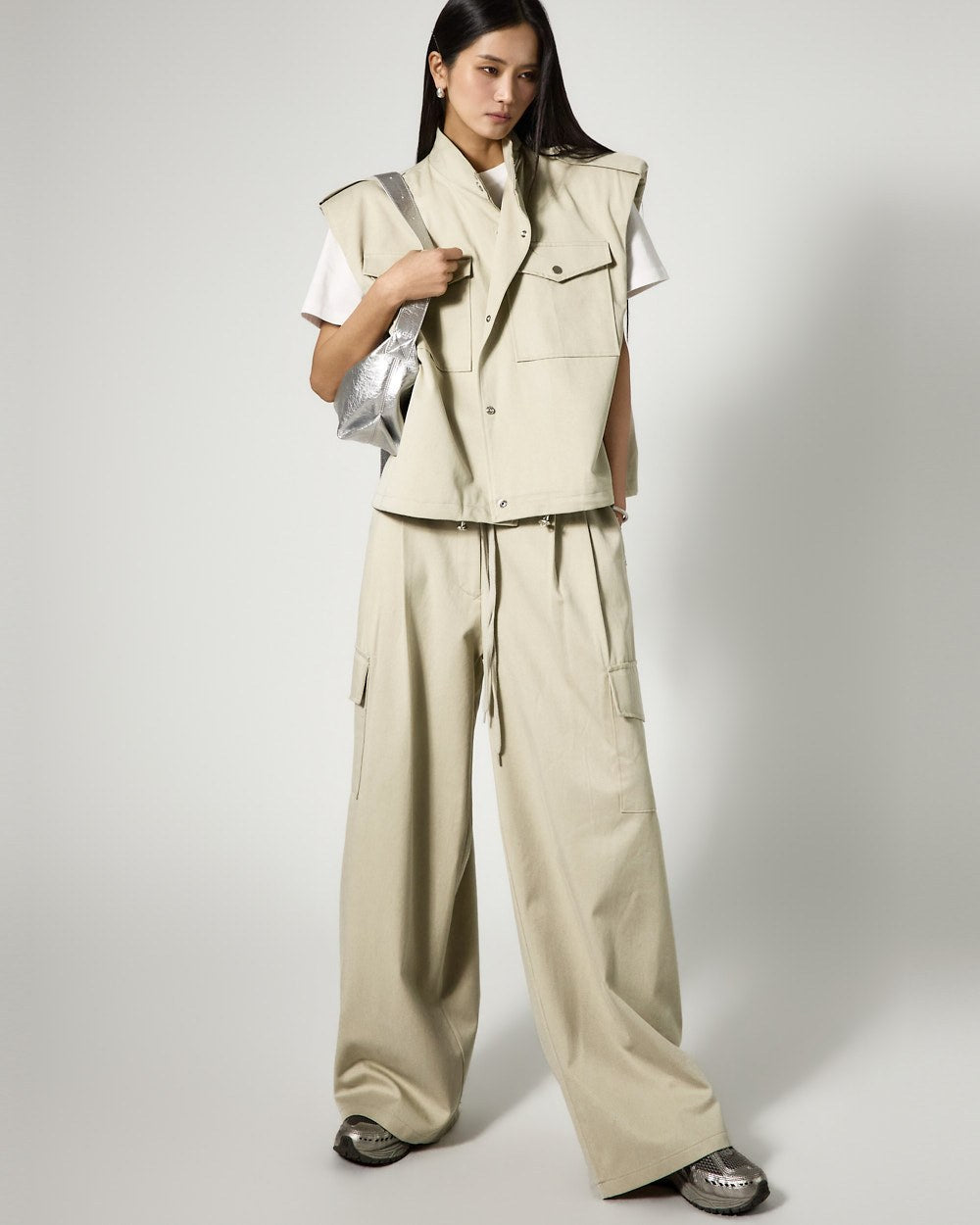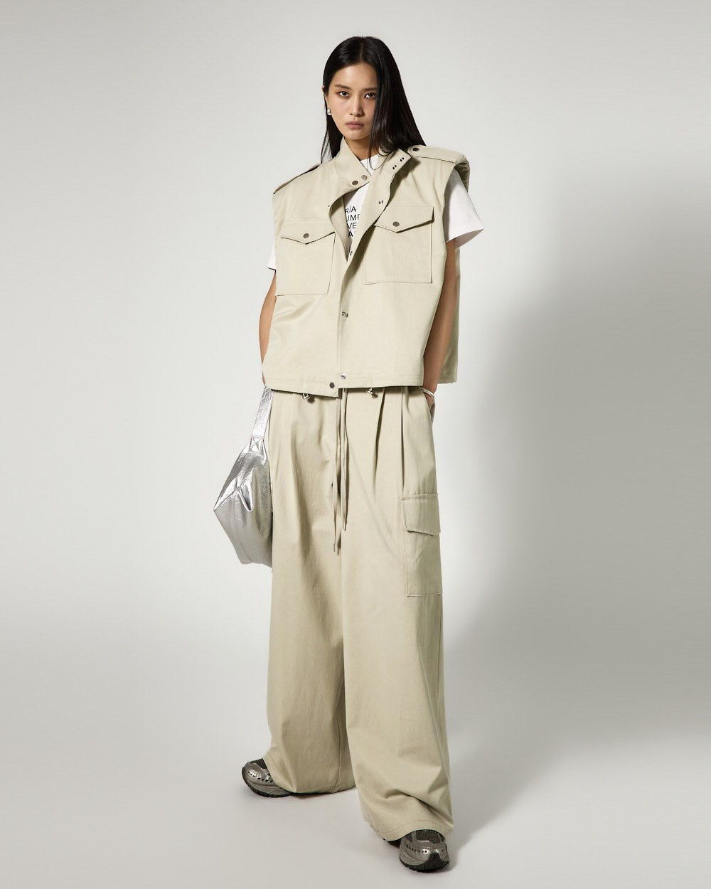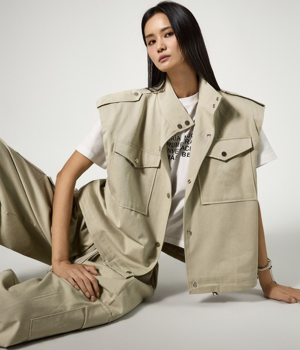 The vest features an oversized silhouette and a drawstring at the hem,