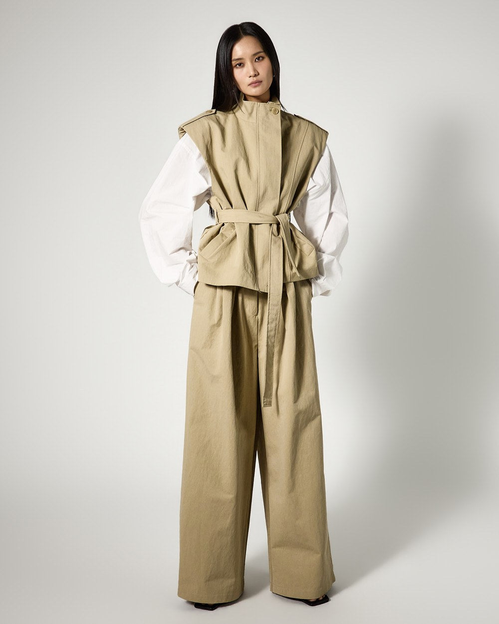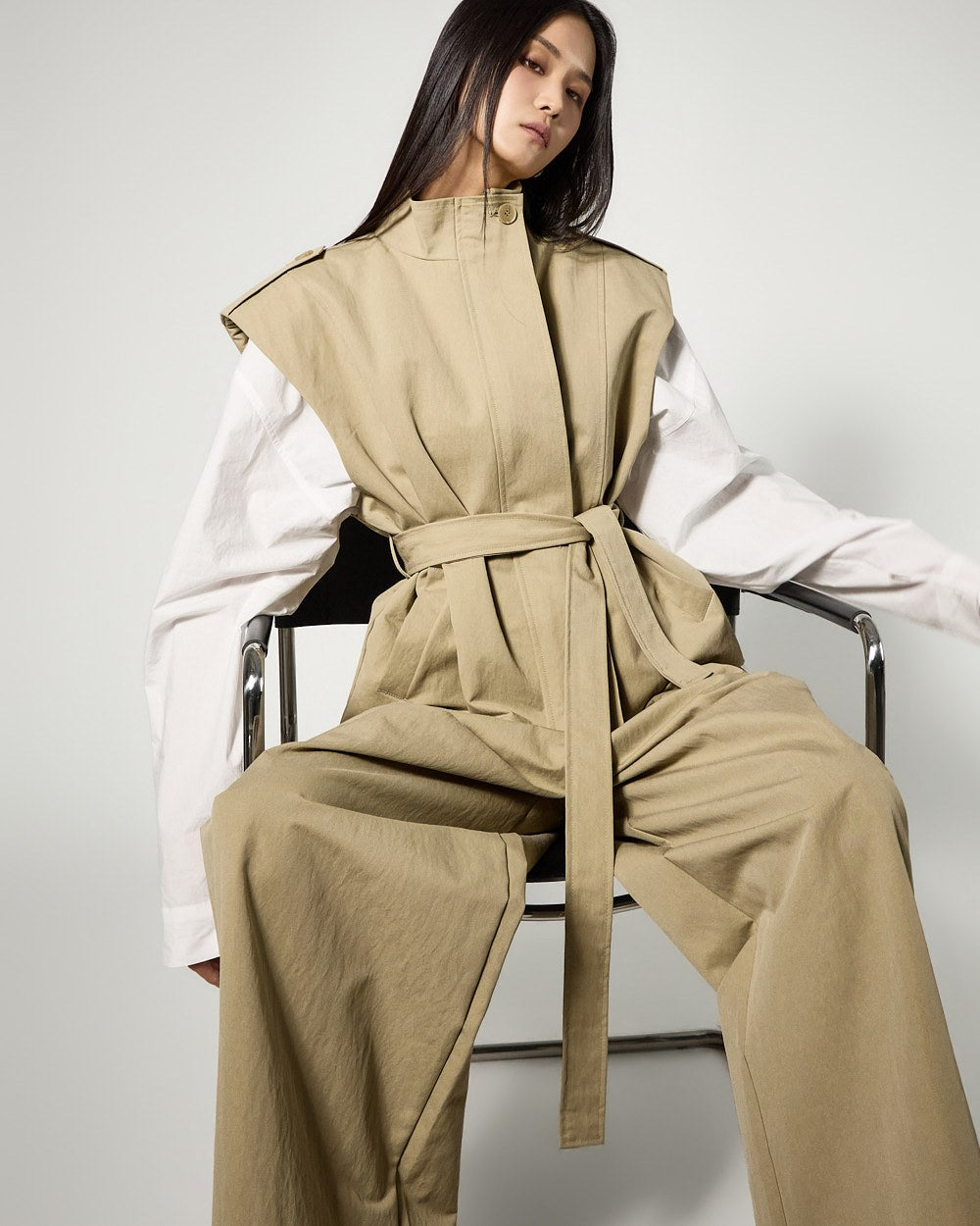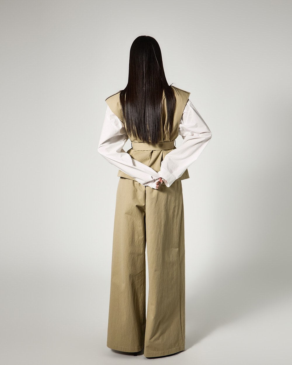 This is a vest and wide-leg pants set with a masculine vibe.