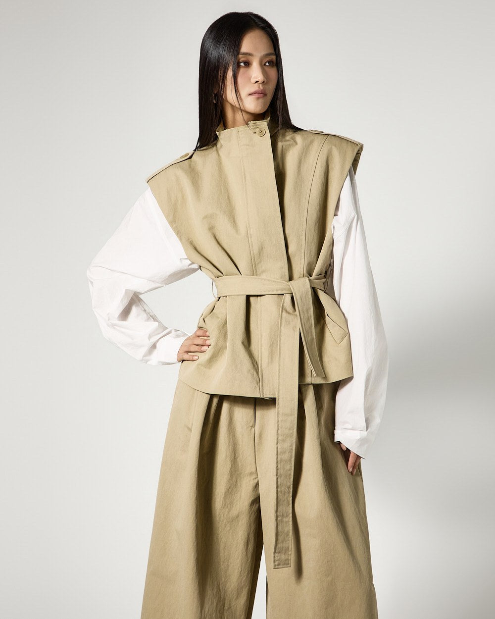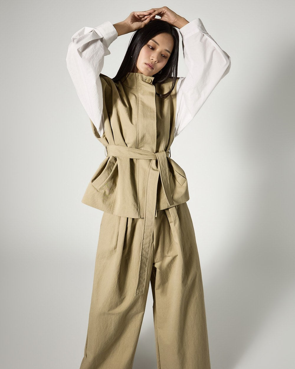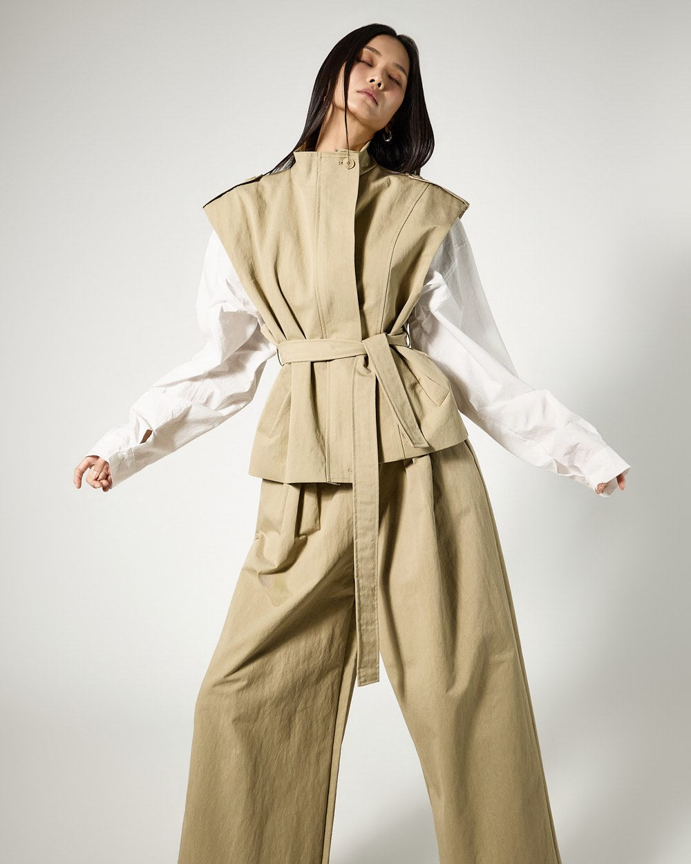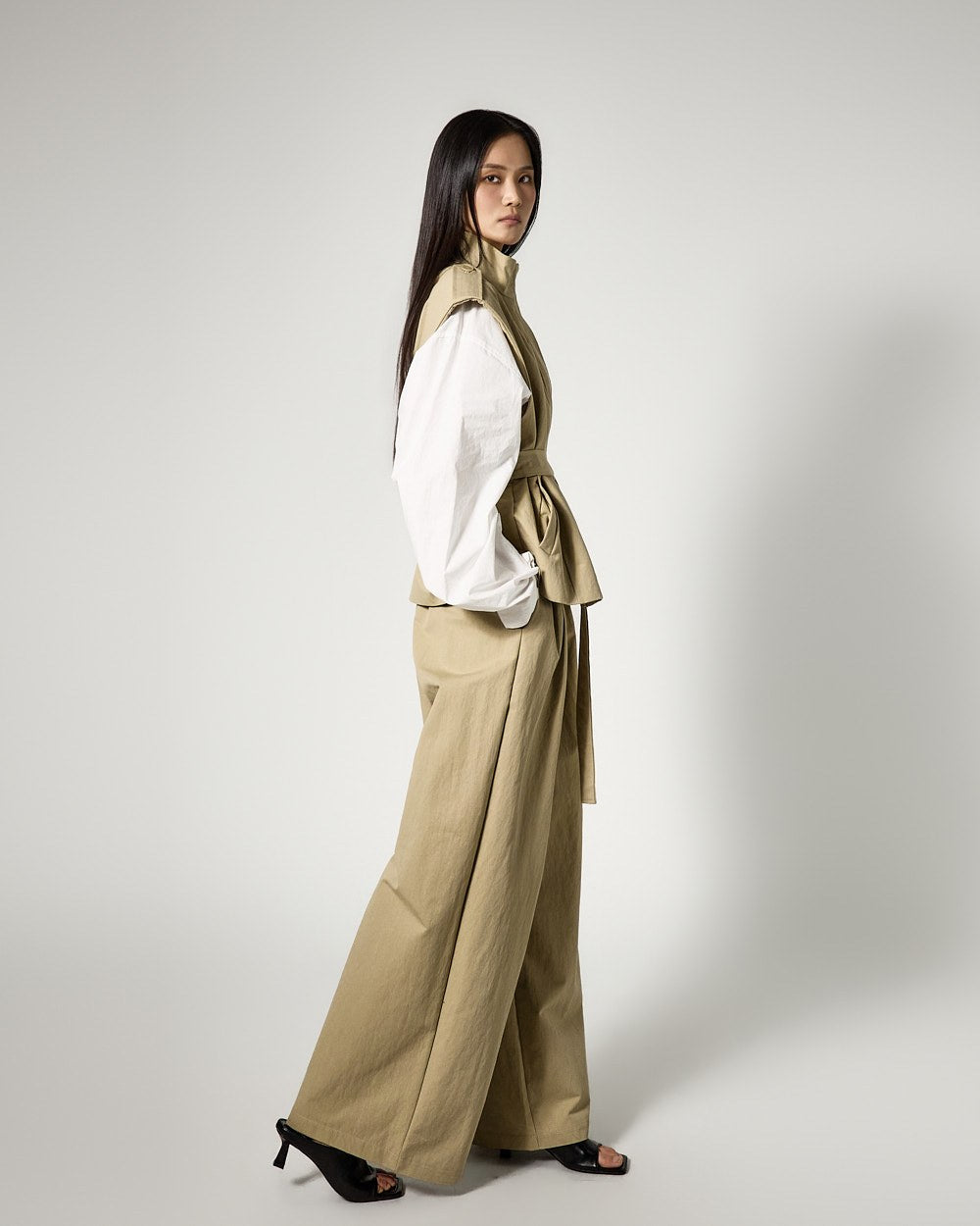 This is a vest and wide-leg pants set with a masculine vibe.