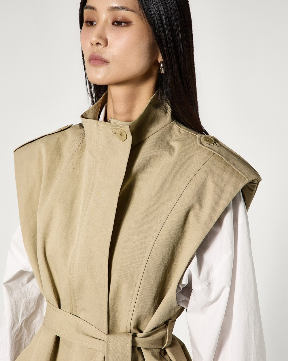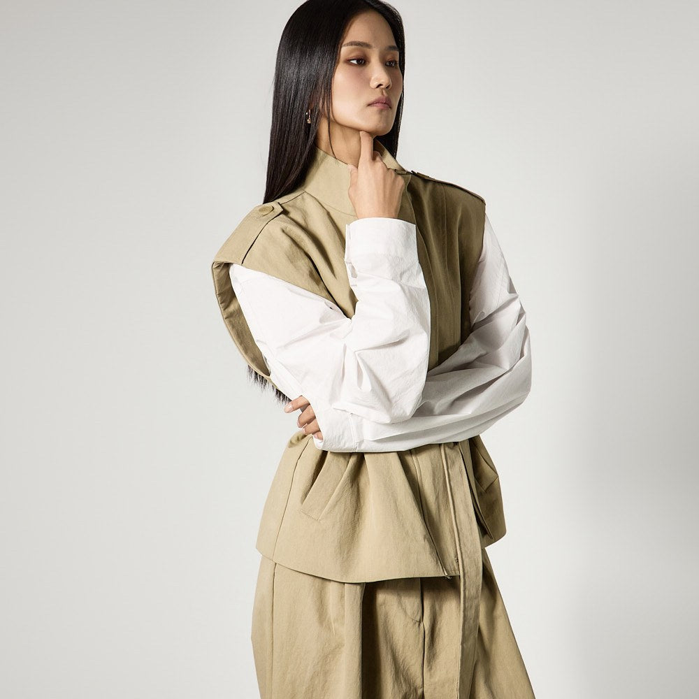 The vest features a mock-high neck design that adds a neat mood,