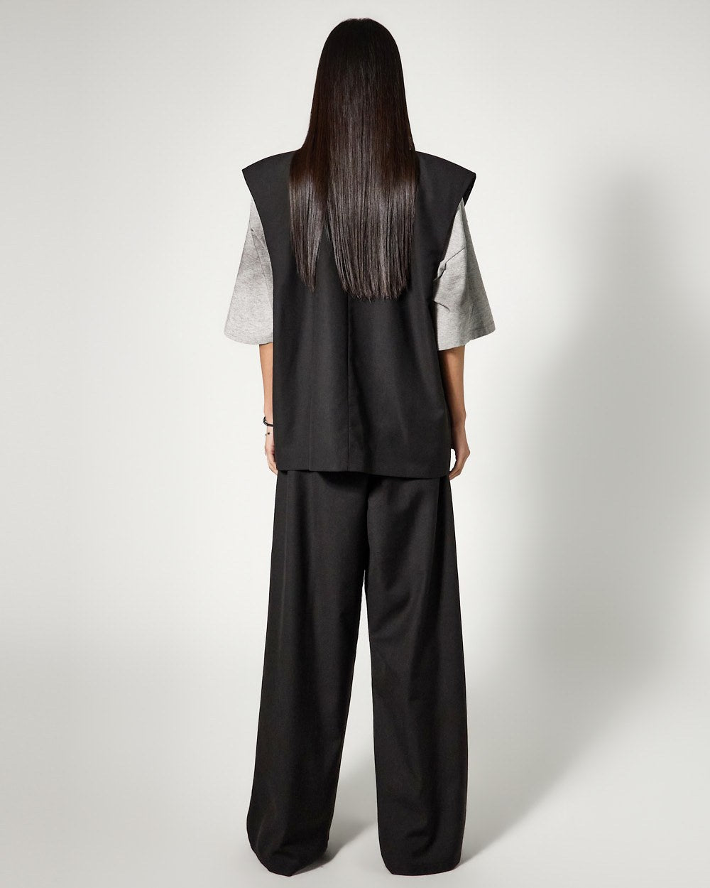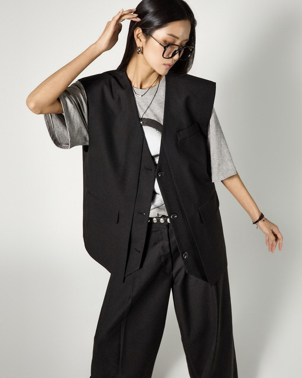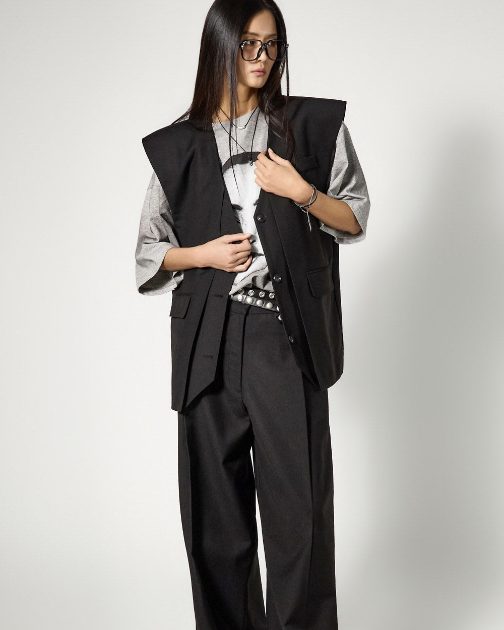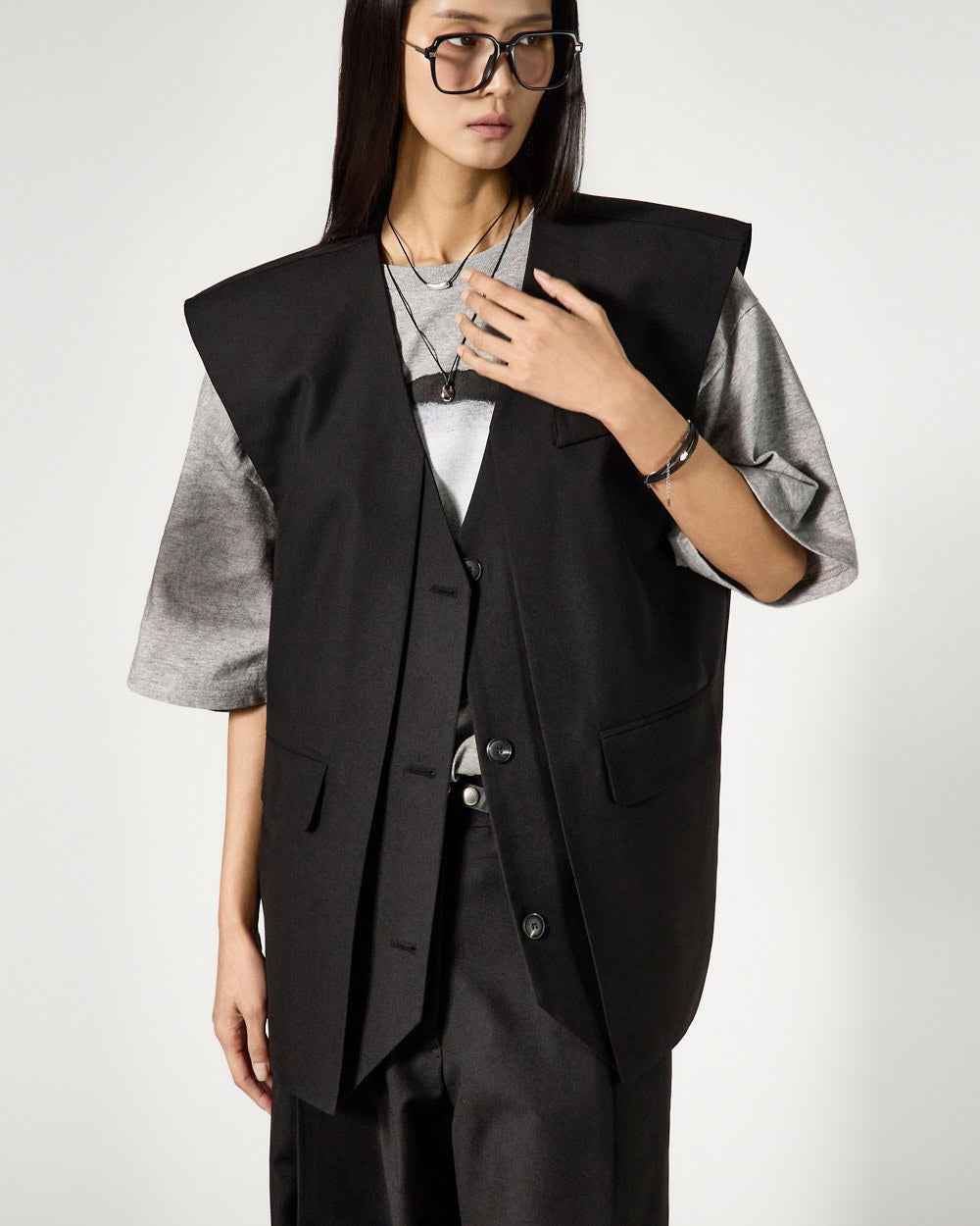 The vest features an oversized silhouette and clean tailored lines,