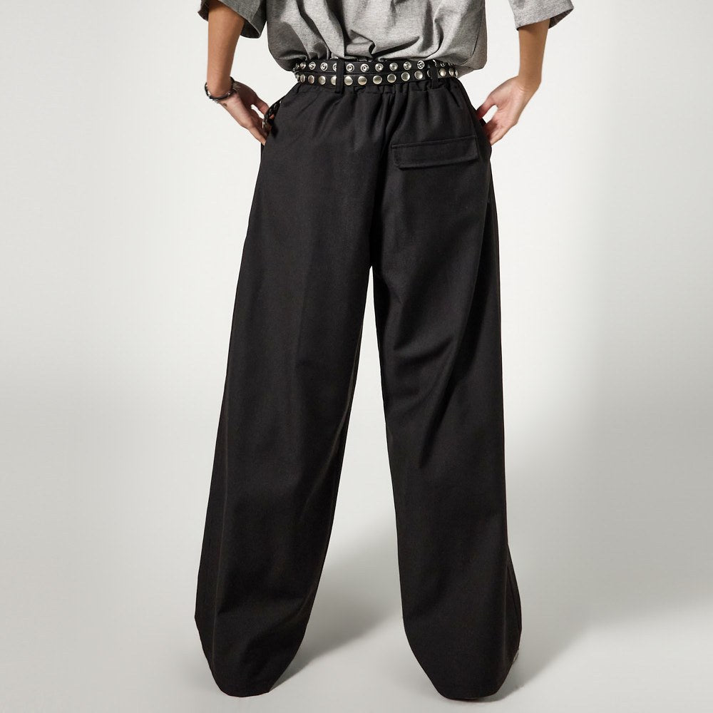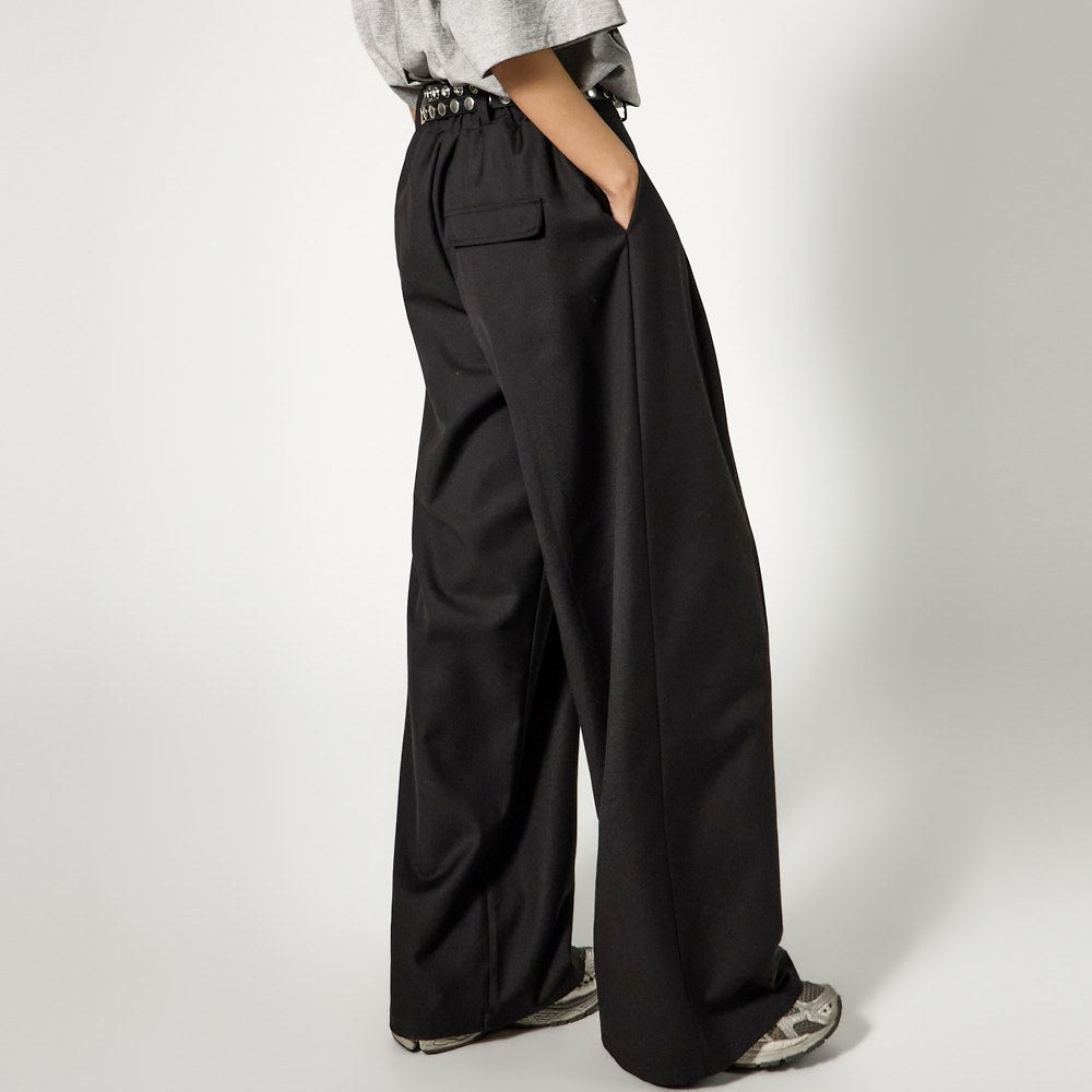 The pants feature a loose wide fit and double-pleat details,