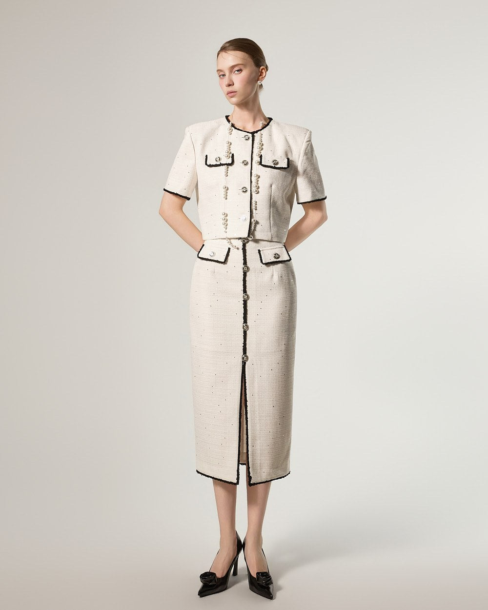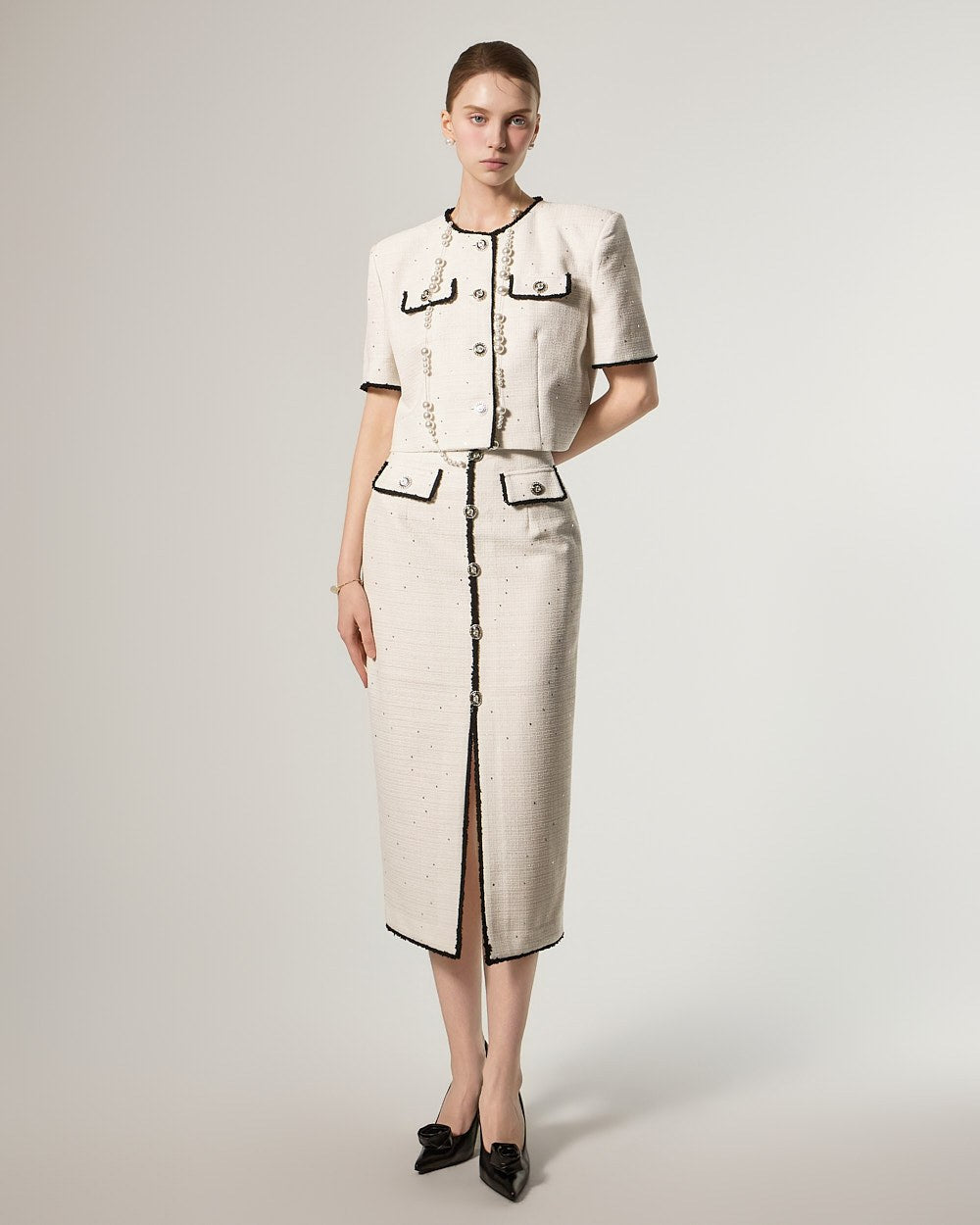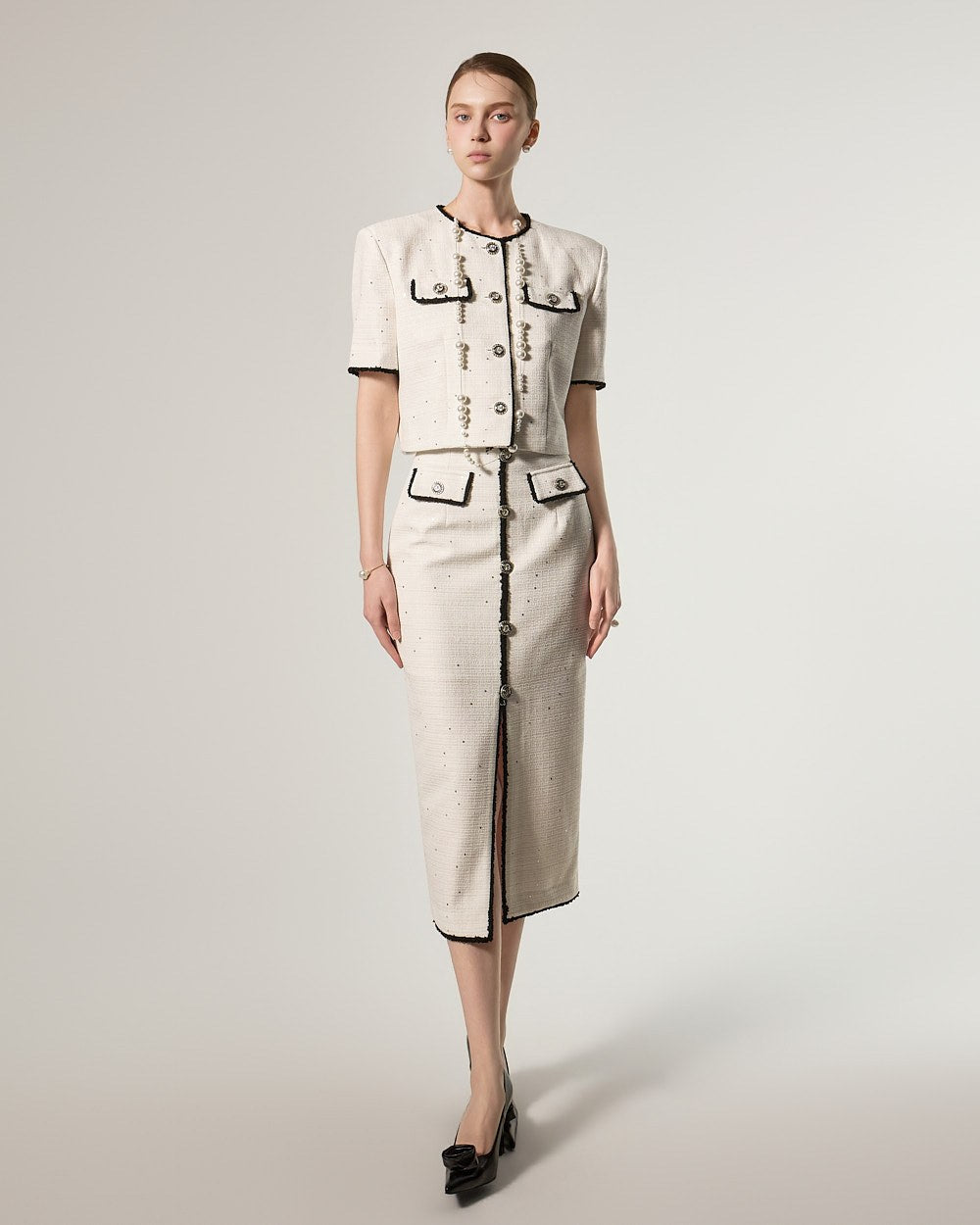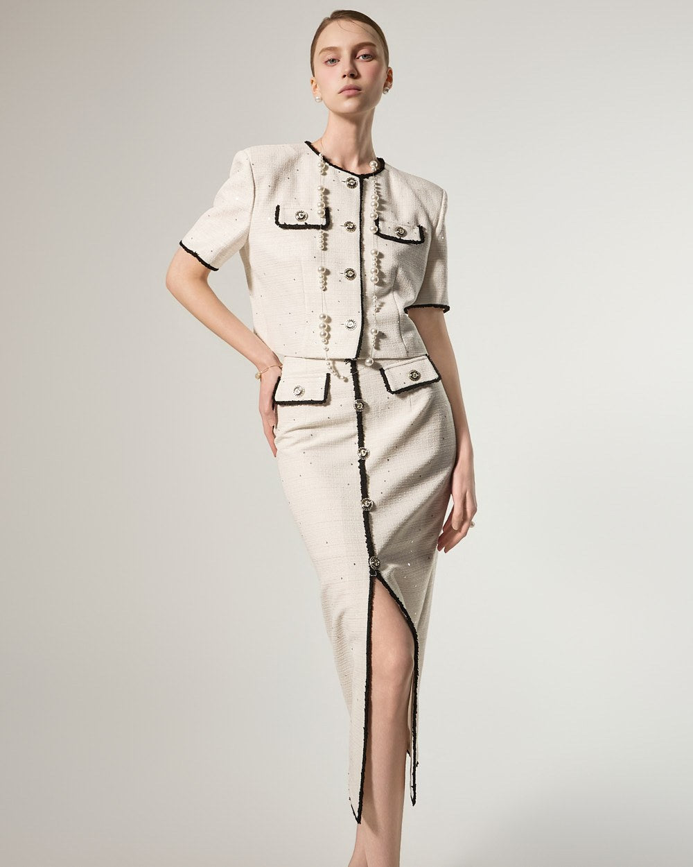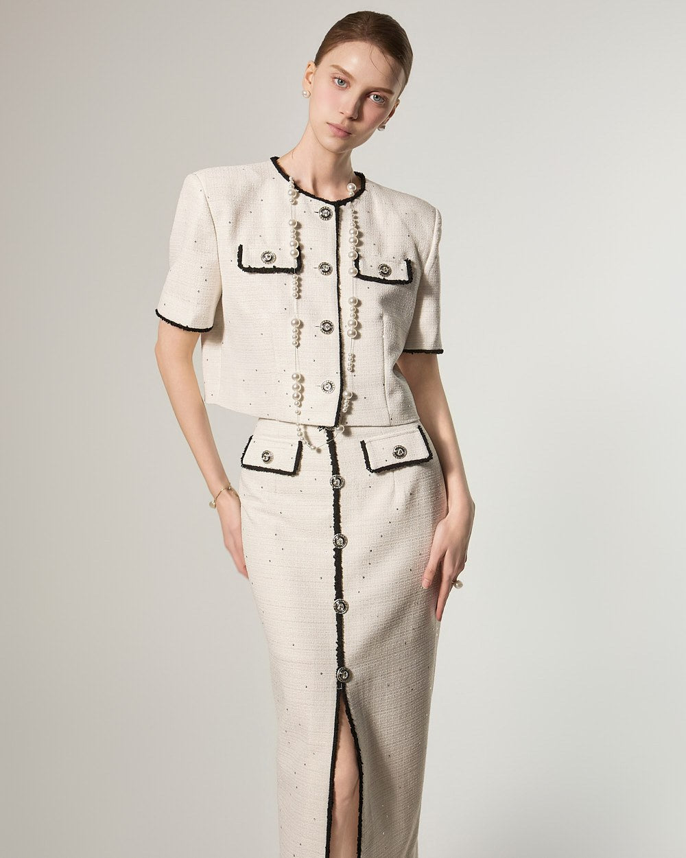 这是一款充满优雅气质的粗花呢套装。