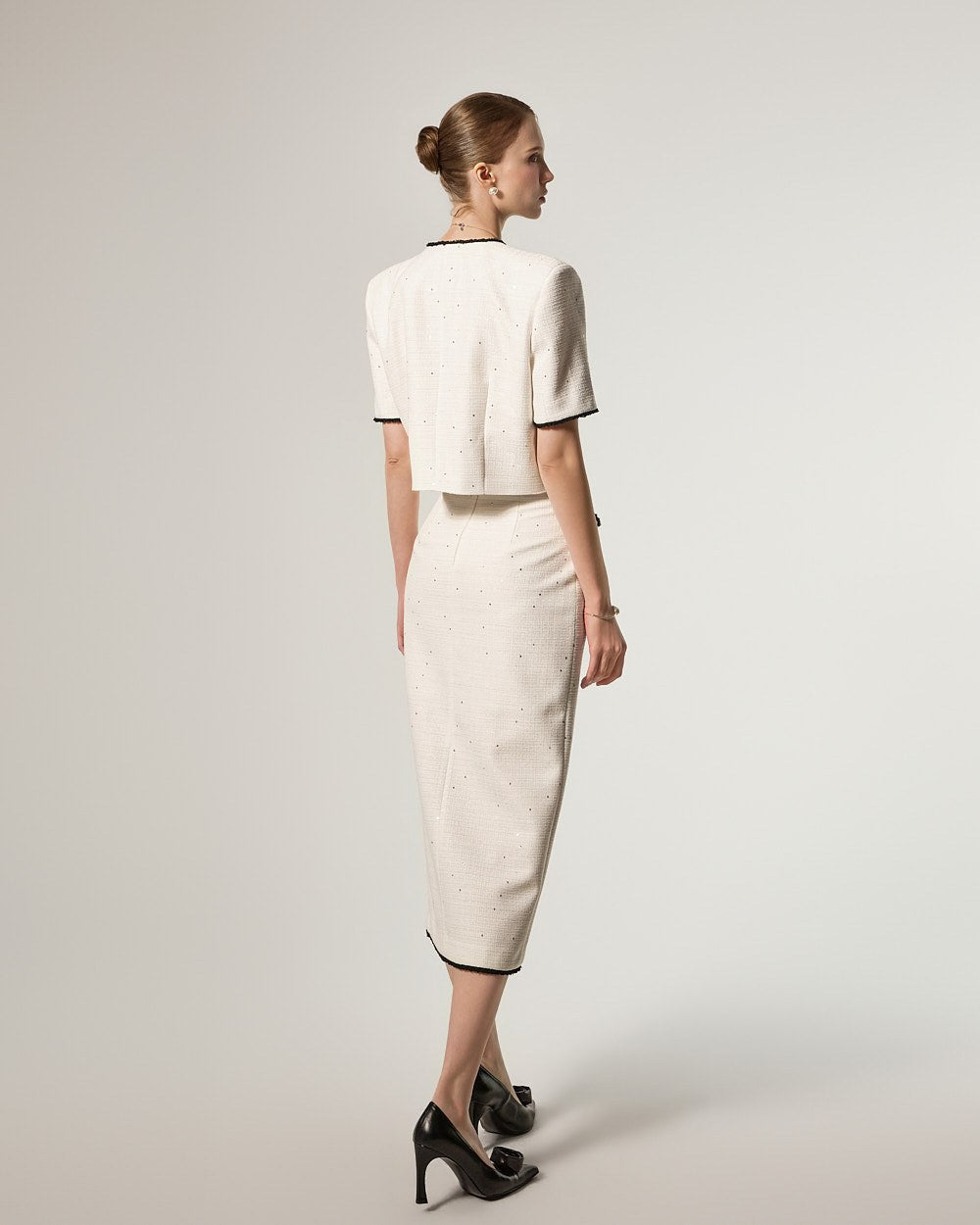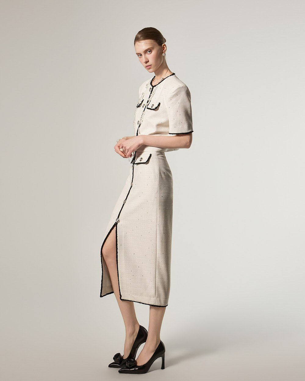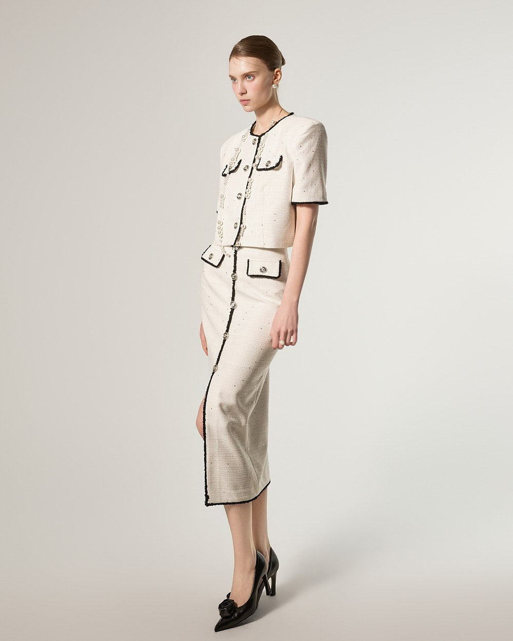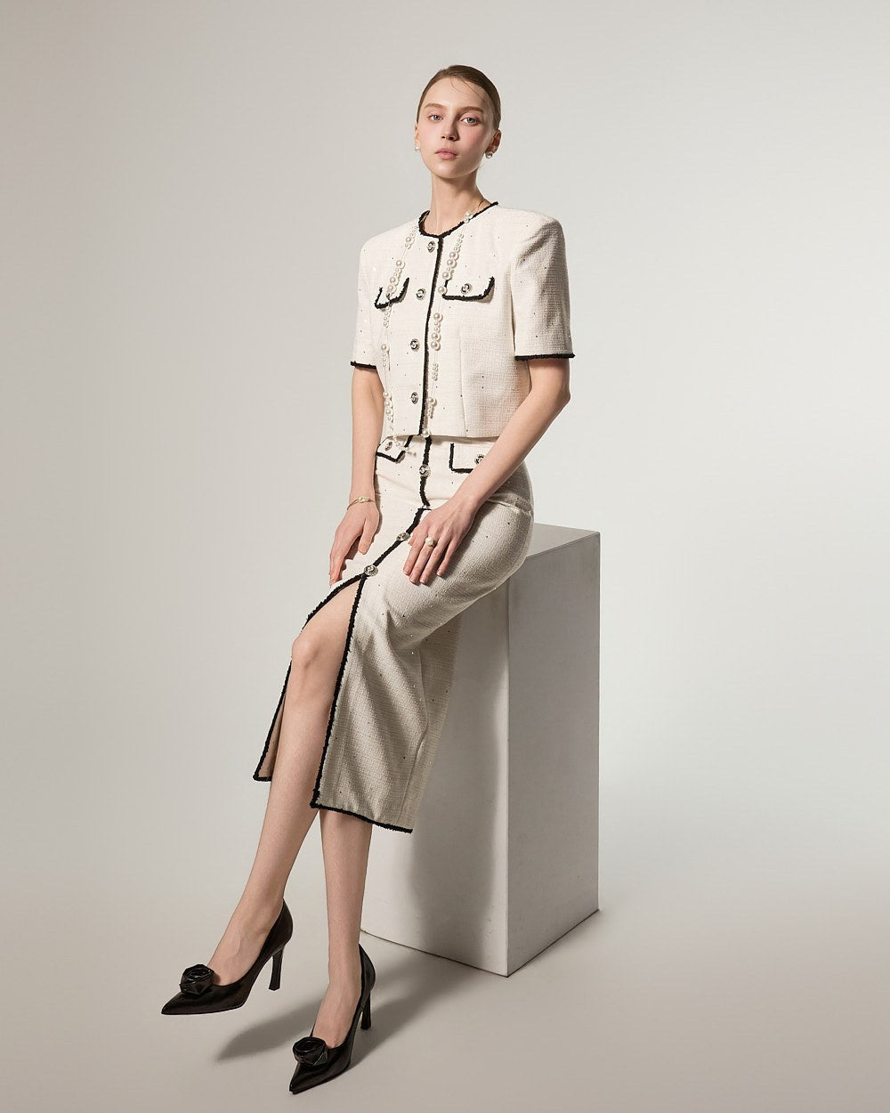 这是一款充满优雅气质的粗花呢套装。