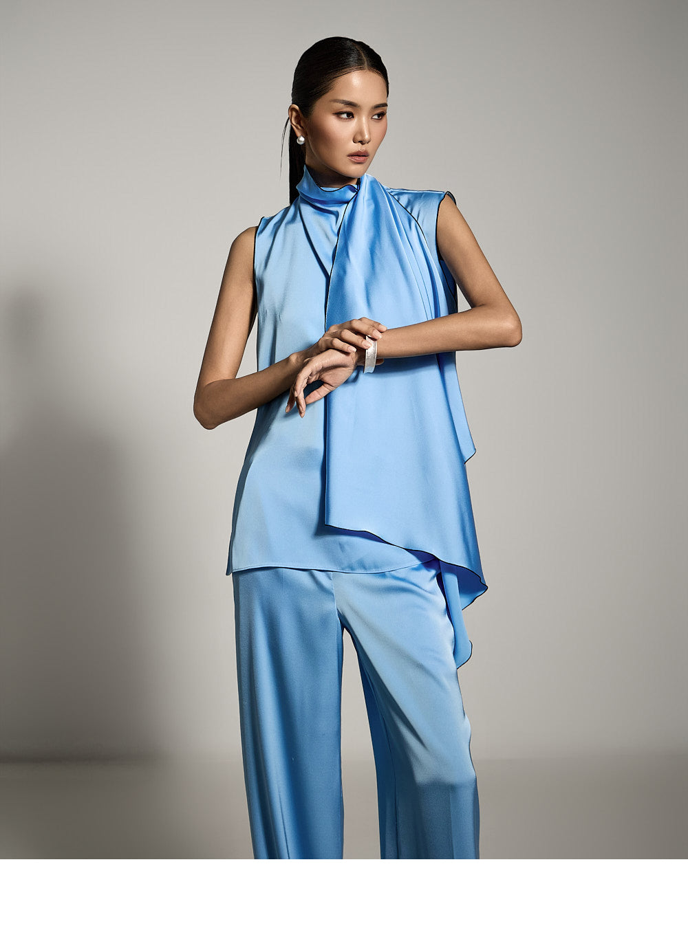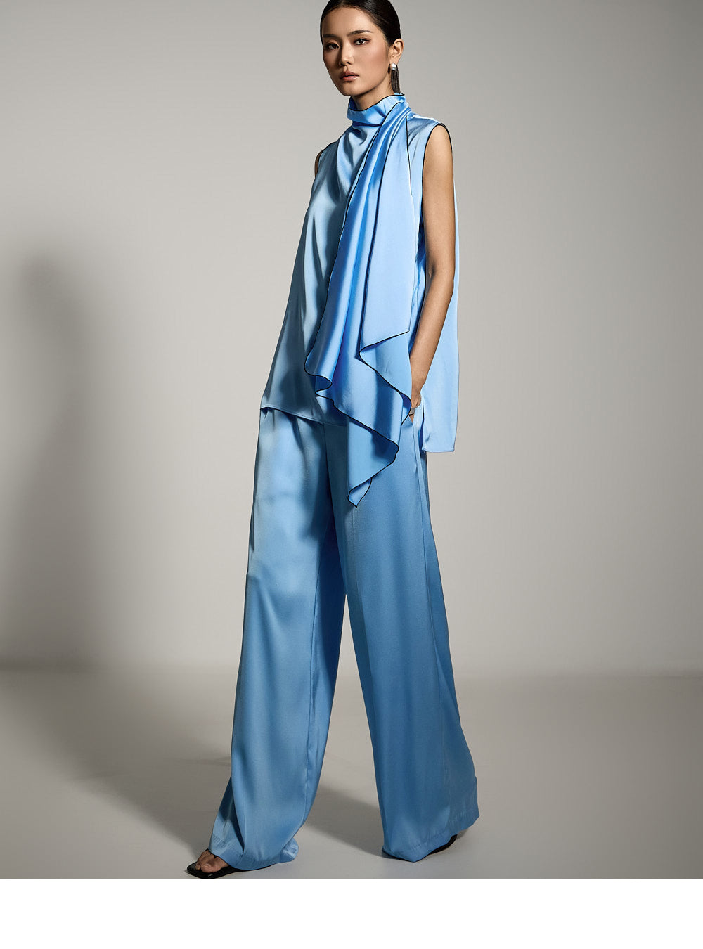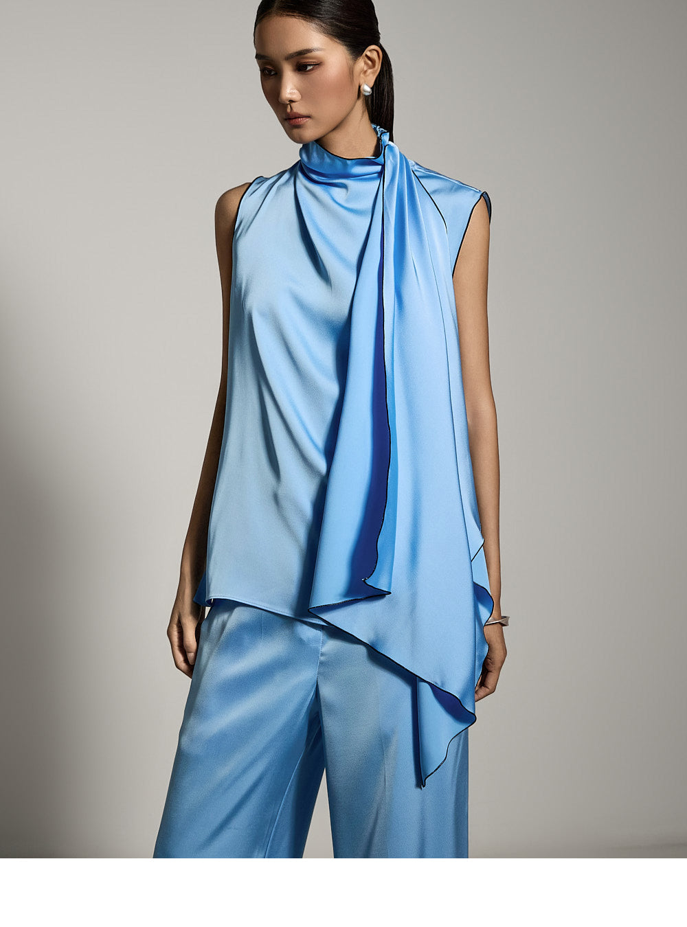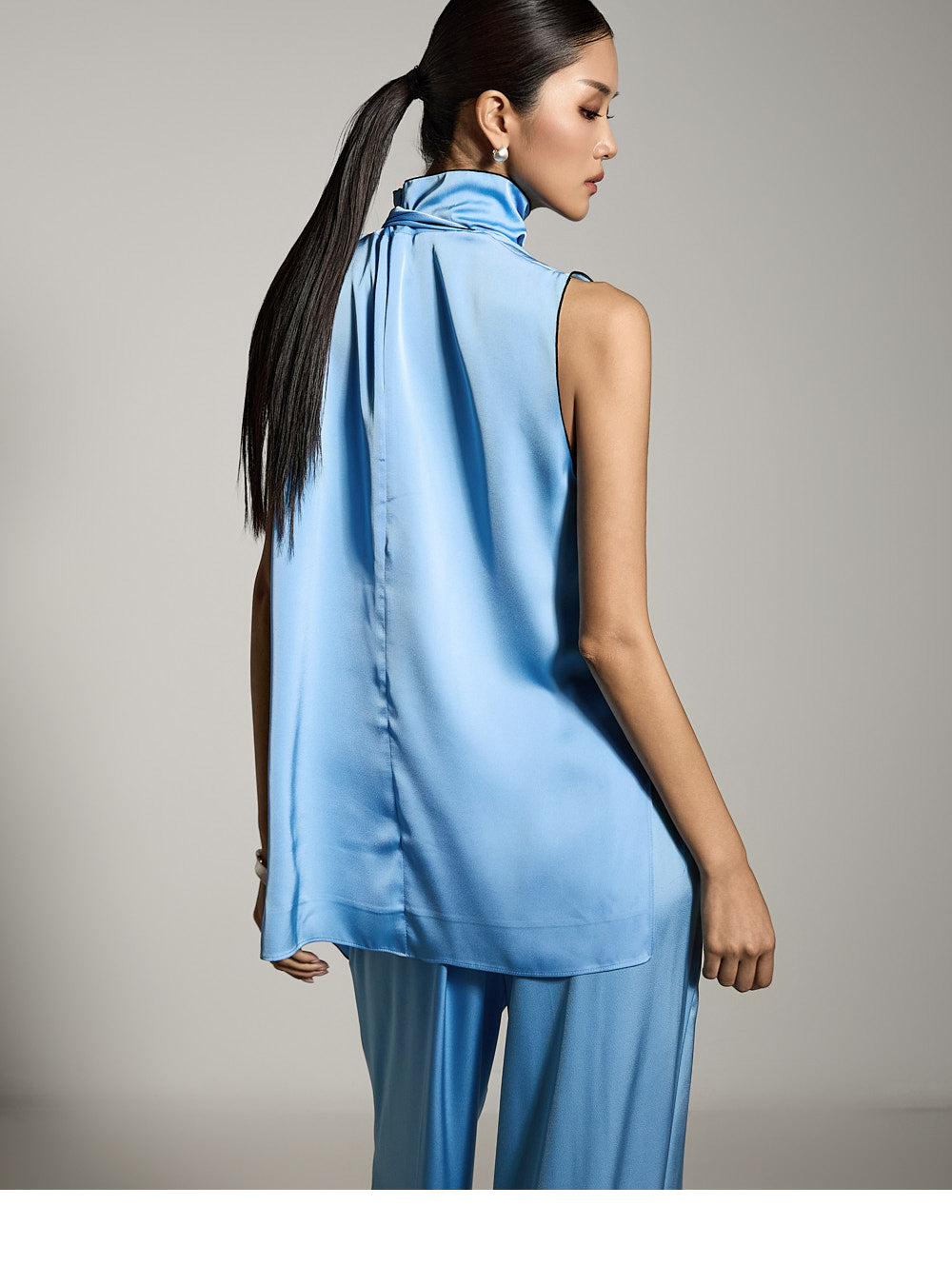 模特身高 173 厘米,穿着天蓝色均码服装。