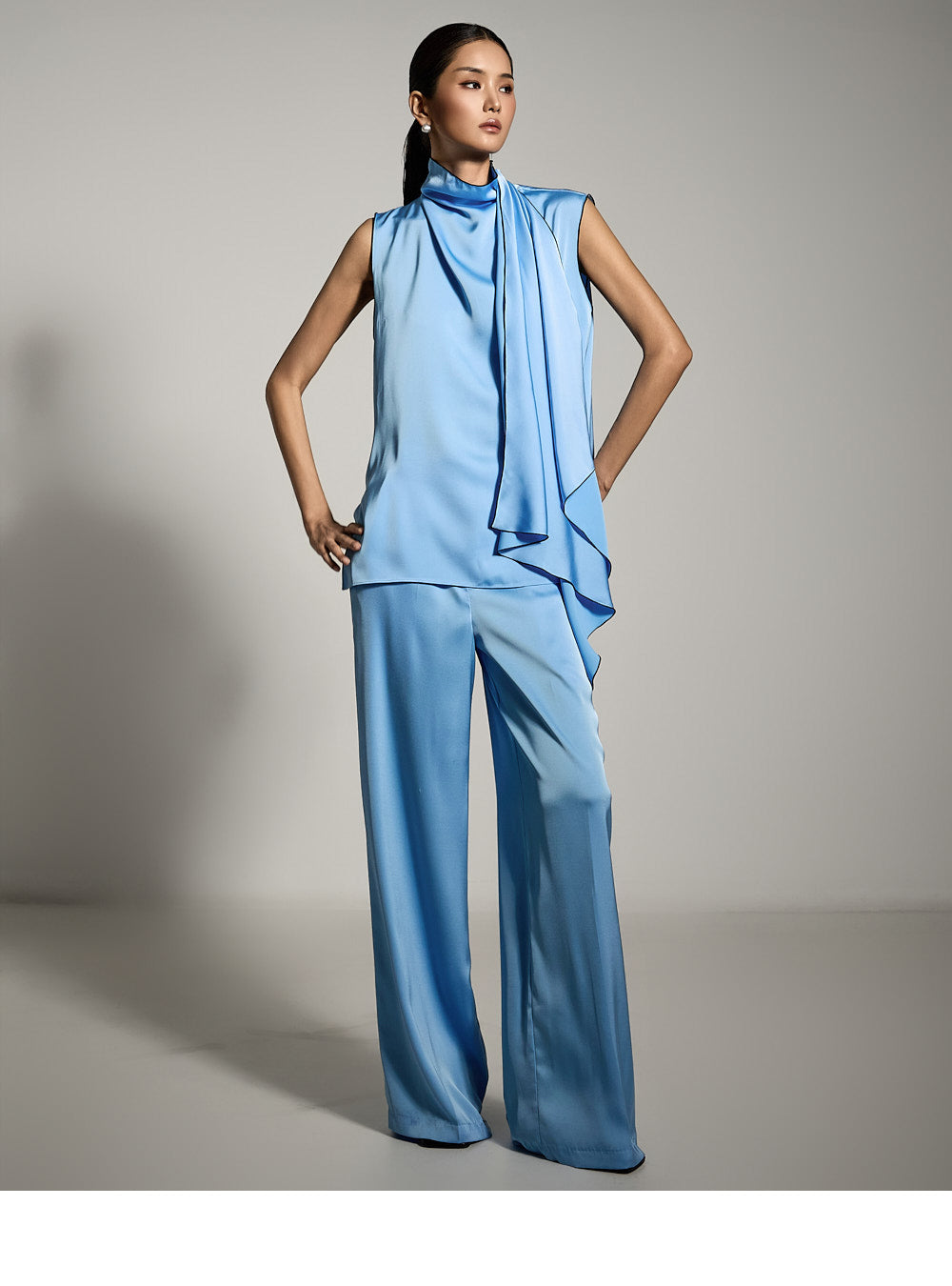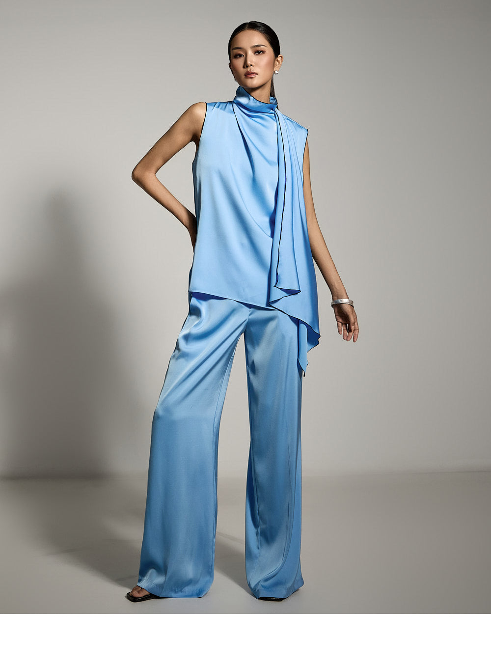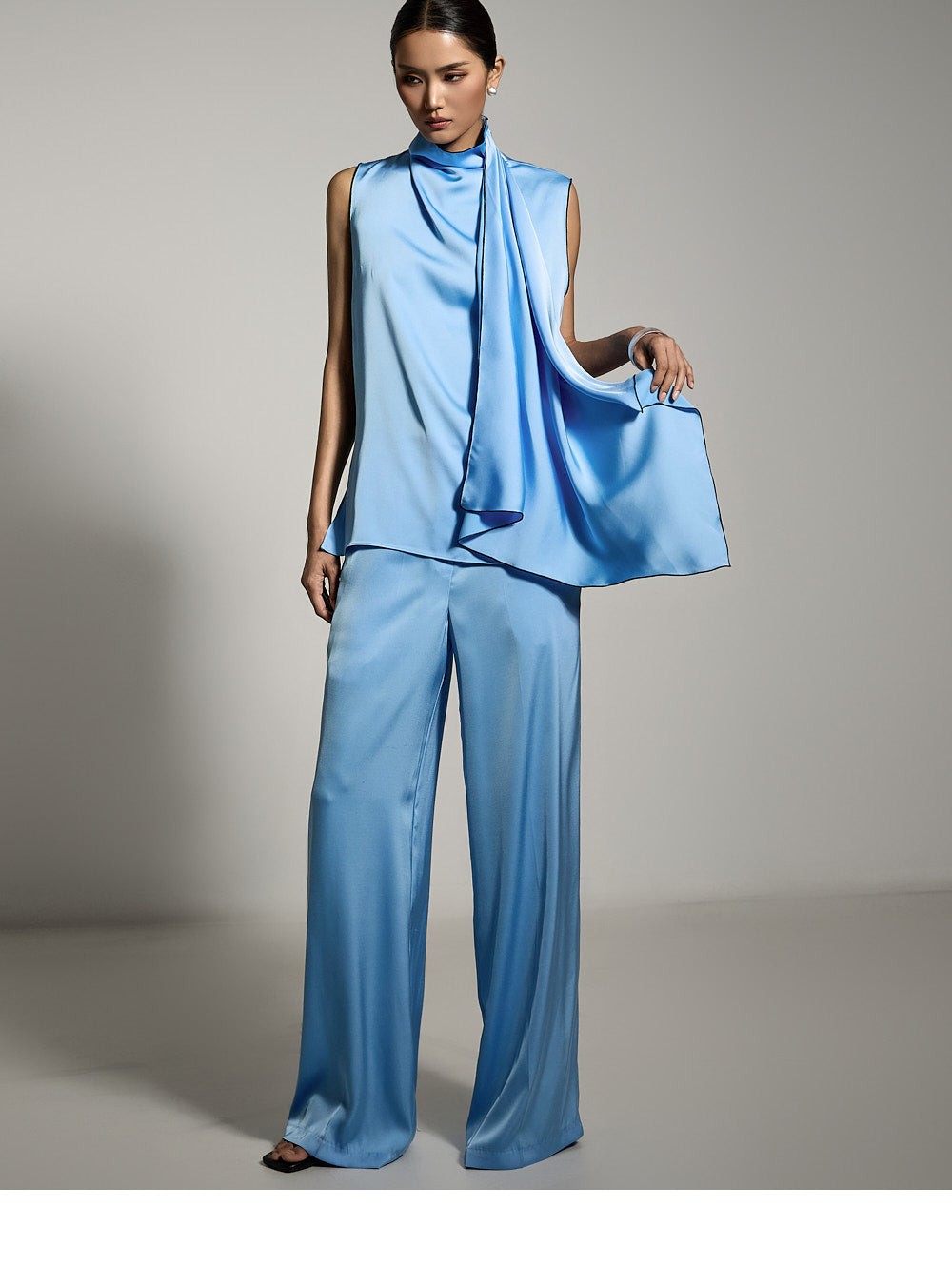 模特身高 173 厘米,穿着天蓝色均码服装。